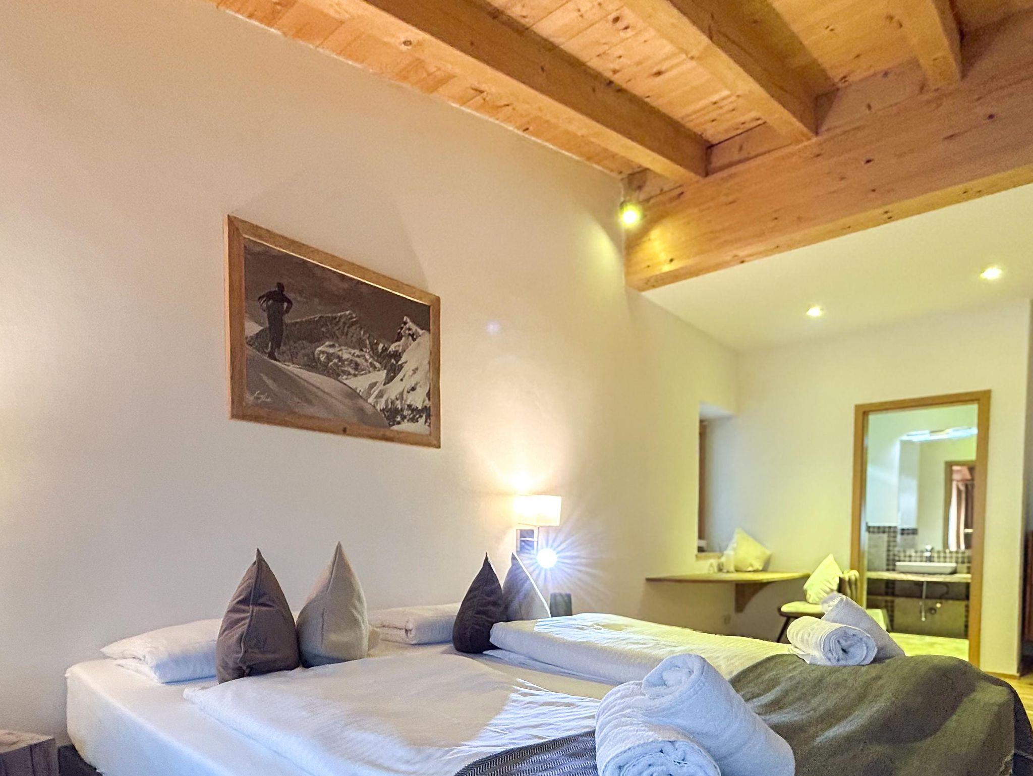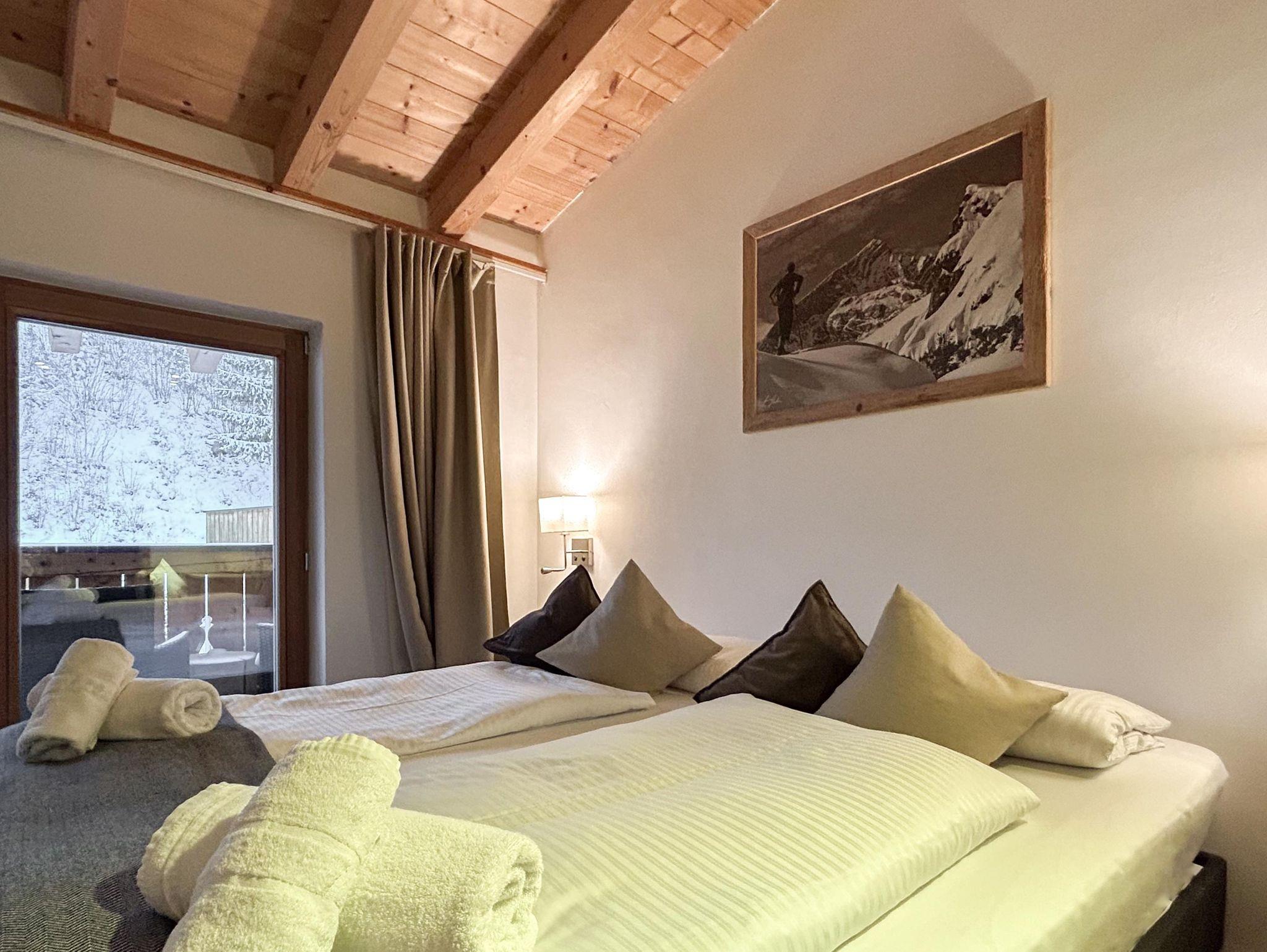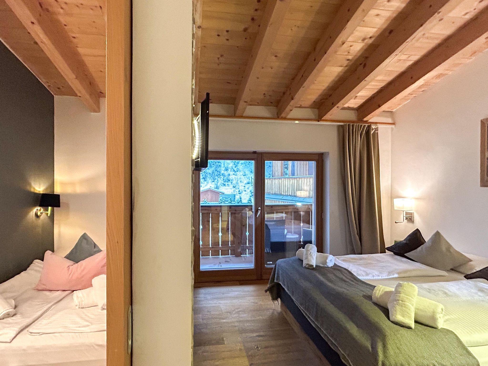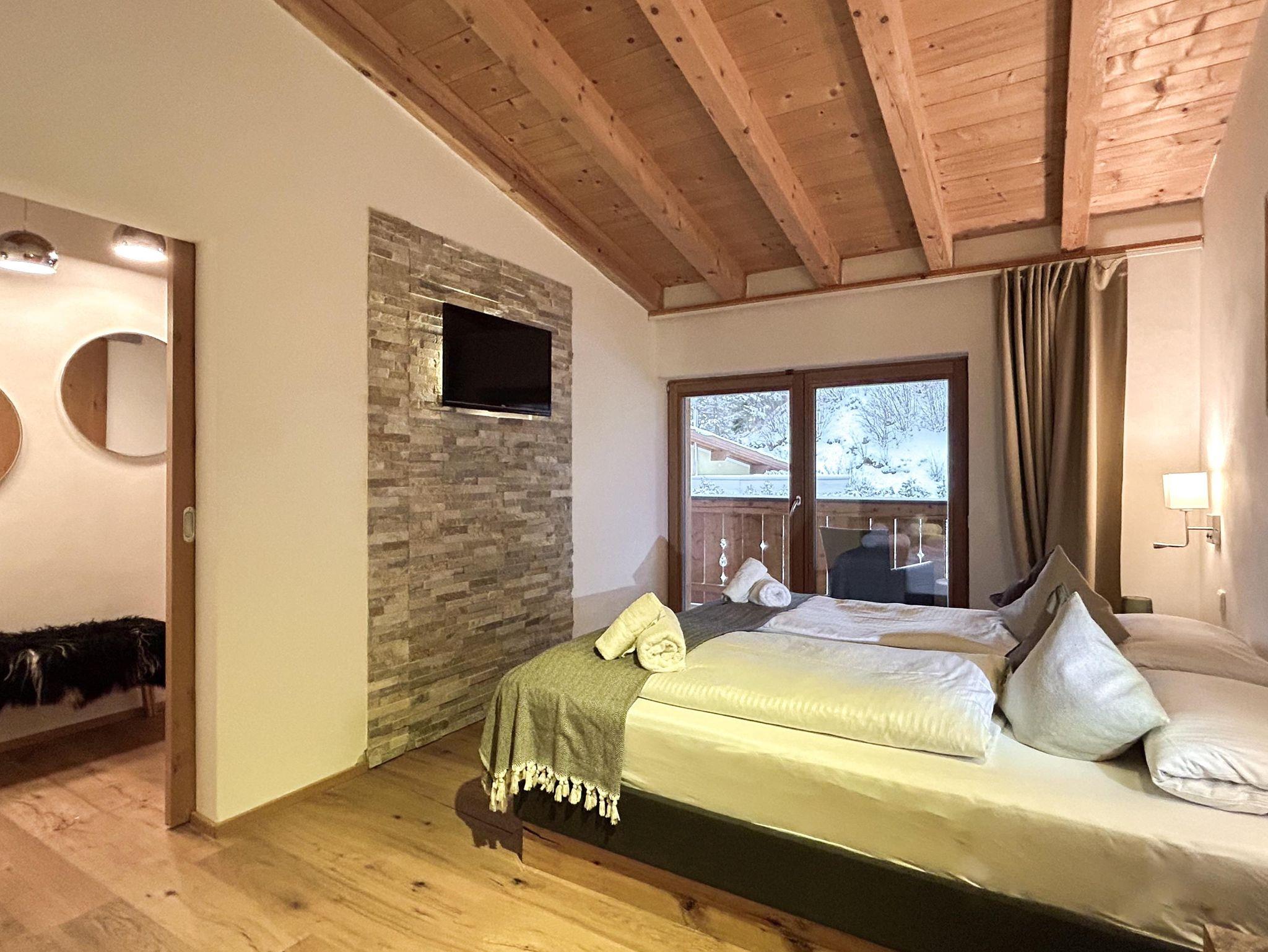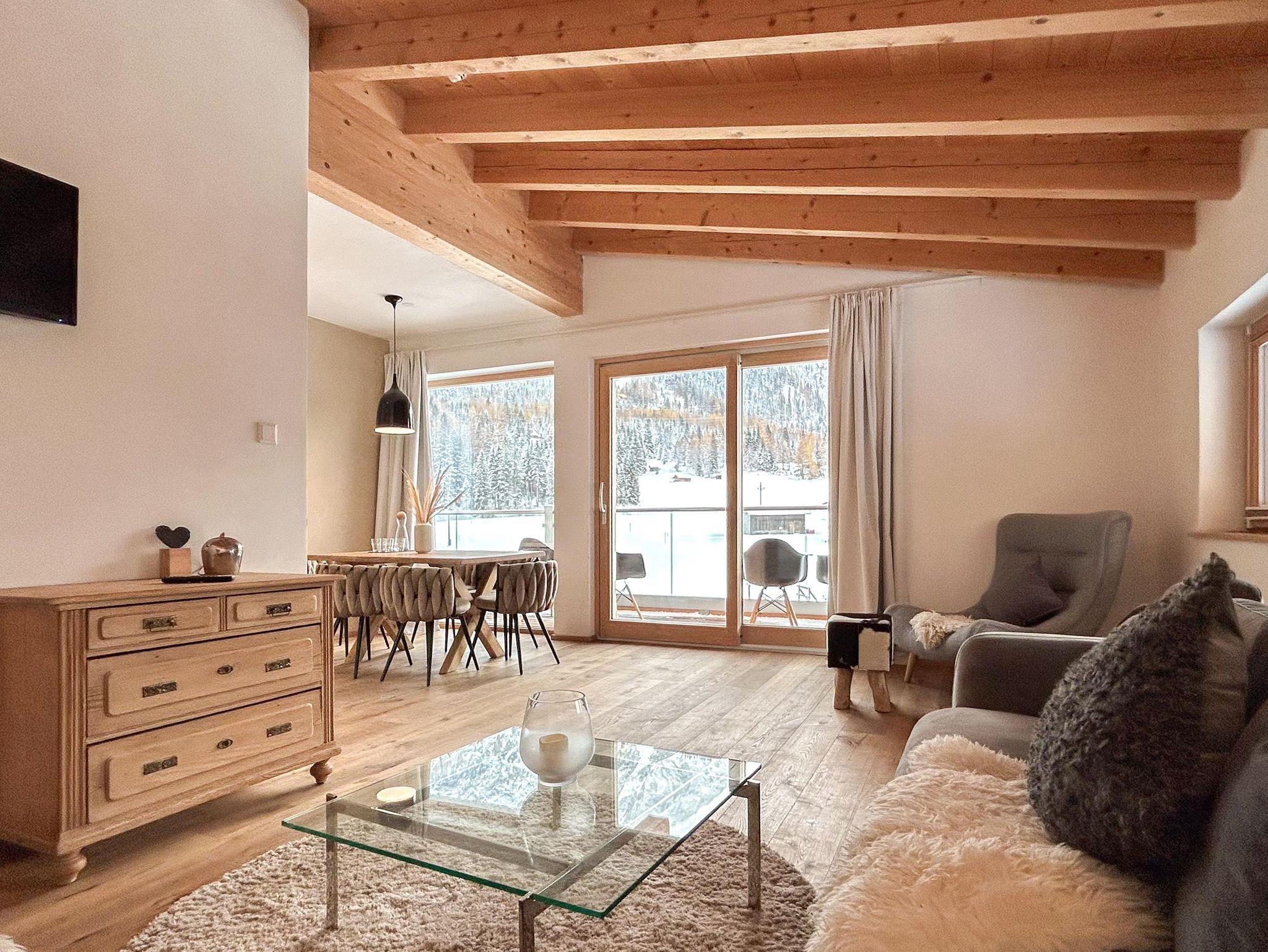 Familienfreundliches Apartment mit großem Schlafzimmer und eigenem Bad sowie zwei kleineren Schlafzimmern. Ein zusätzliches Bad mit WC und Dusche bietet extra Komfort. Der helle Wohn-Essbereich mit voll ausgestatteter Küche, Sofaecke und Esstisch öffnet sich zum Balkon mit herrlichem Bergpanorama. Perfekt für Familien, die Entspannung und alpine Erlebnisse kombinieren möchten.
