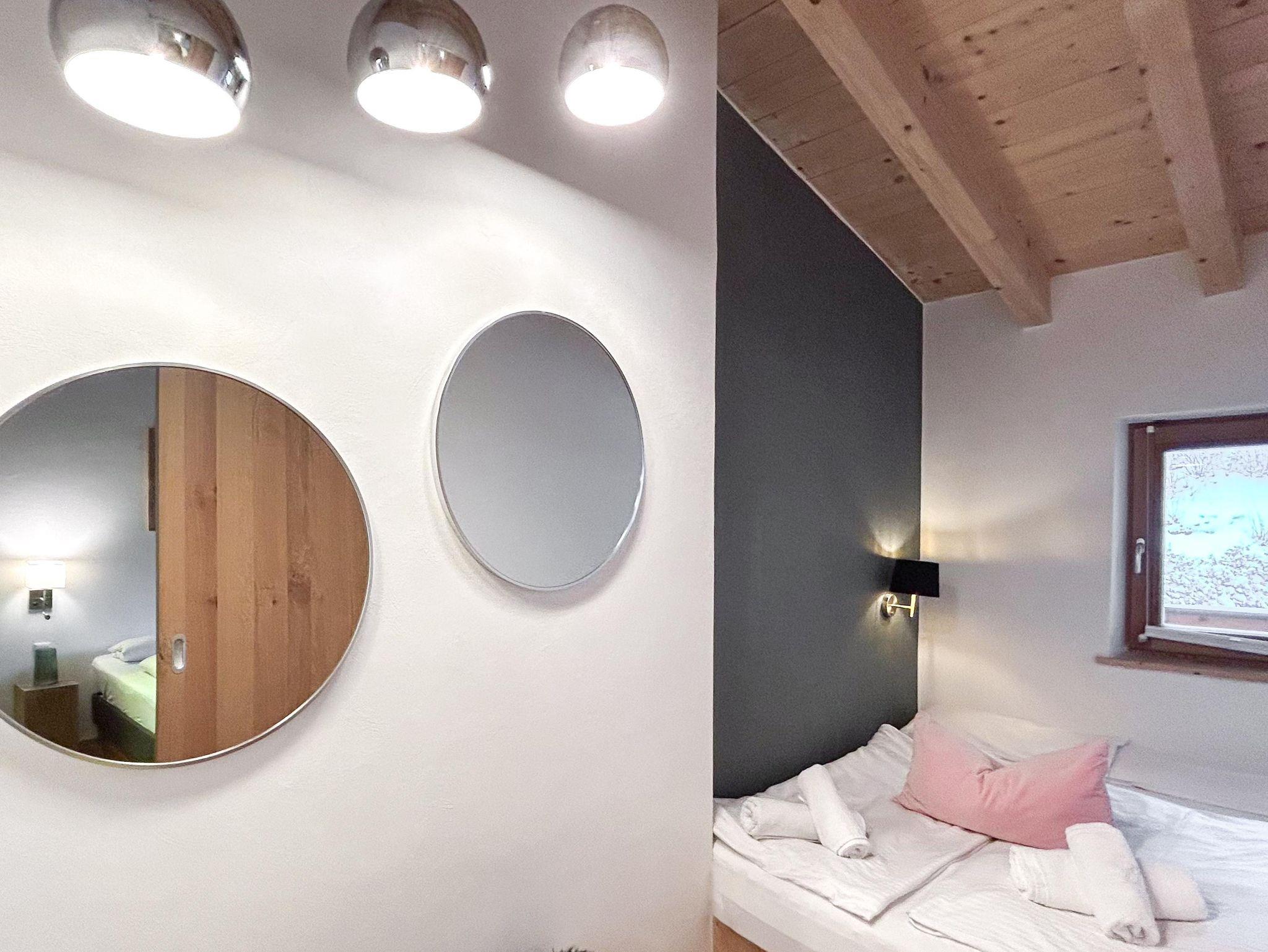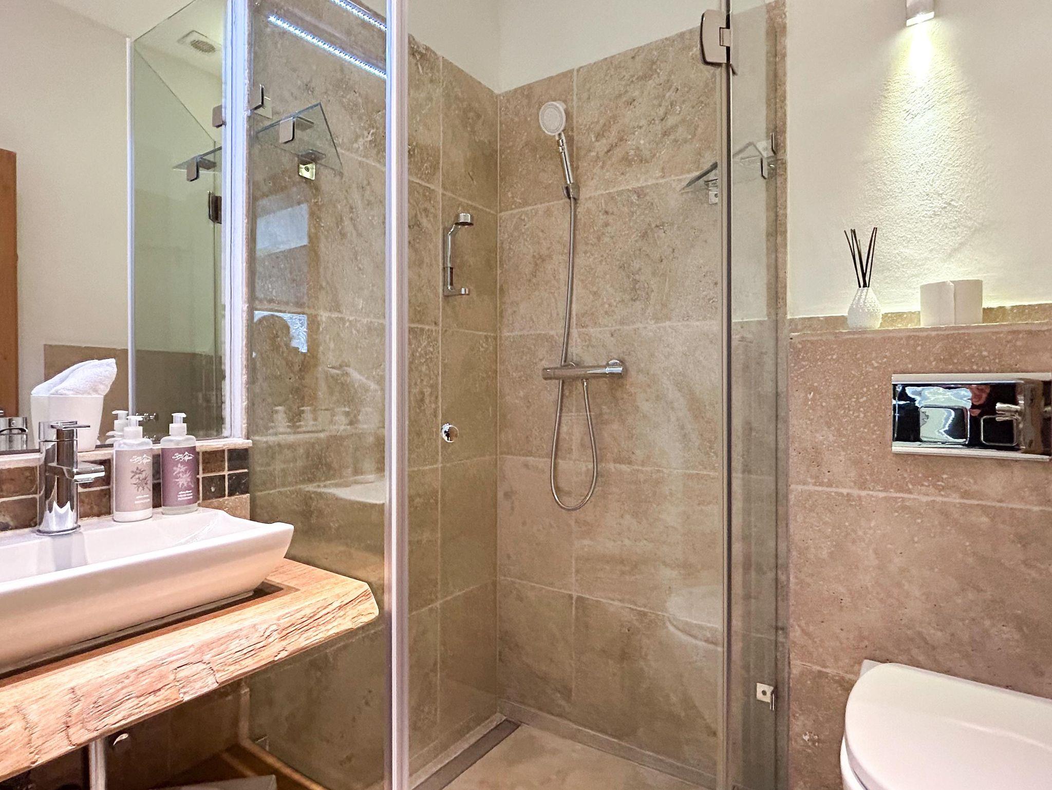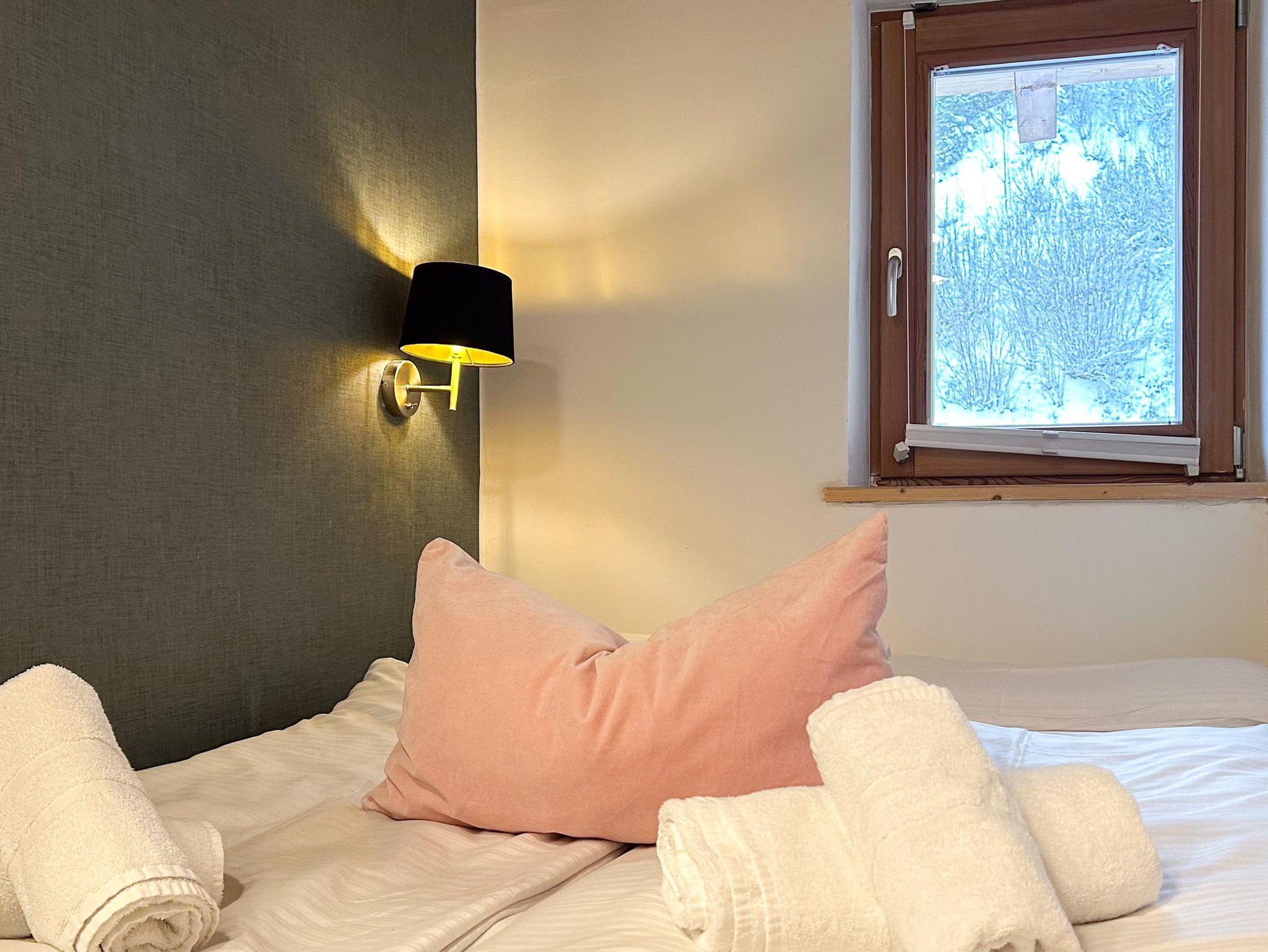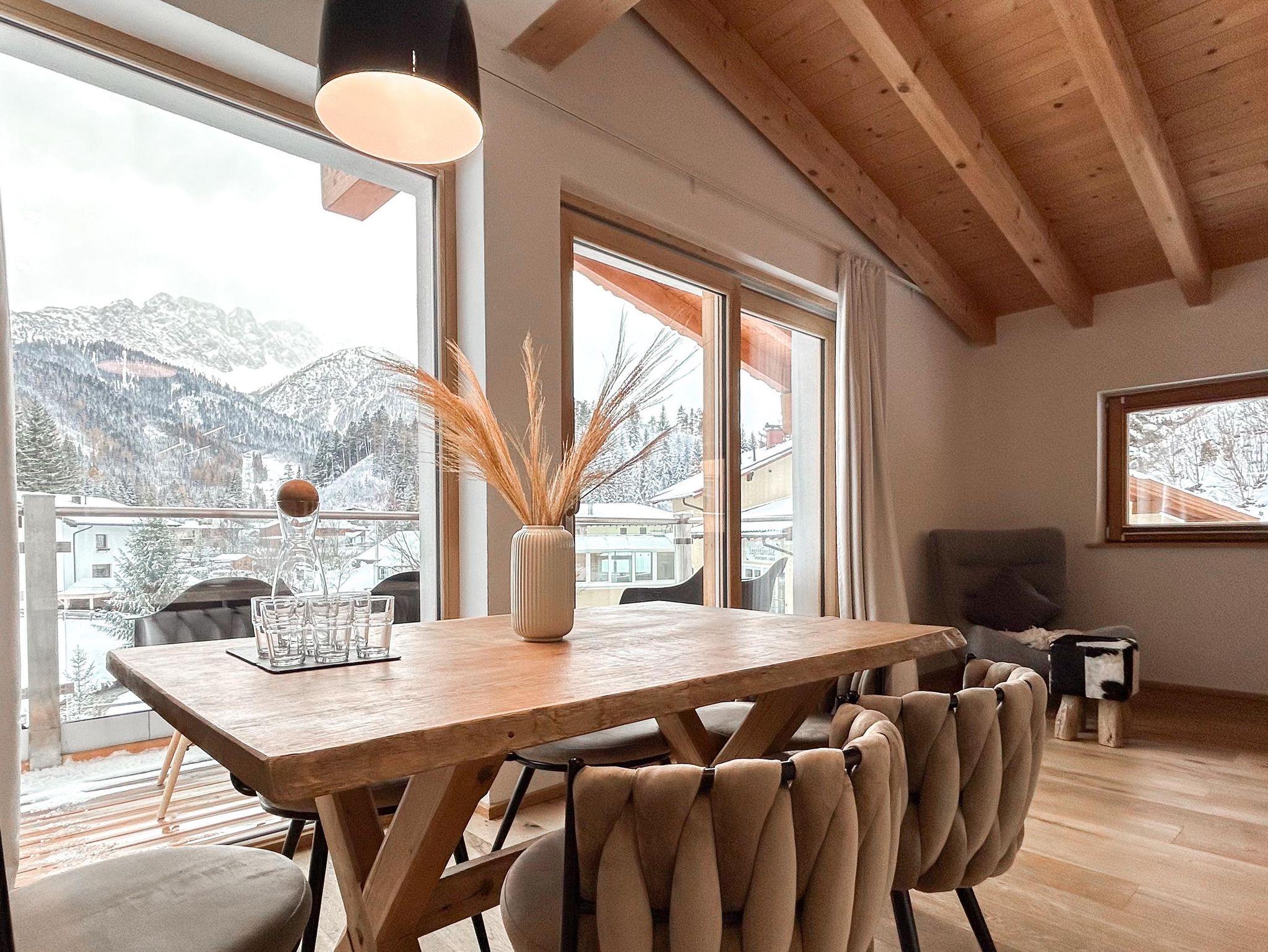 Familienfreundliches Apartment mit großem Schlafzimmer und eigenem Bad sowie zwei kleineren Schlafzimmern. Ein zusätzliches Bad mit WC und Dusche bietet extra Komfort. Der helle Wohn-Essbereich mit voll ausgestatteter Küche, Sofaecke und Esstisch öffnet sich zum Balkon mit herrlichem Bergpanorama. Perfekt für Familien, die Entspannung und alpine Erlebnisse kombinieren möchten.