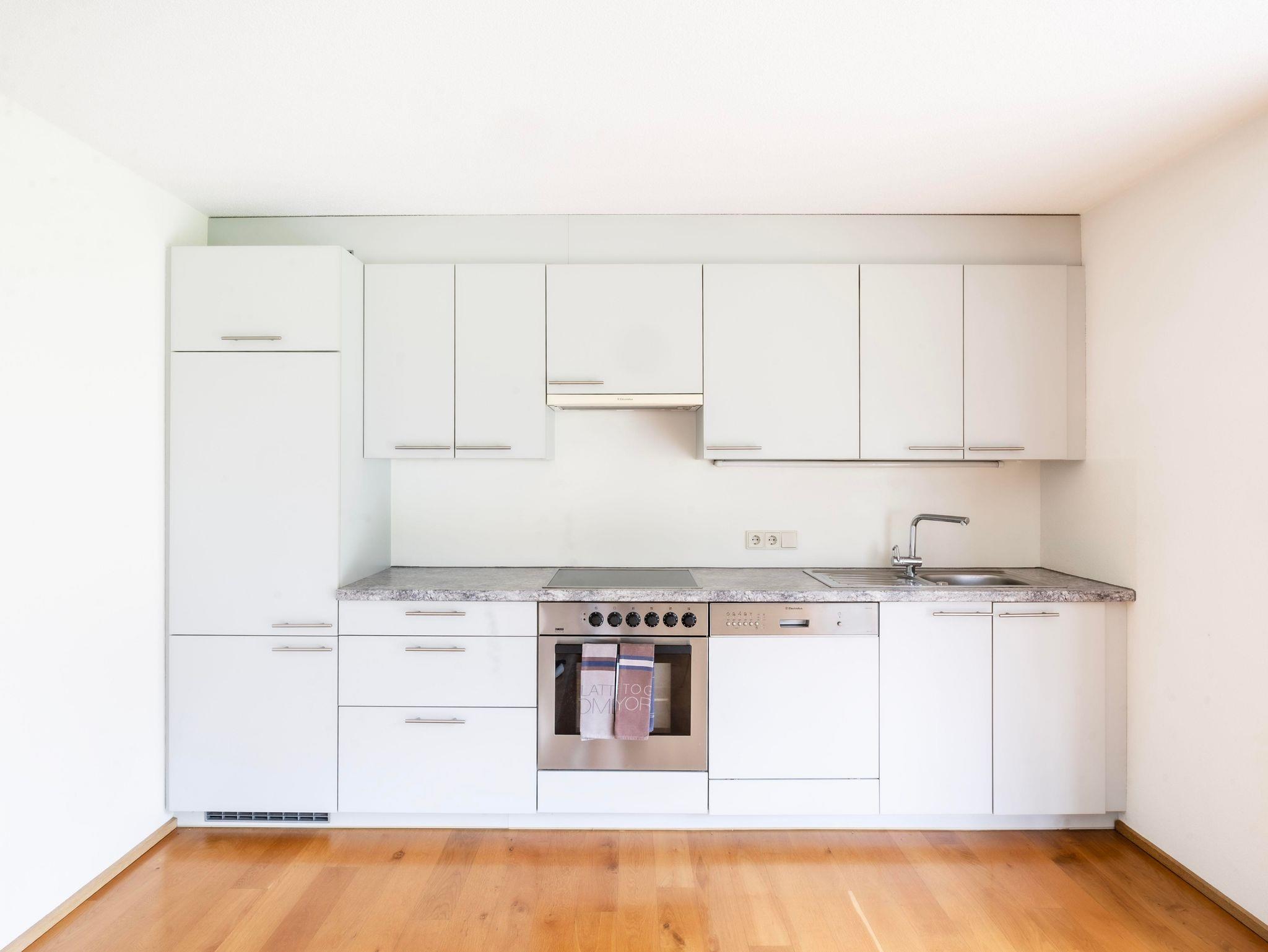 • Küchenzeile mit Kühlschrank, Elektroherd, Geschirrspüler und Backrohr