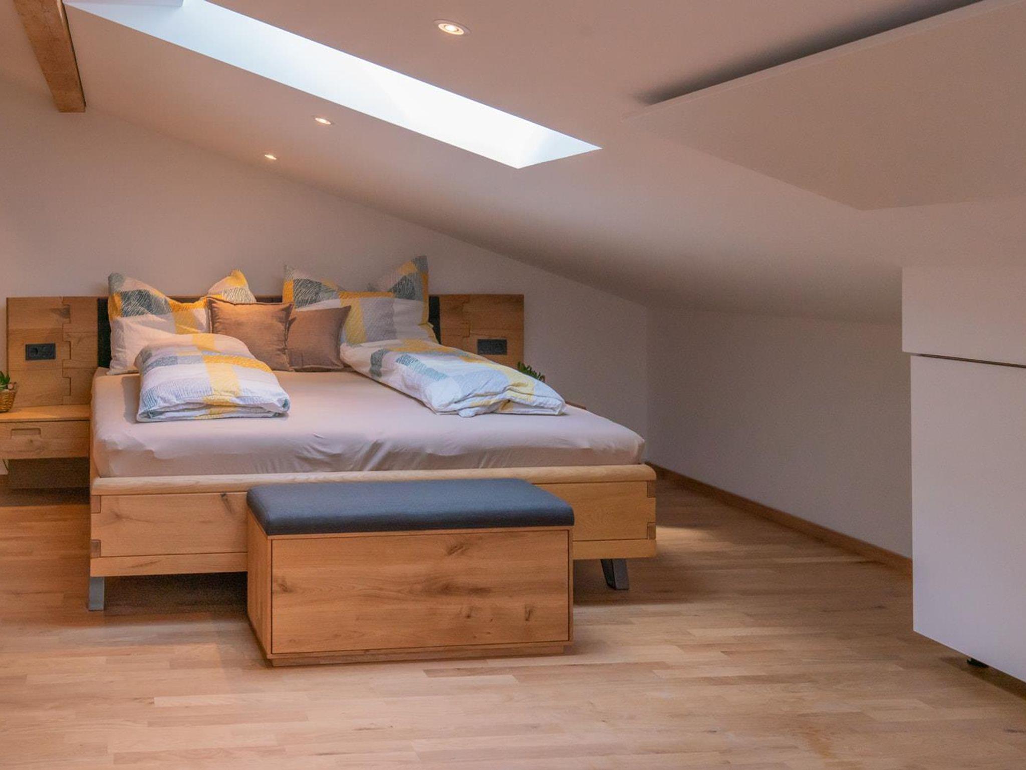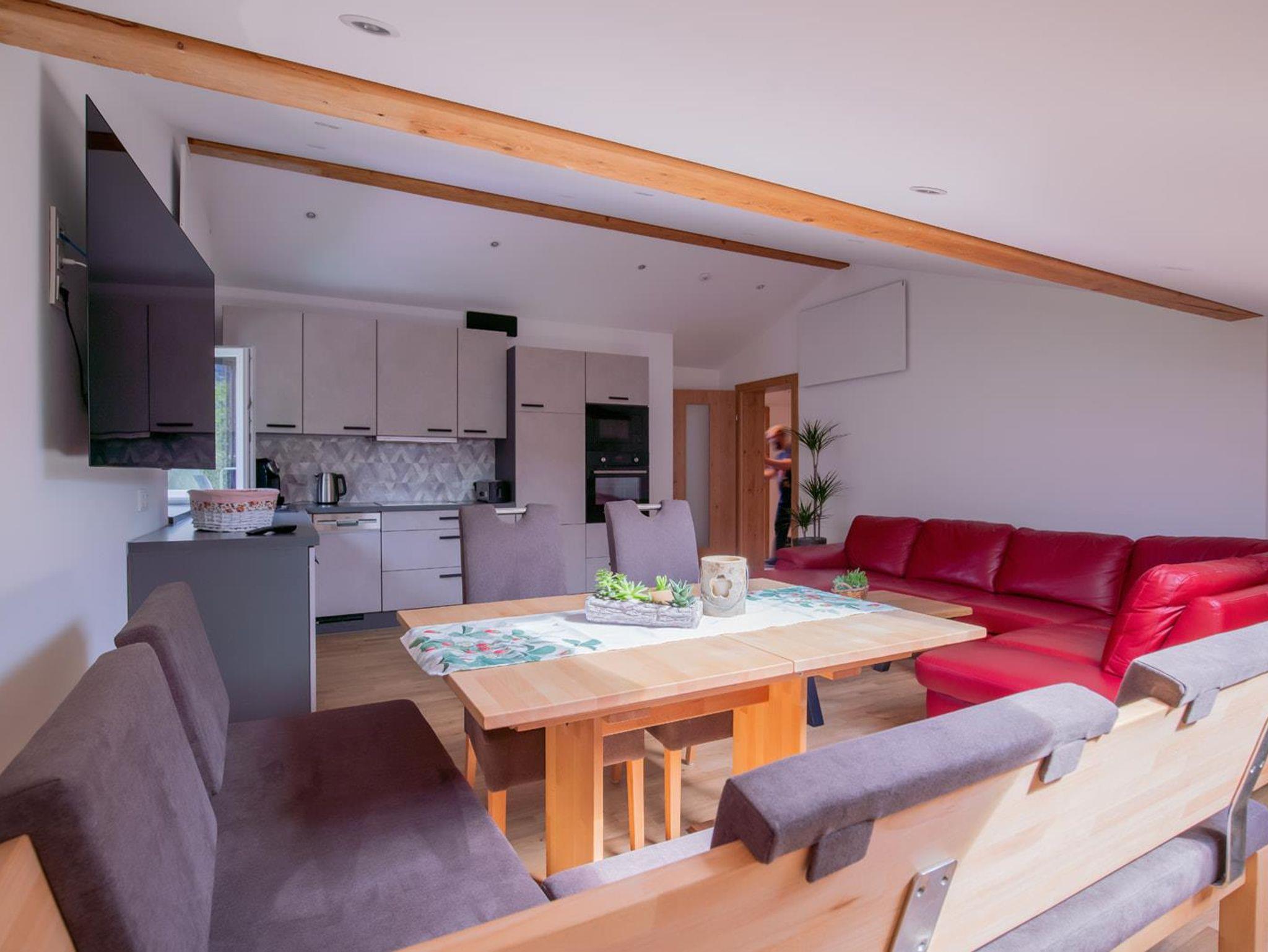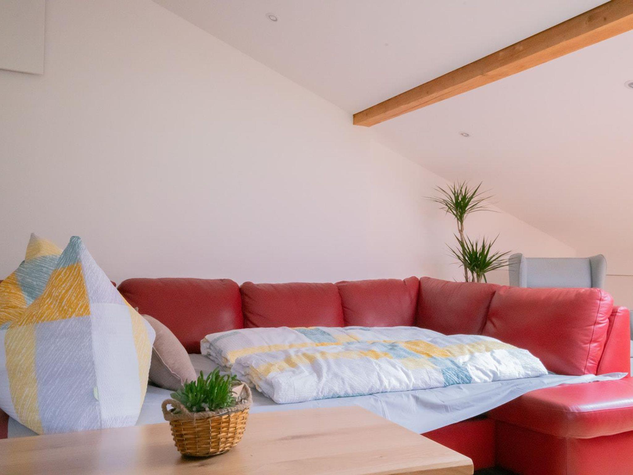 Unsere neu renovierte Dachgeschosswohnung besteht aus zwei getrennten begehbaren Schlafzimmern (1 Doppelbettzimmer und 1 Vierbettzimmer), ein Bad mit Dusche, Waschtrockner, Föhn, einem grossen Wohn-Essbereich mit Schlafcouch . In jeden Zimmer gibt es TV und Radio über Lautsprecher. Das Apartment verfügt über einen Autoabstellplatz sowie ein Abstellraum für Ski und Golfausrüstung. Die Terrasse befindet sich hinter dem Haus mit Markise und Sitzplätzen sowie ein Grill. Im Winter haben wir ein Kaminzimmer mit Dartscheibe und Kühlschrank im Aussenbereich, was zum Feiern und Verweilen einlädt