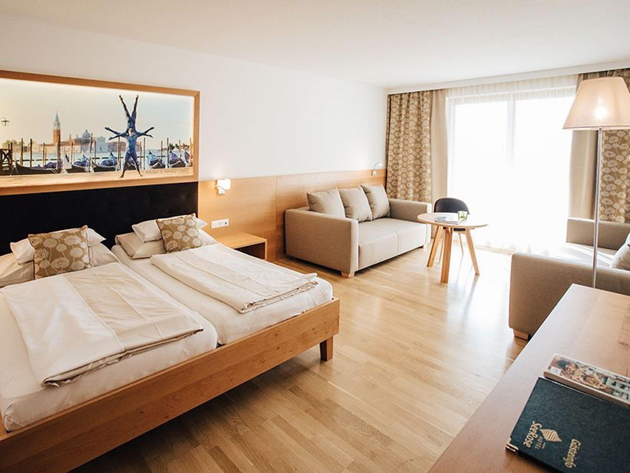 Doppelzimmer „Landskron“ mit 32 m² Schlafzimmer mit Relax-Stuhl. Seebalkon mit traumhaftem Blick auf den See. Dusche, teilweise separates WC, Sat-TV, Telefon und Glasfaser-WLAN.