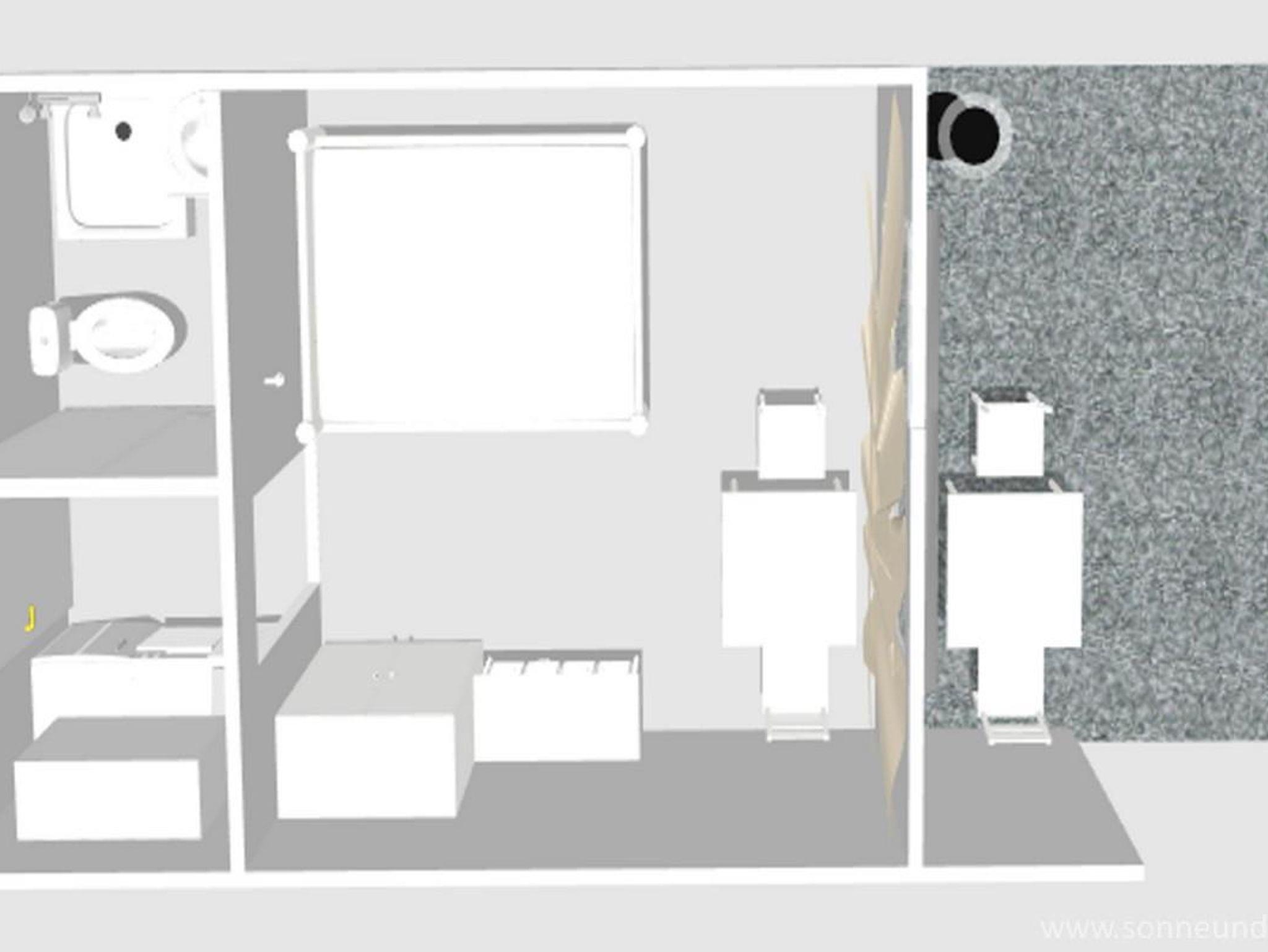 Aufteilung: Schlafzimmer, Küchenzeile, Bad (Dusche & WC), Terrasse.