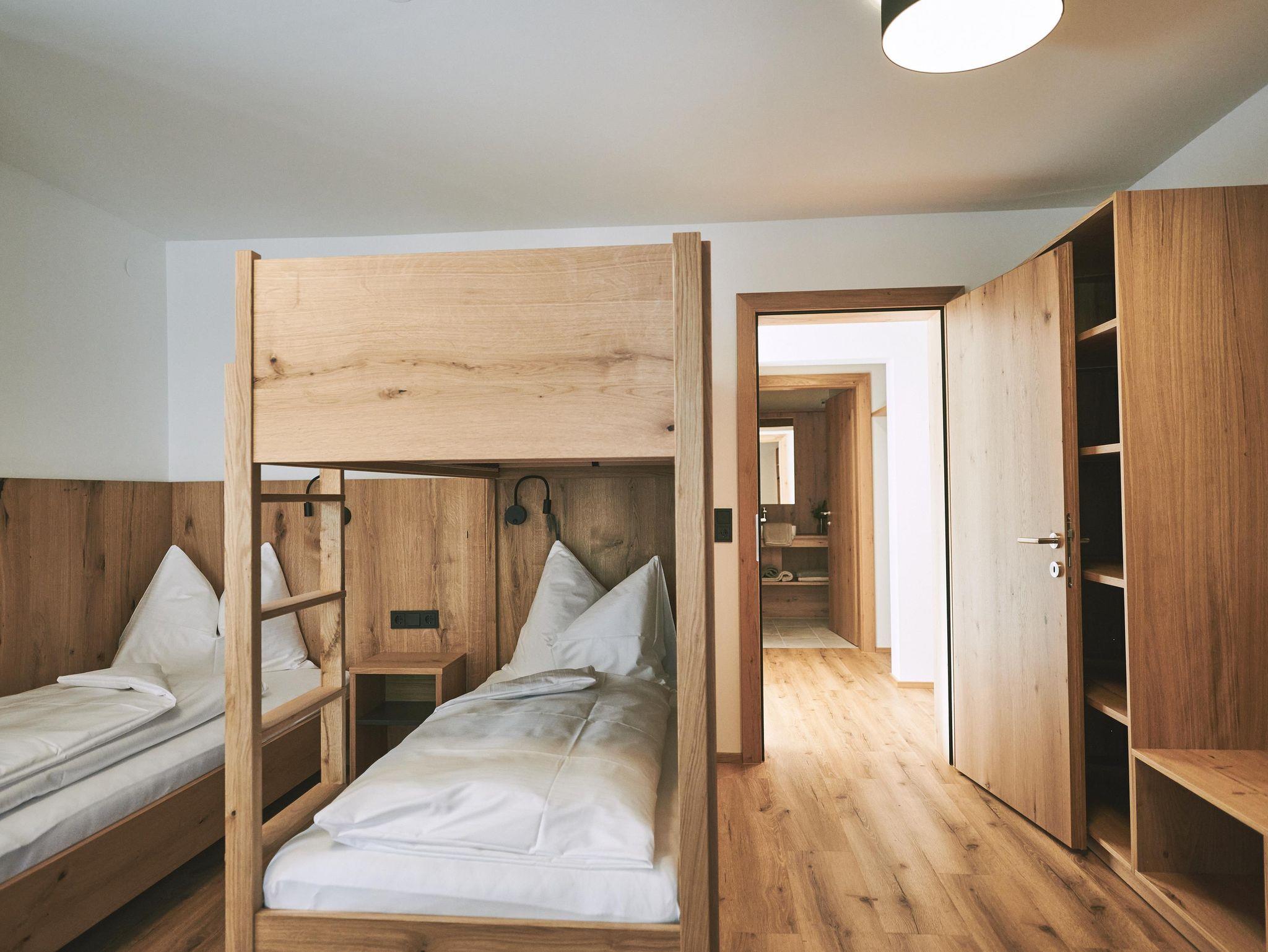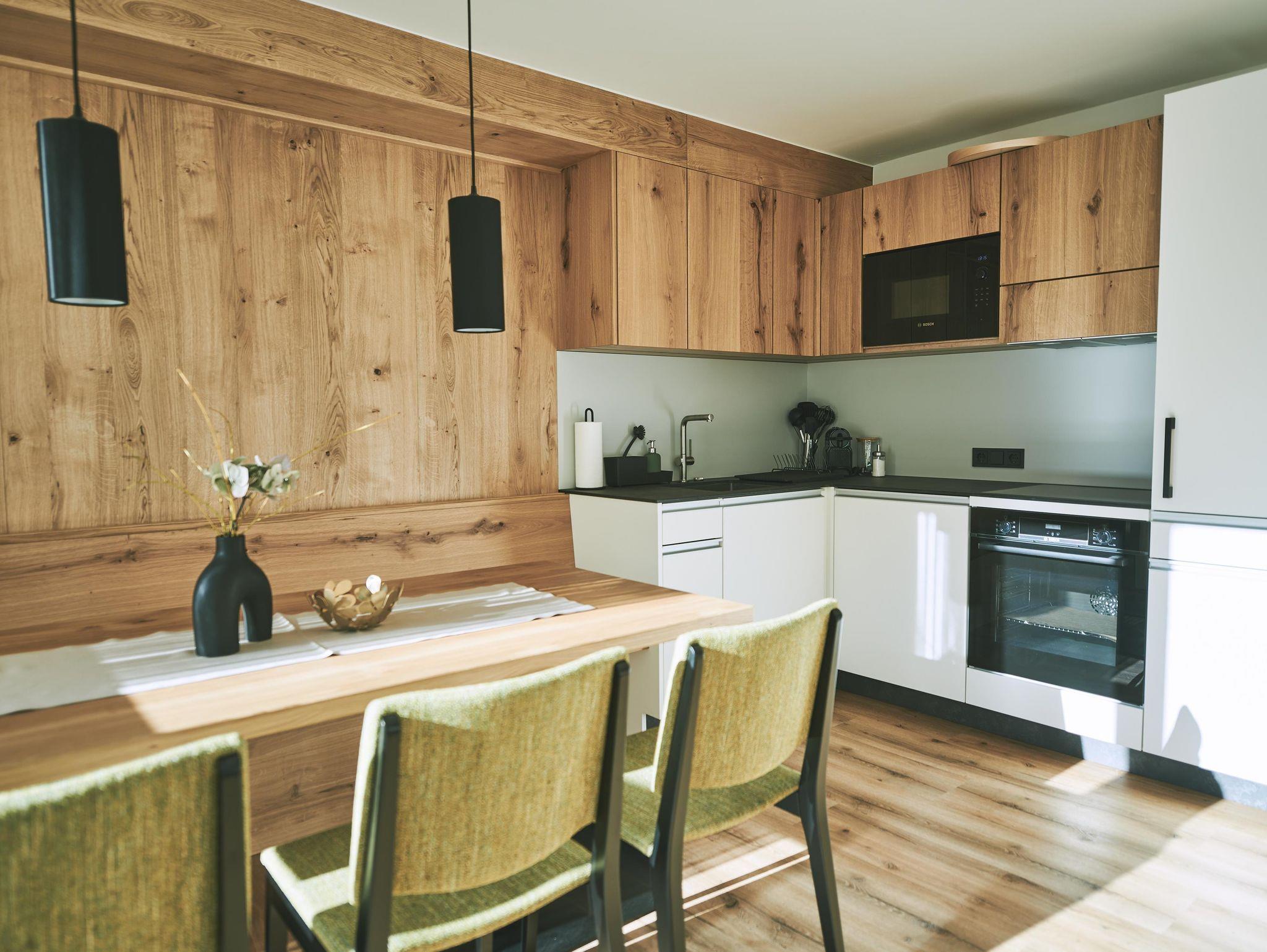 Das Appartement verfügt über ein separates Schlafzimmer mit Fernseher, ein modern ausgestattetes Badezimmer, eine kleine Küche mit Geschirrspüler, 2-Platten-Kochfeld sowie Kombi-Mikrowellen-Backofen und eine gemütliche Sitzecke mit Ausziehcouch, die sofort für Wohlfühlatmosphäre sorgt. Fußböden und Möbel sind aus heimischer Fichte gefertigt und verleihen dem Appartement seinen natürlichen, warmen Charakter.