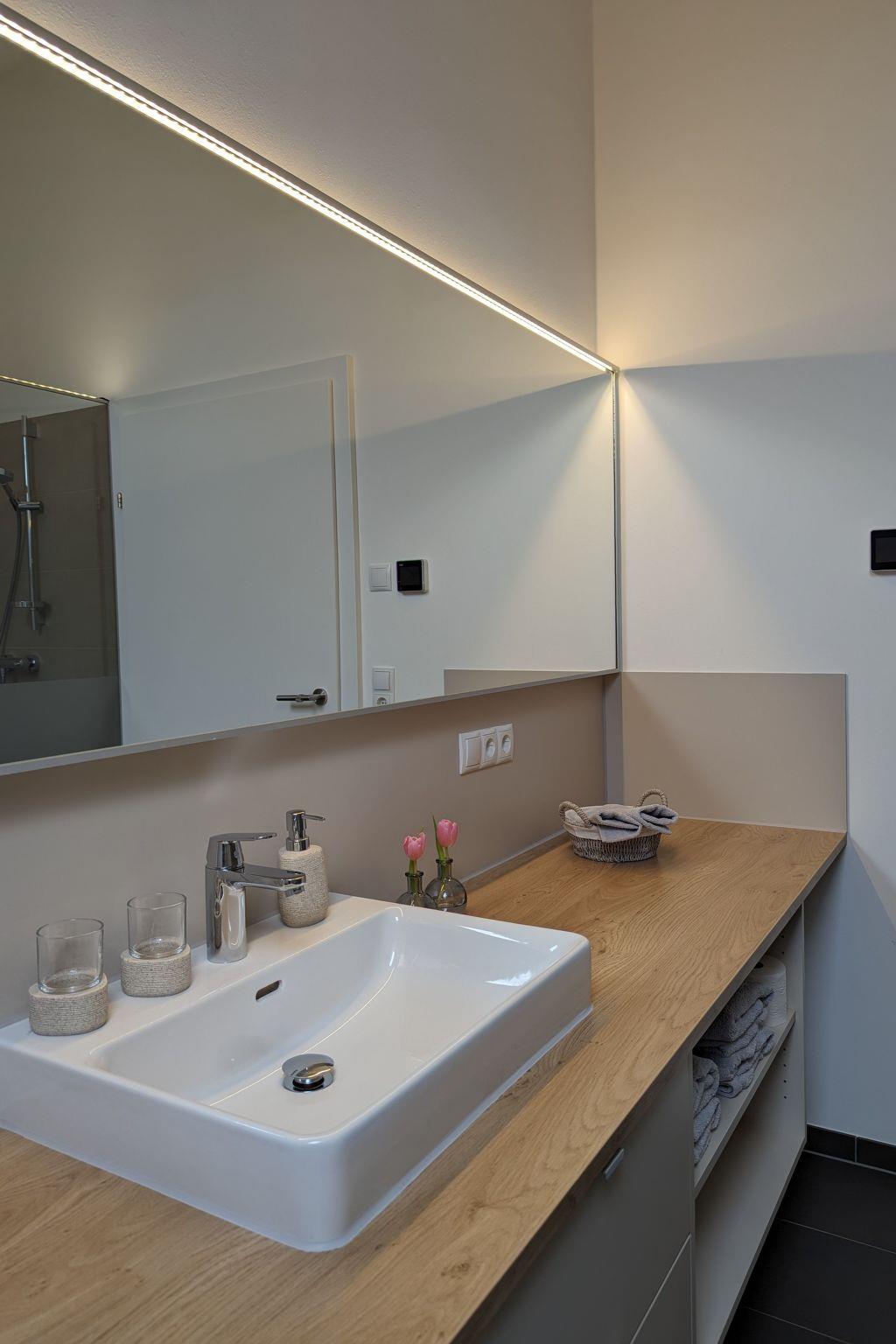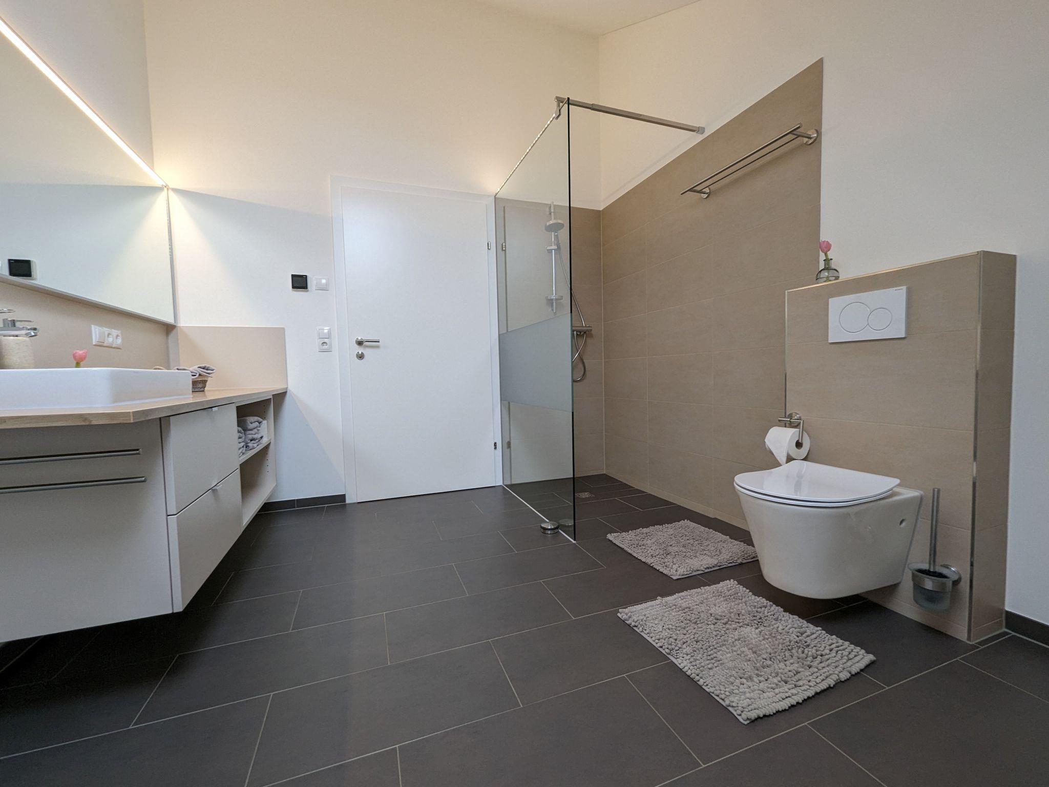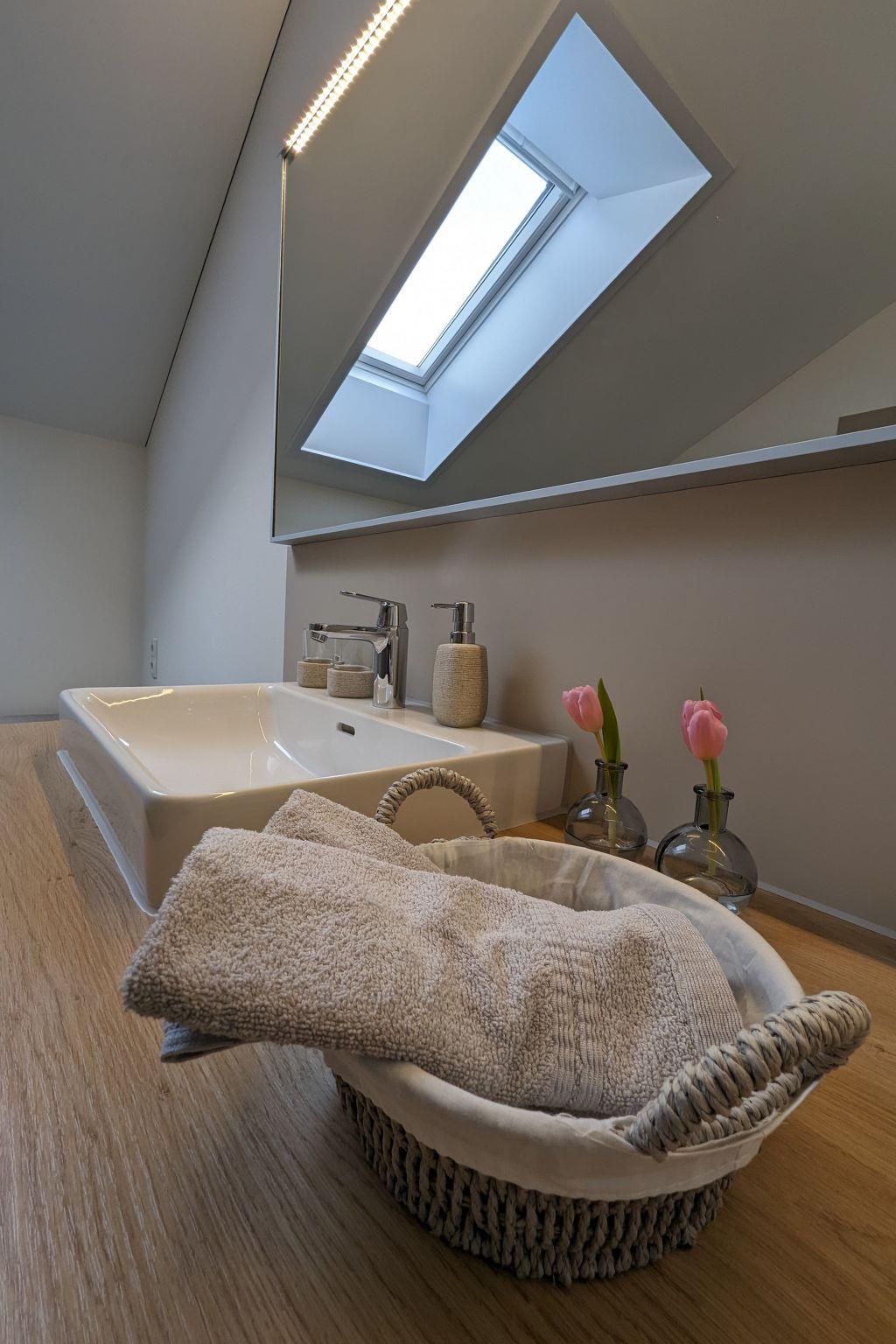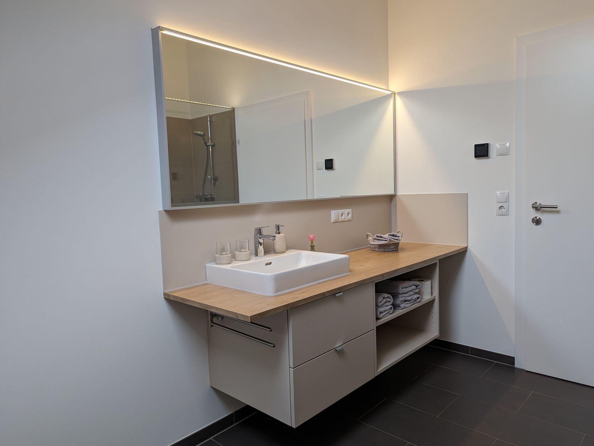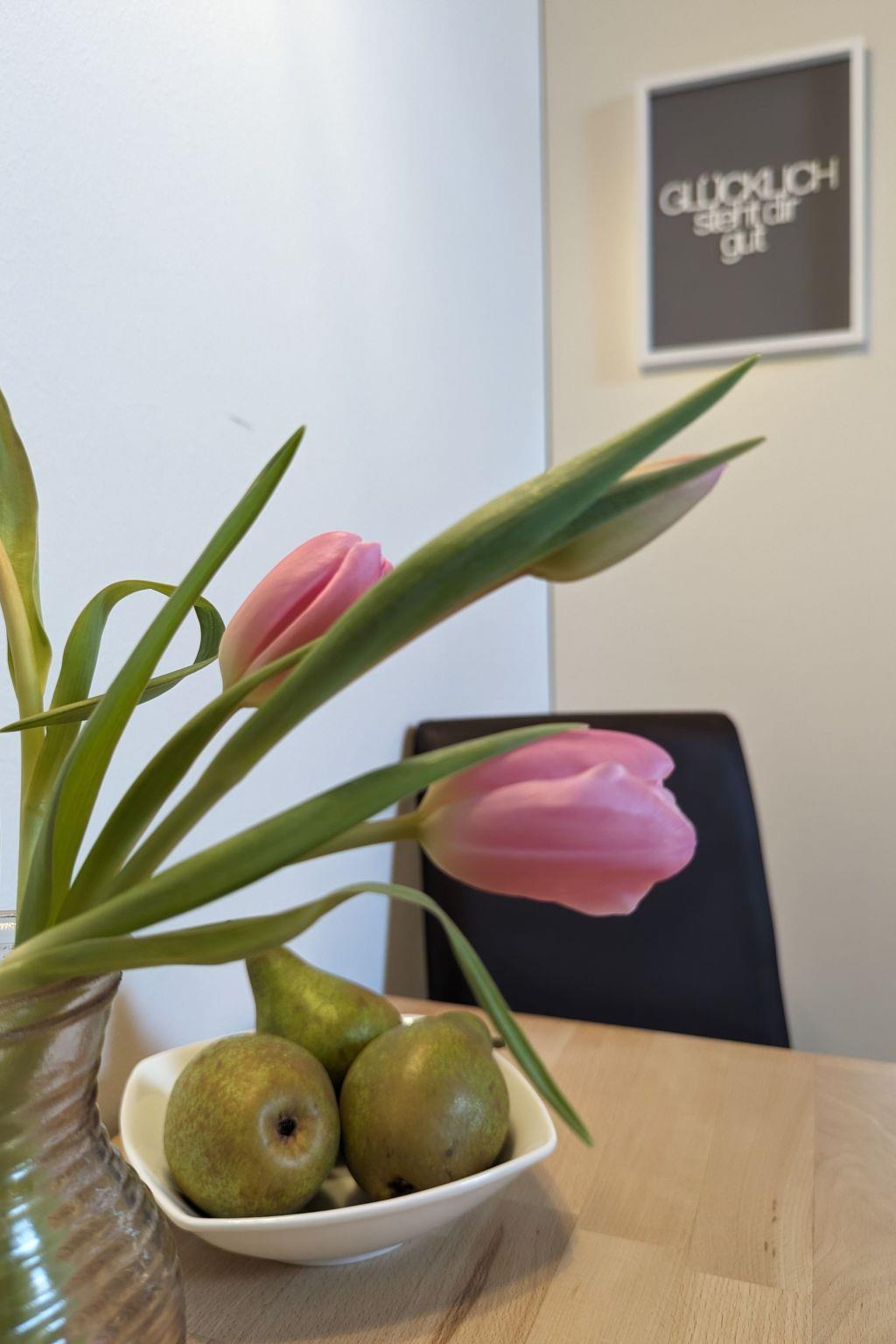 The interior of the Auszeit flat is designed to make your stay as comfortable as possible. The underfloor heating provides cosy warmth in every corner, while the fan provided ensures a pleasant breeze on warmer days. The equipment also includes a ceramic hob, a capsule coffee machine and a dishwasher to make your everyday life easier. Although the kitchen and bathroom serve as the heart of the flat, it is the many small amenities that make your stay special.