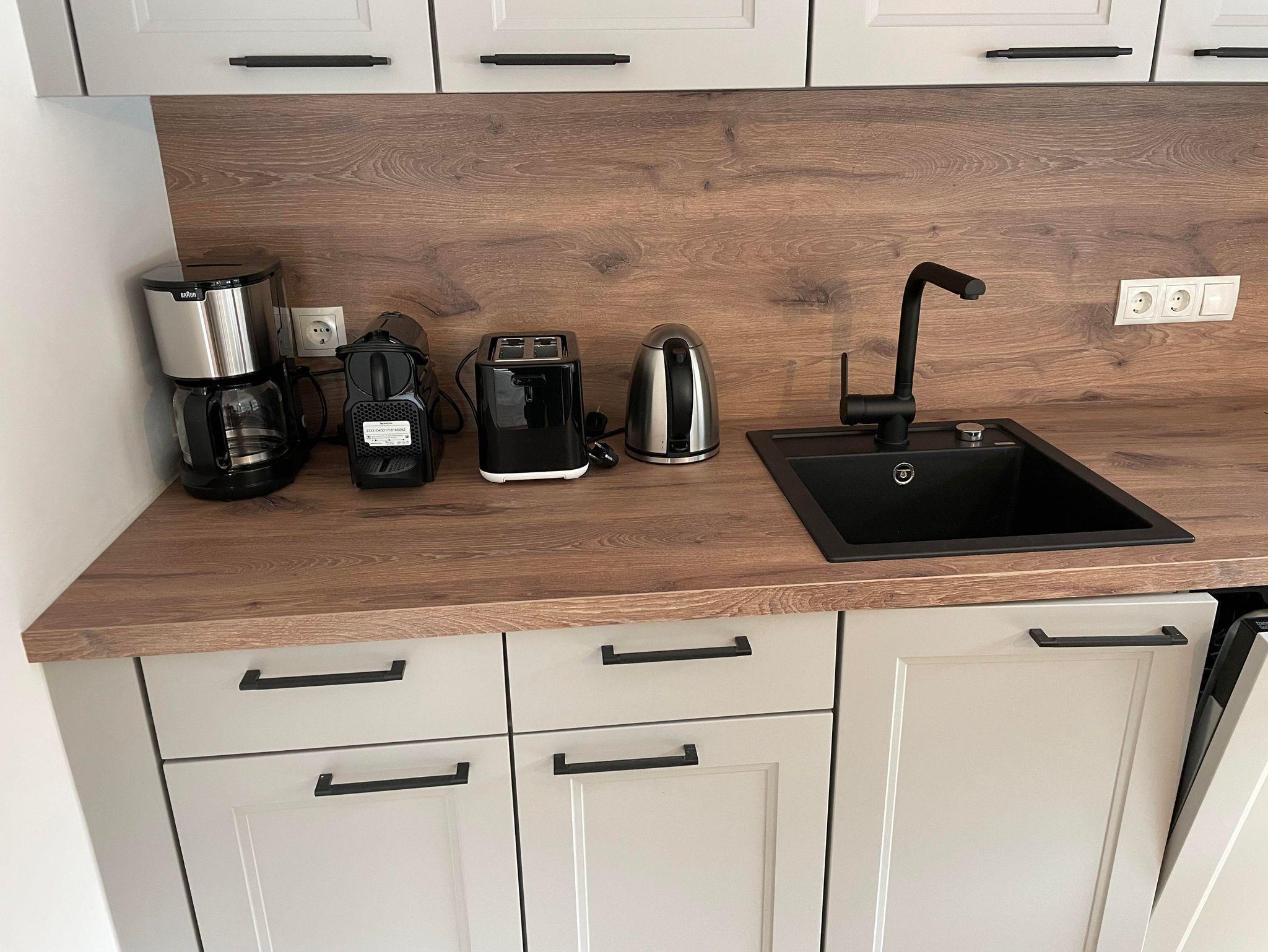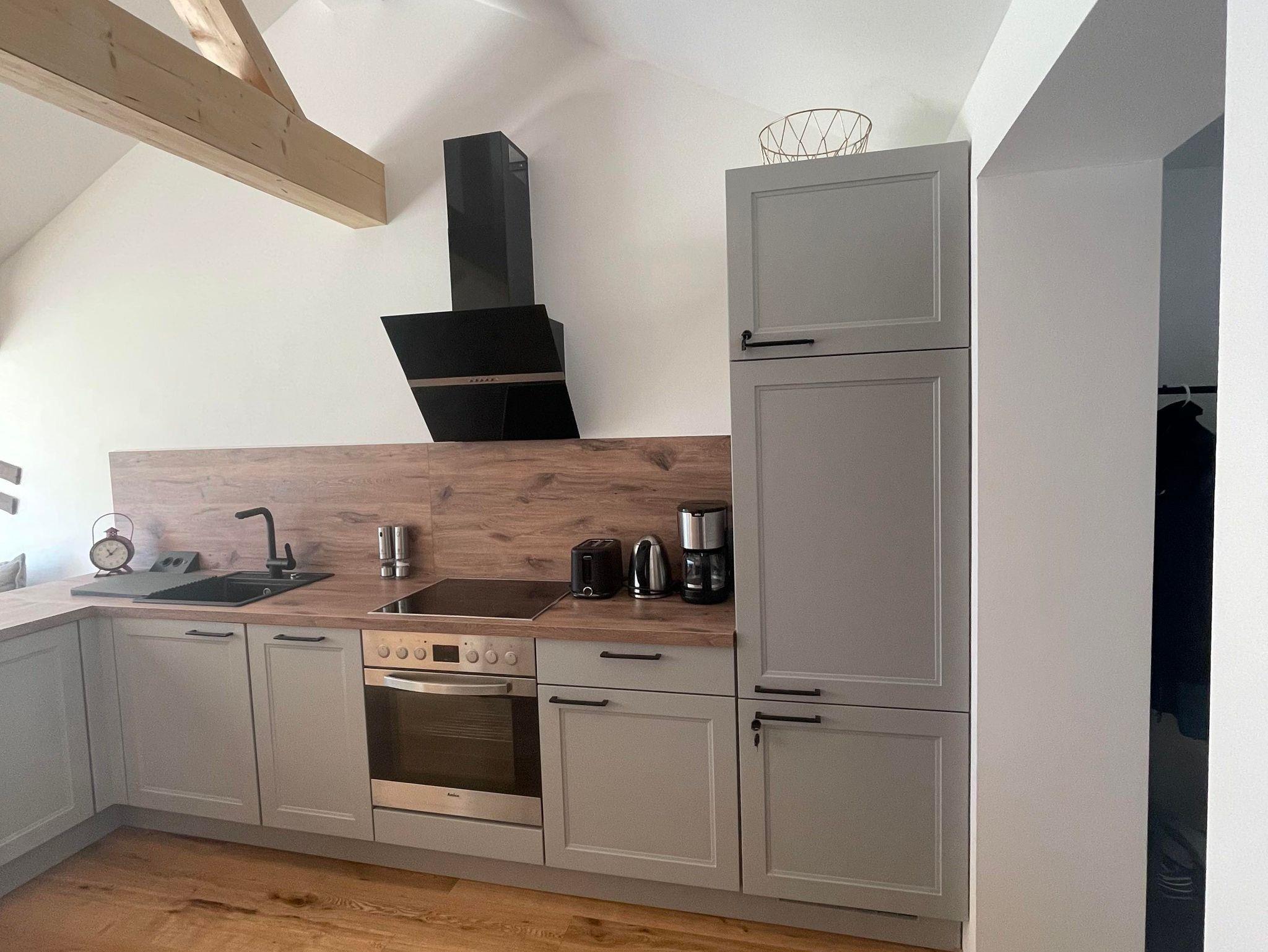 Die offene Küche ist komplett ausgstattet und verfügt über einen Backofen mit Ceran-Kochfeld, Filter-Kaffeemaschine (Filter Nr. 4), Wasserkocher, Toaster und Kühlschrank mit Gefrierfach.