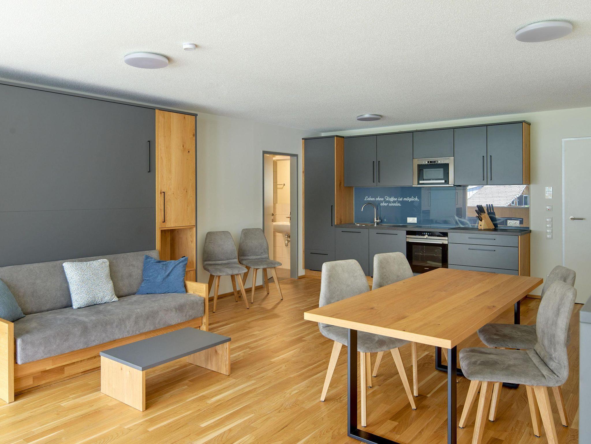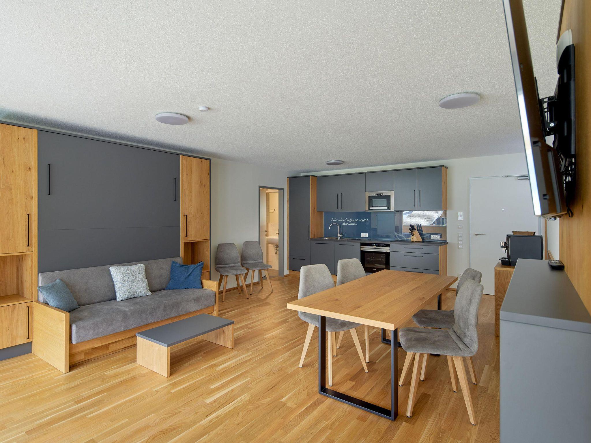 Willkommen im Zapfig Living Apartment 33, Deinem perfekten Rückzugsort für einen erholsamen Aufenthalt. Die 80 m² Unterkunft im 2.Stock bietet ein gemütliches Wohnzimmer inkl. ausziehbaren Kingsizebett mit Smart-TV, 2 Schlafzimmer (Kingsizebett+ausziehbares Einzelbett+Smart-TV) sowie eine voll ausgestattete Küche. Die 2 Badezimmer verfügen über Dusche und WC. Genieße den Komfort einer eigenen Unterkunft+entspanne in alpiner Umgebung. Vom Balkon mit Liegenstühlen besteht Bergblick.