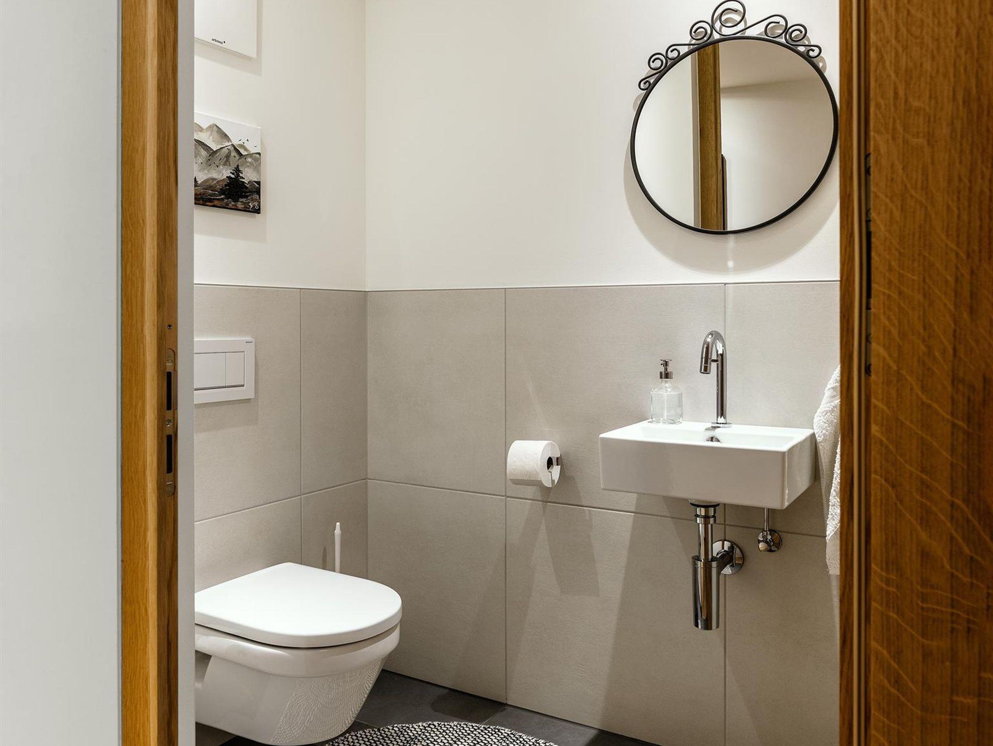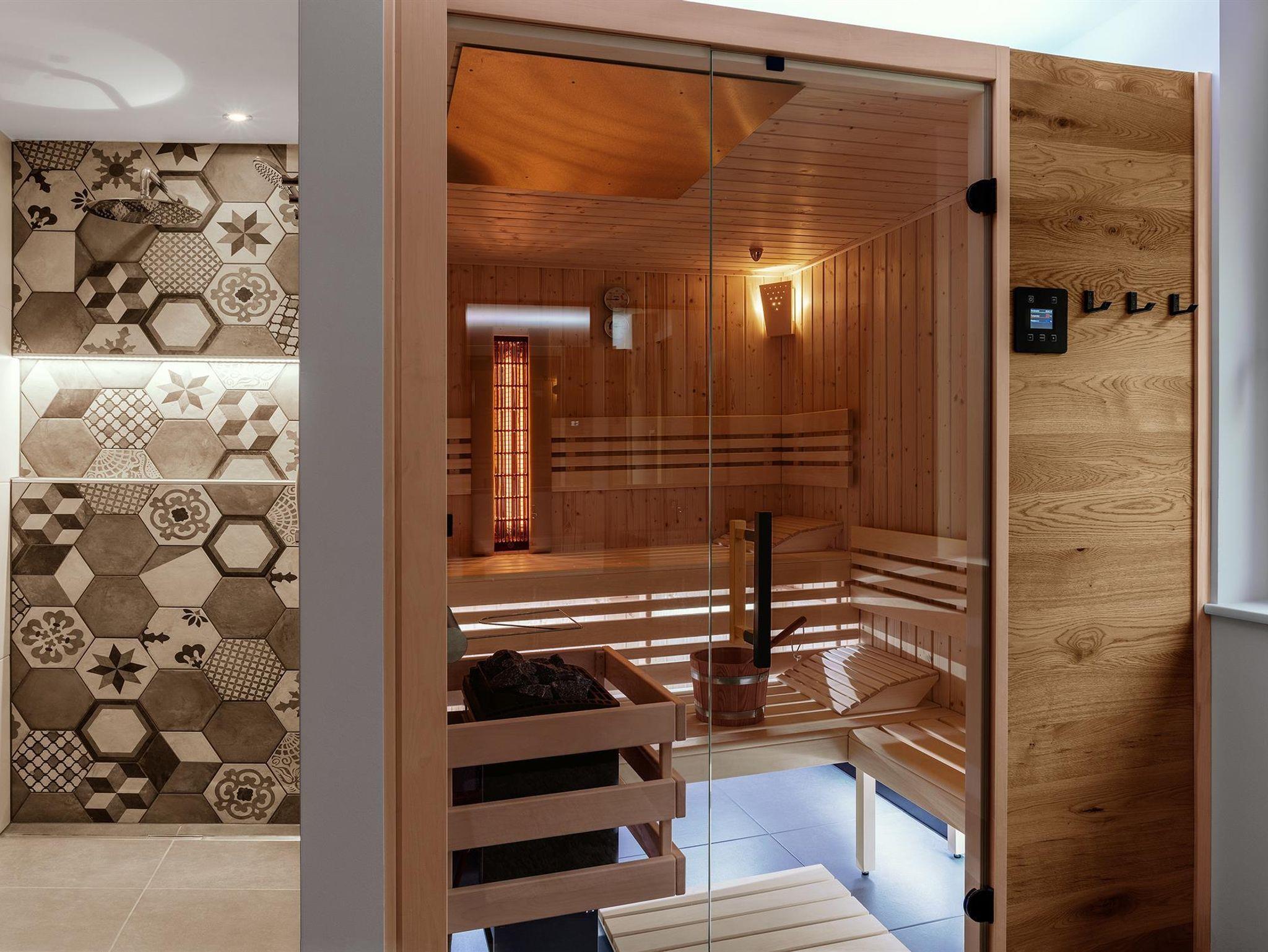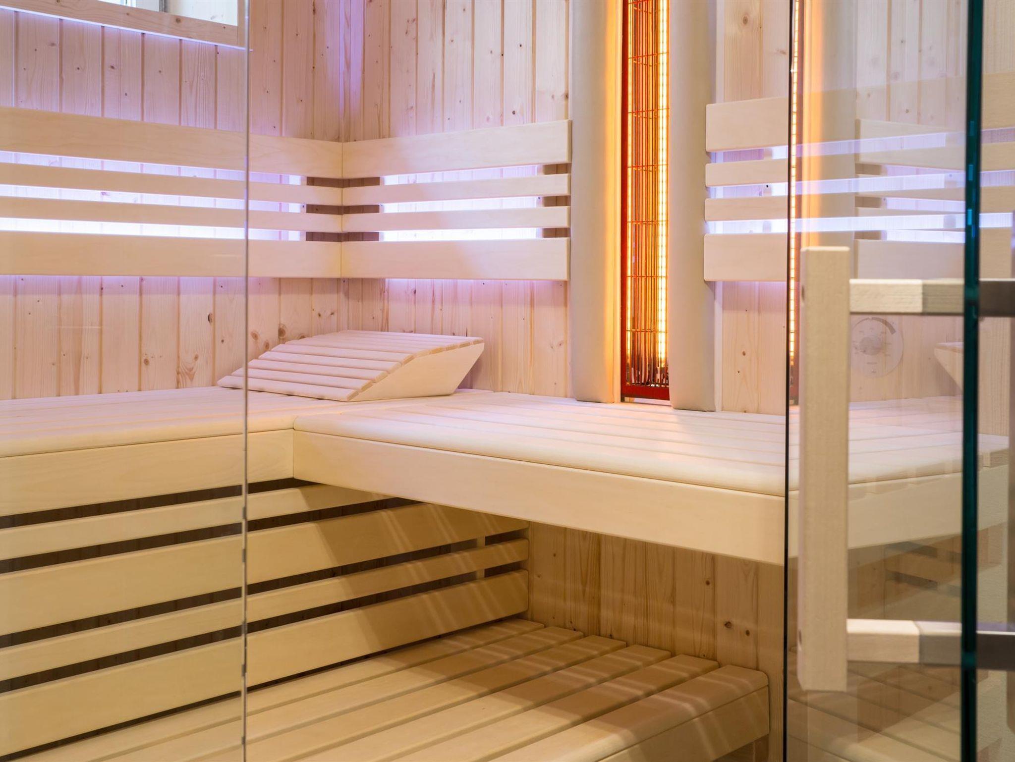 • 1 großes Badezimmer mit SAUNA, Infrarotstrahler, Doppelwaschbecken und Wellnessdusche