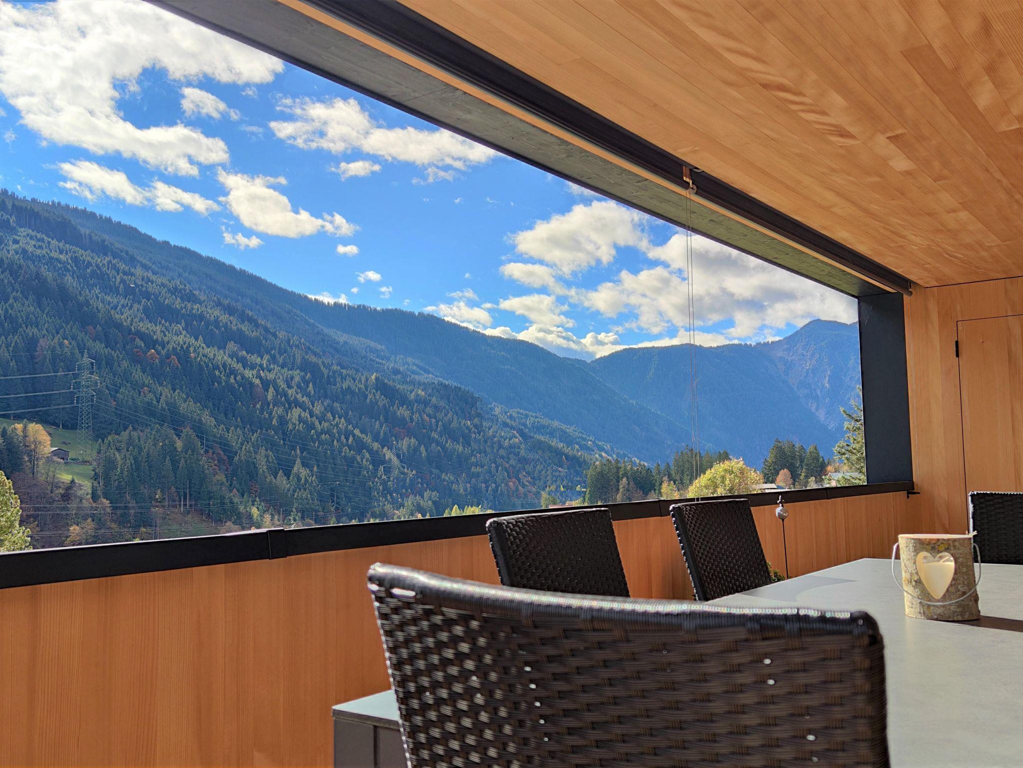 Die große südseitige Fensterfront mit Sonnenbalkon bietet Ihnen eine traumhafte Sicht auf das VERWALL - eine Gebirgsgruppe in den Alpen mit markanten Berggipfeln.
