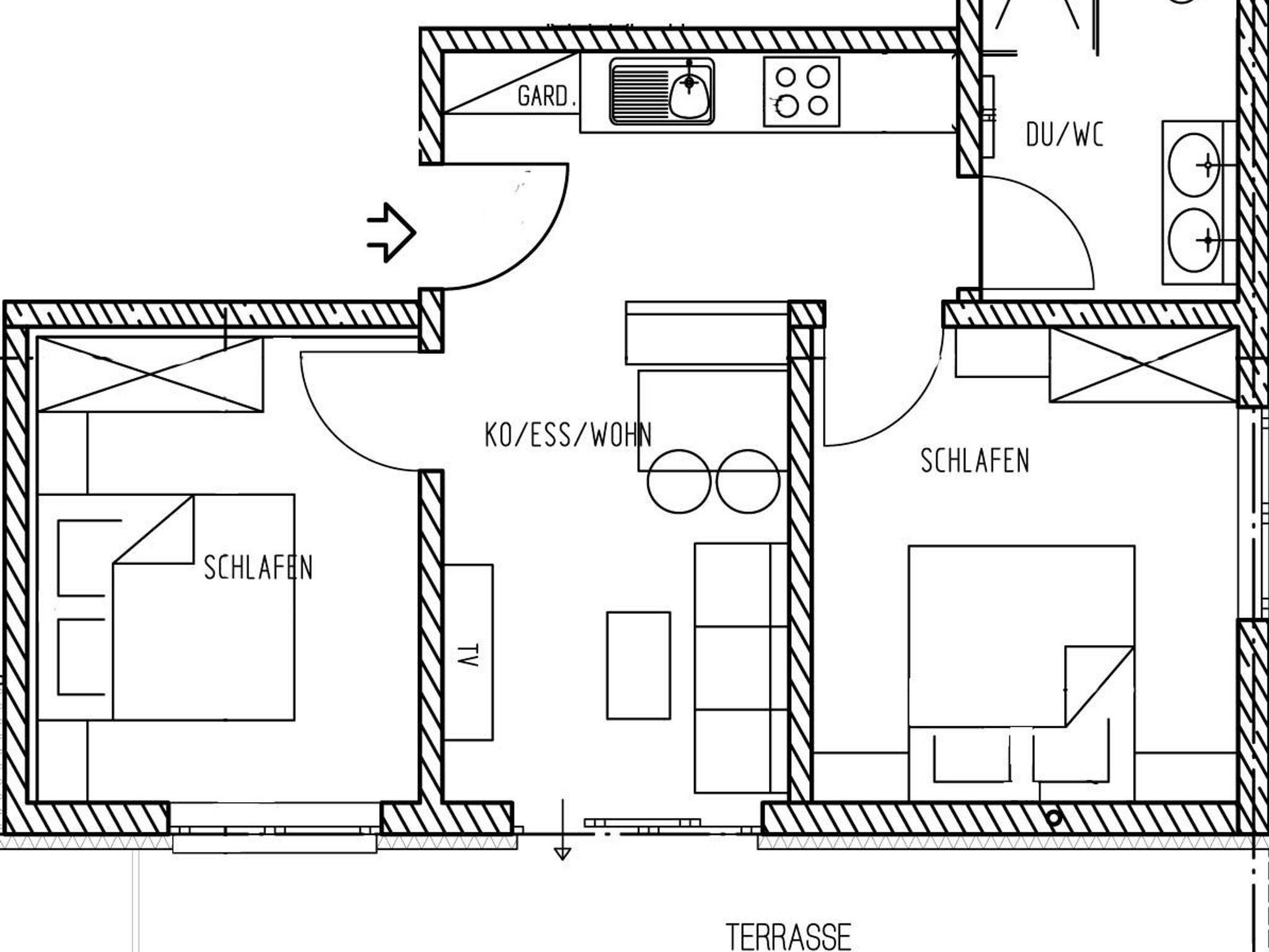 Die geräumige Wohnung liegt im Erdgeschoß und verfügt über 2 Schlafzimmer und 1 Badezimmer mit Dusche und Doppelwaschbecken. Die Küche im Wohnbereich ist vollausgestattet mit Backofen, Herd, Kühlschrank, Mikrowelle, usw.