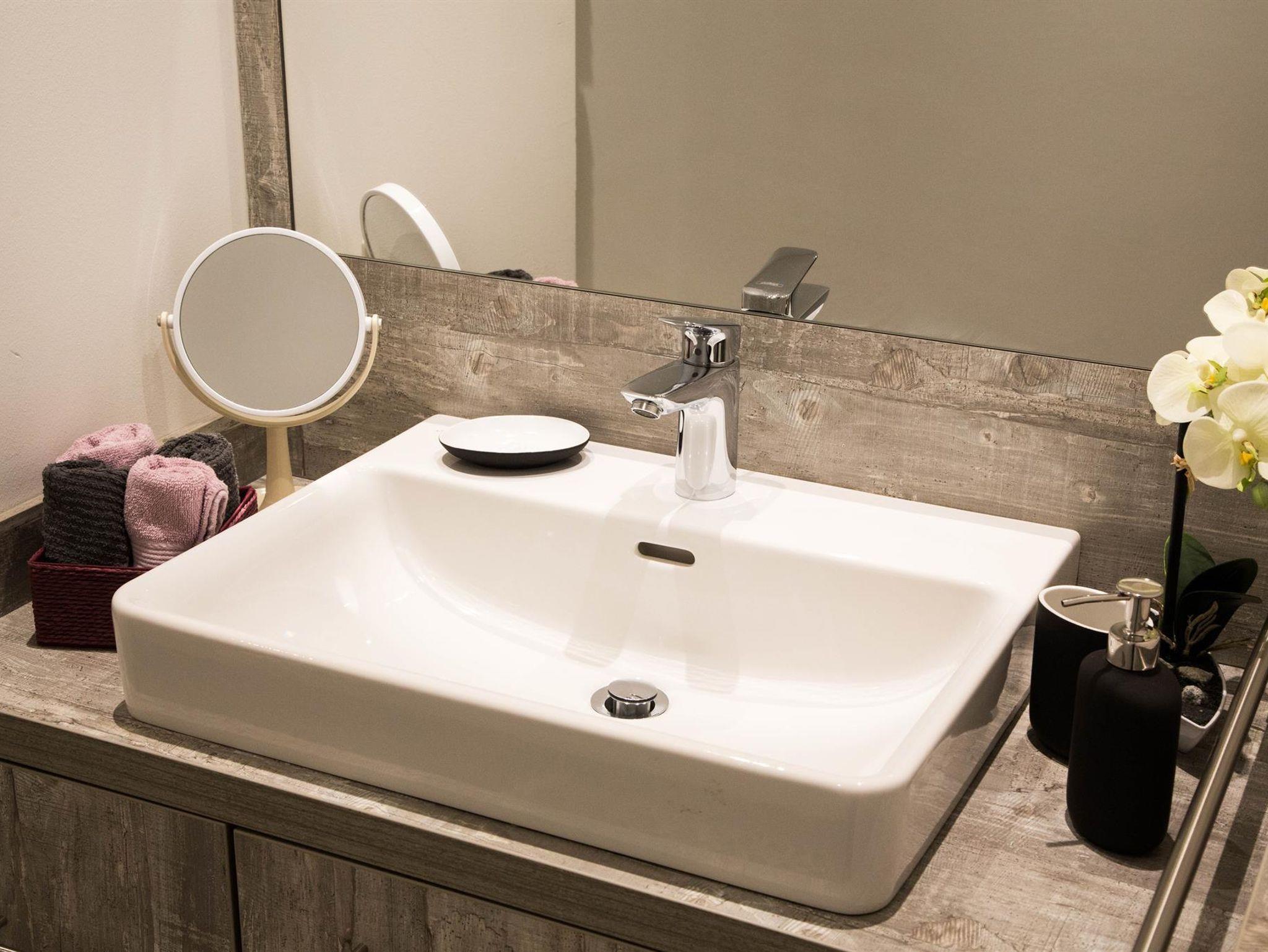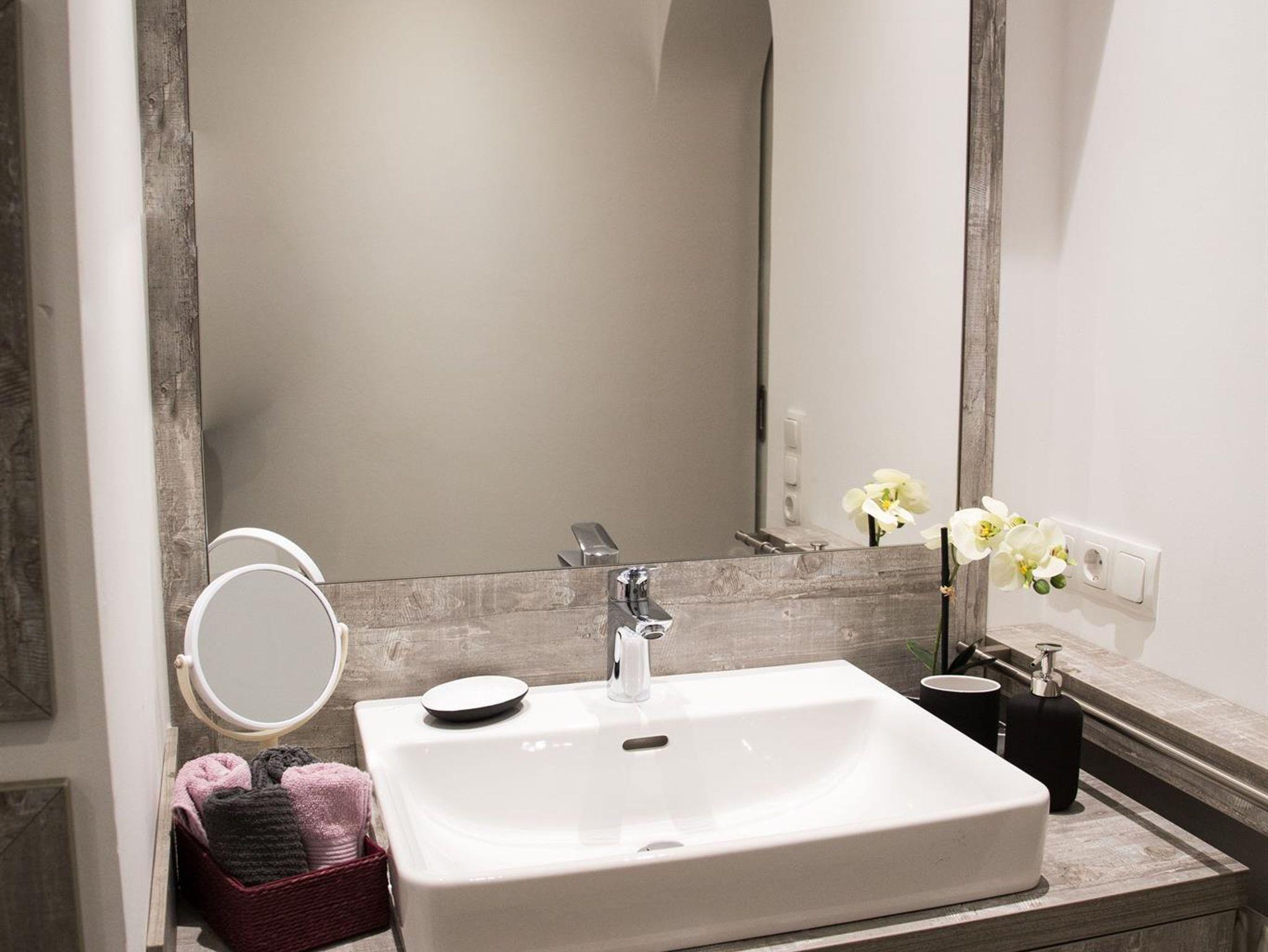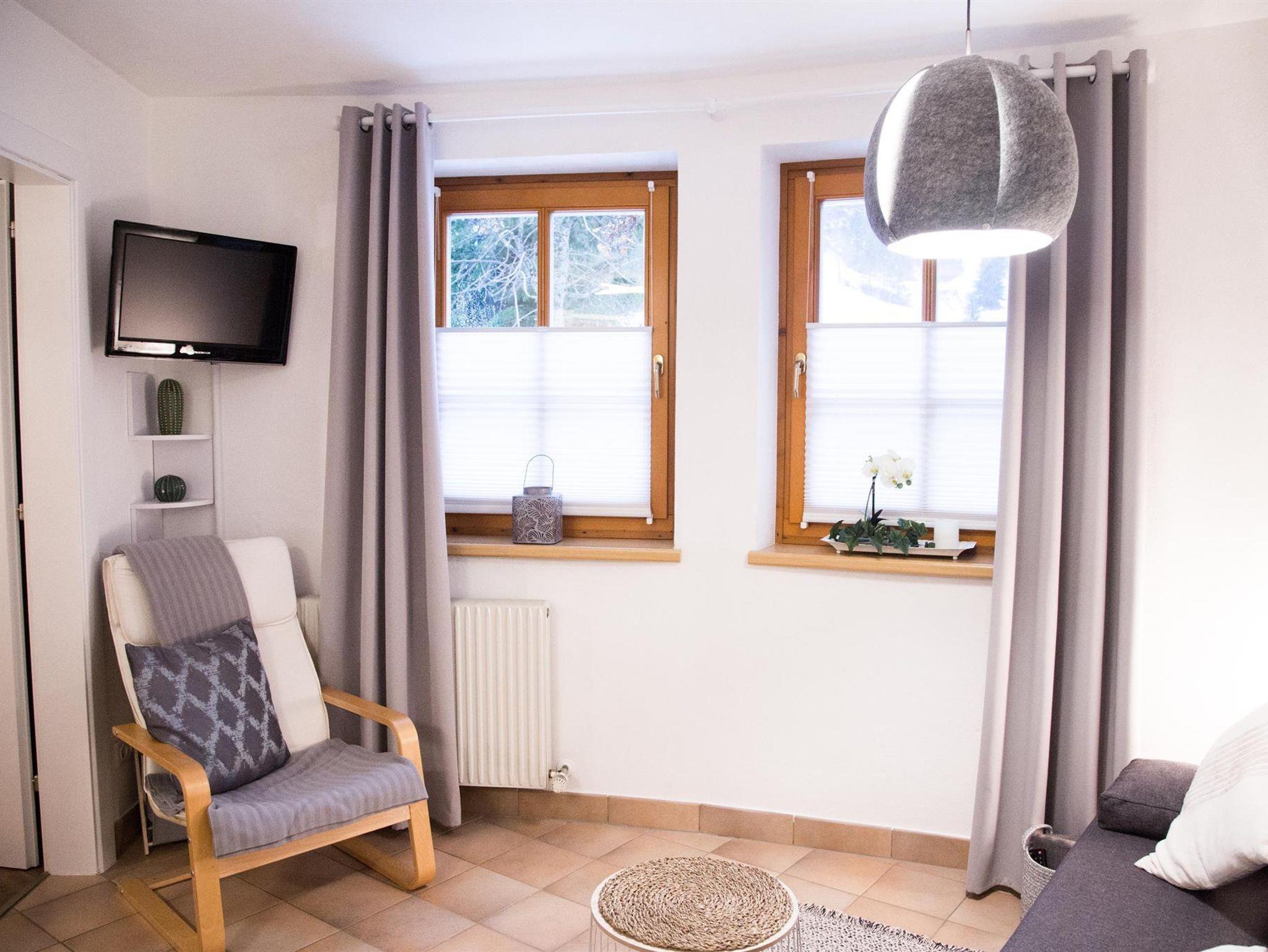 Ferienappartement in Top Lage im Herzen von Dienten für 2 Personen, Schlafzimmer mit Boxspringbett, Wohnraum/ Küche, elegantes Bad mit Regenwasserdusche, WC, Haarfön.