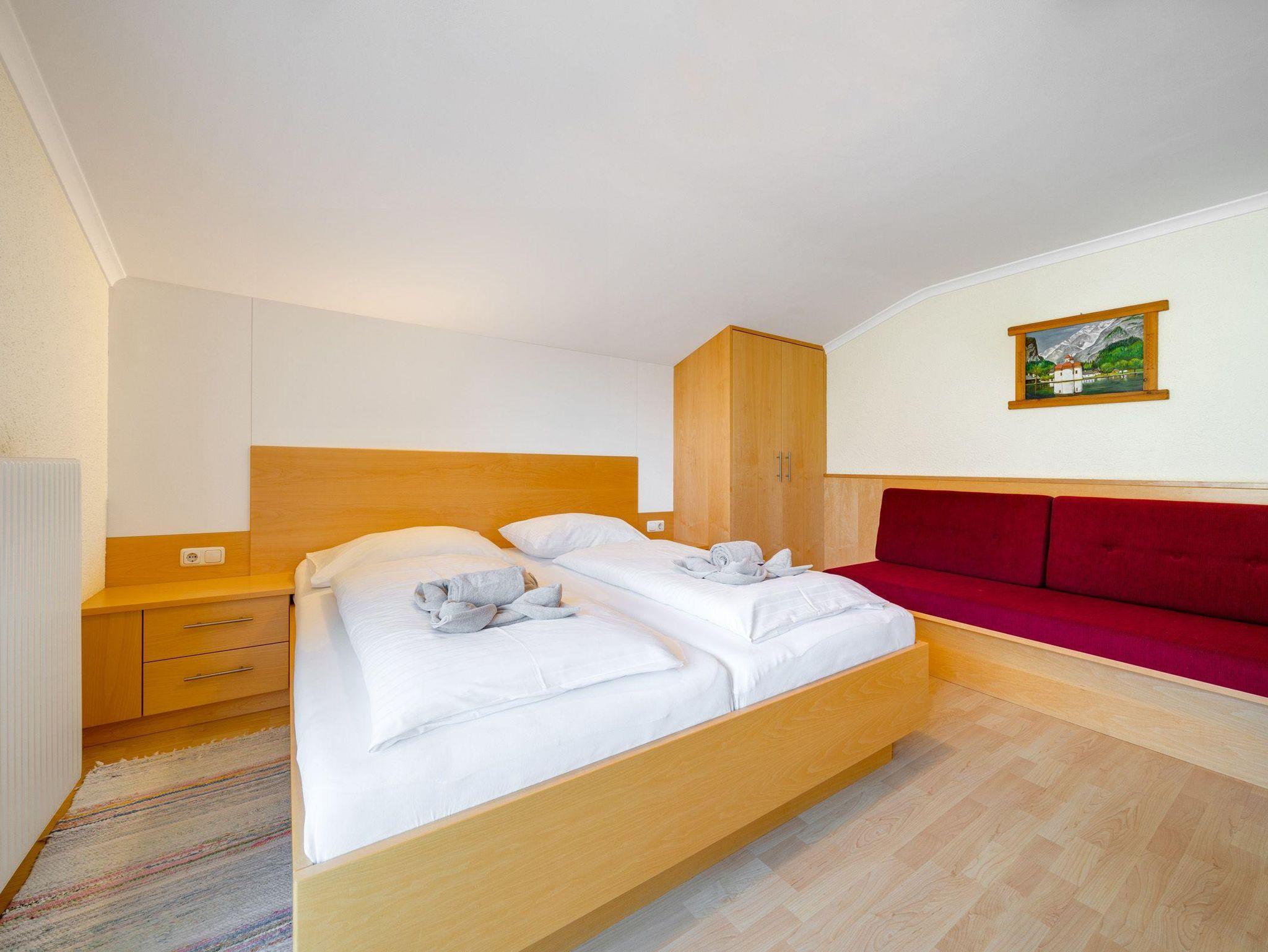 2-3 Personen, Sofa für 3. Person – Bett 180 cm lang, 90 cm breit, Sitzgelegenheit, Doppelbett, Bad mit Dusche und WC, 2. Stock, Südwestbalkon zur Sonnenseite mit traumhaften Garten- und Bergblick