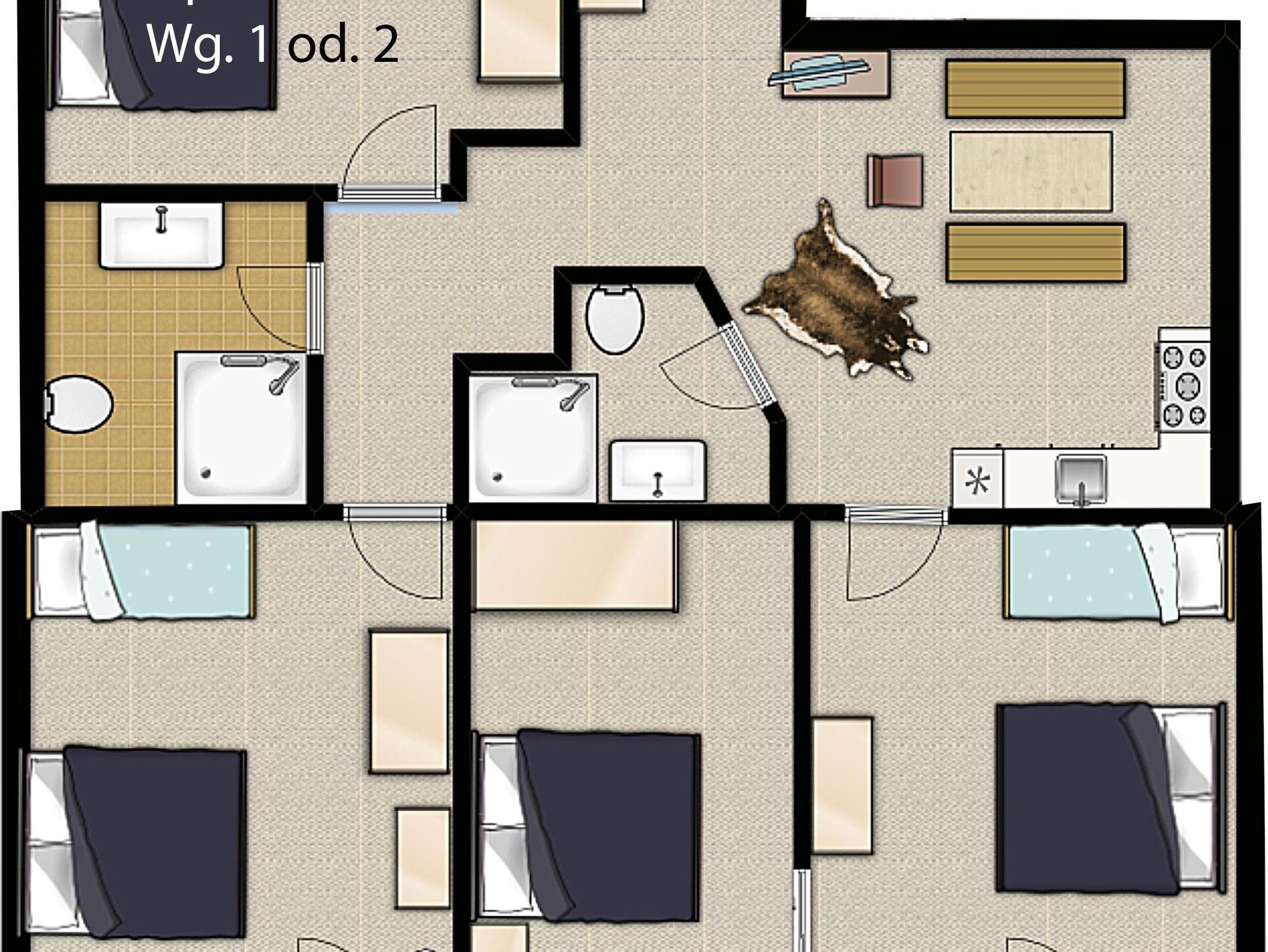 Sie können zwischen 2 Ferienwohnungen mit Balkon und 3 Ferienwohnungen mit Terrasse wählen. Die beiden kleineren Wohnungen sind ca. 50 qm groß und setzen sich folgendermaßen zusammen: Eingangsbereich, Bad/WC mit Dusche, Schlafzimmer für maximal 2 bzw. 3 Personen, Küche mit Esszimmerbereich sowie einem Wohnzimmer mit Schlafmöglichkeit für bis zu 2 zusätzlichen Personen.