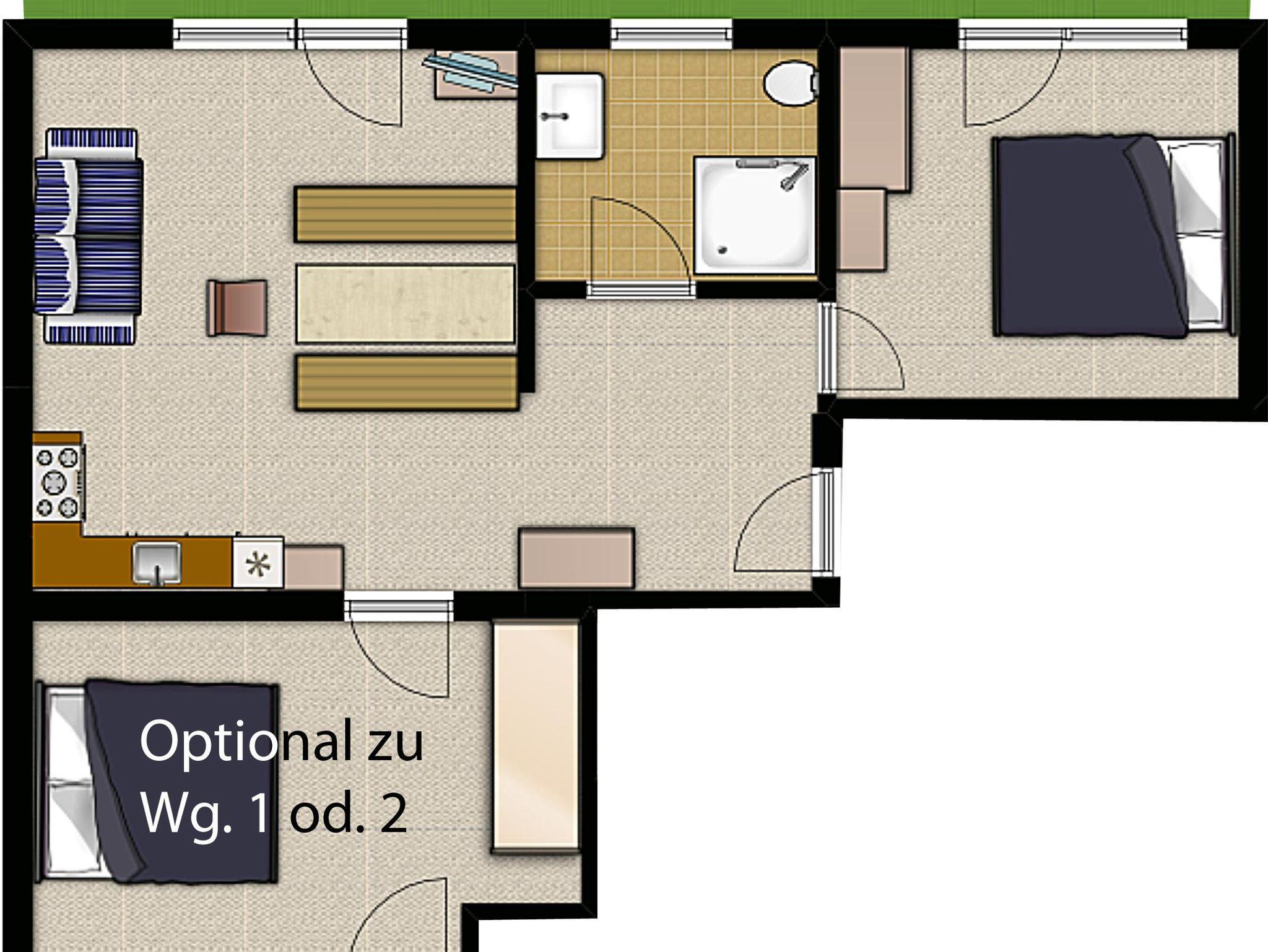 Sie können zwischen 2 Ferienwohnungen mit Balkon und 3 Ferienwohnungen mit Terrasse wählen. Die beiden kleineren Wohnungen sind ca. 50 qm groß und setzen sich folgendermaßen zusammen: Eingangsbereich, Bad/WC mit Dusche, Schlafzimmer für maximal 2 bzw. 3 Personen, Küche mit Esszimmerbereich sowie einem Wohnzimmer mit Schlafmöglichkeit für bis zu 2 zusätzlichen Personen.