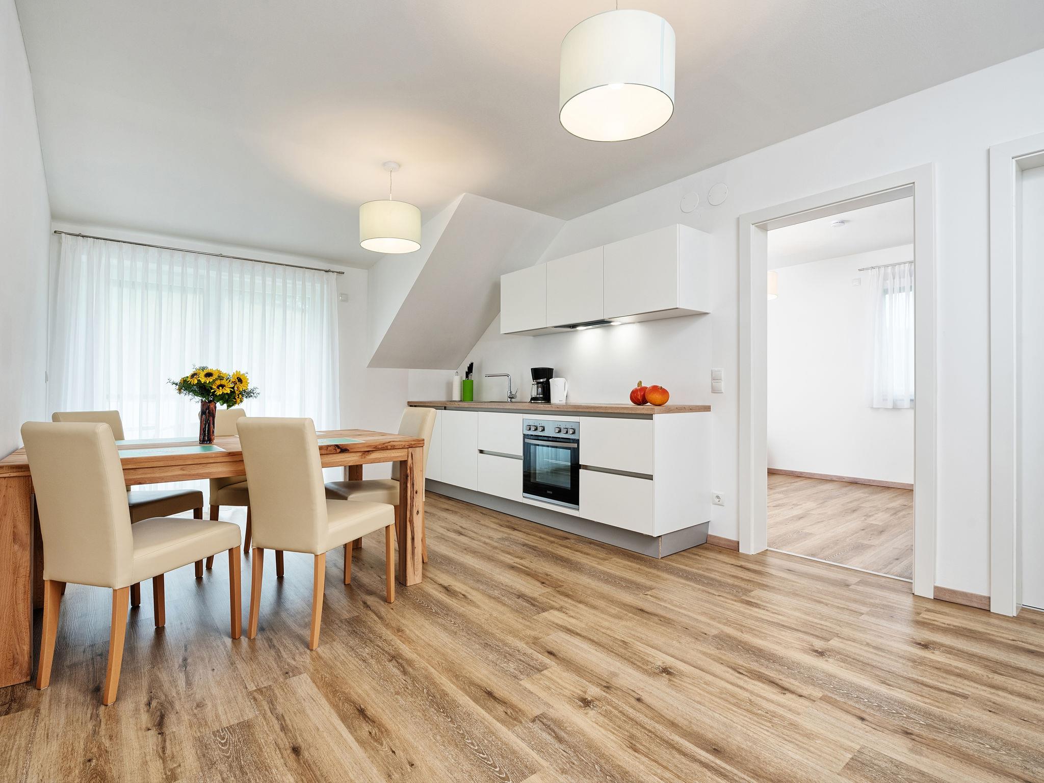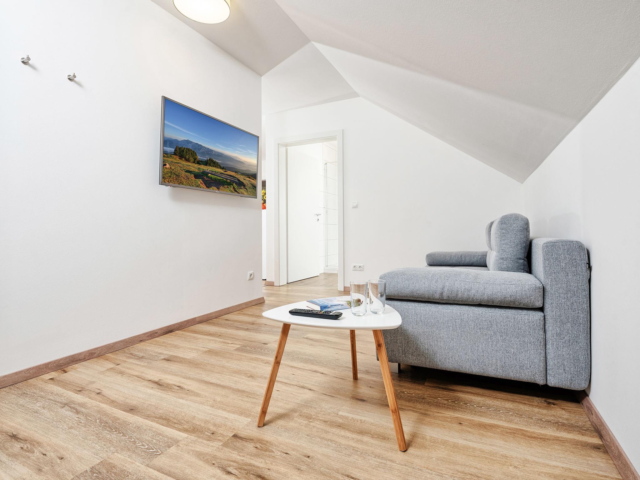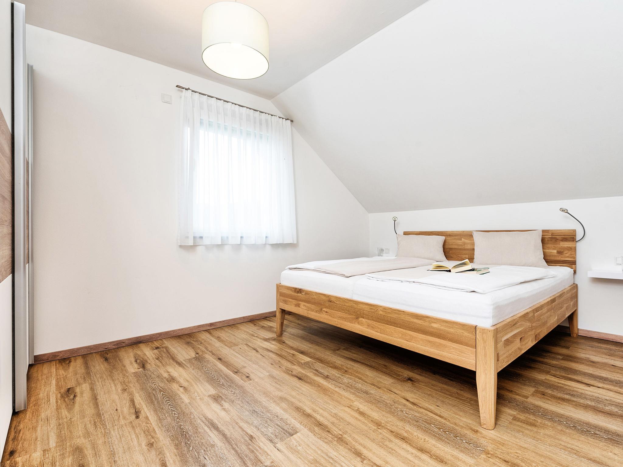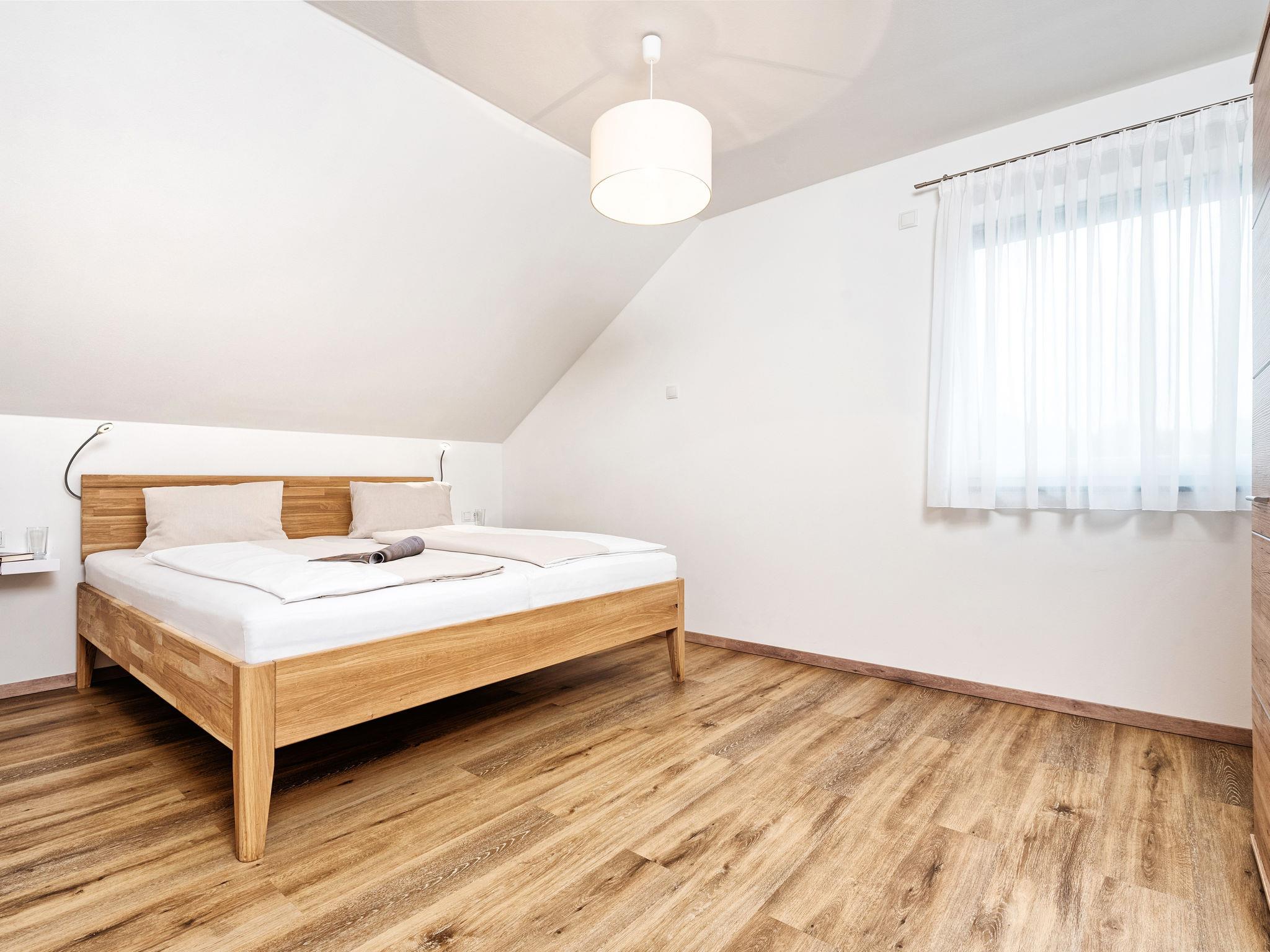 "Deutschbauer", 3-room apartment 62 m2, on the top floor. Object suitable for 4 adults + 2 children. Bright, modern furnishings: living/sleeping room with sloping ceilings with 1 double sofabed (1 x 140 cm, length 200 cm), dining table and satellite TV. Exit to the balcony. 2 double bedrooms with sloping ceilings. Open kitchen (oven, dishwasher, 4 ceramic glass hob hotplates, toaster, kettle, electric coffee machine). Shower/WC. Air-conditioning, underfloor heating. Balcony 3 m2. Balcony furniture. Facilities: children's high chair, baby cot. Internet (WiFi, free). Parking (1 car) at the house. Please note: smoke alarm.