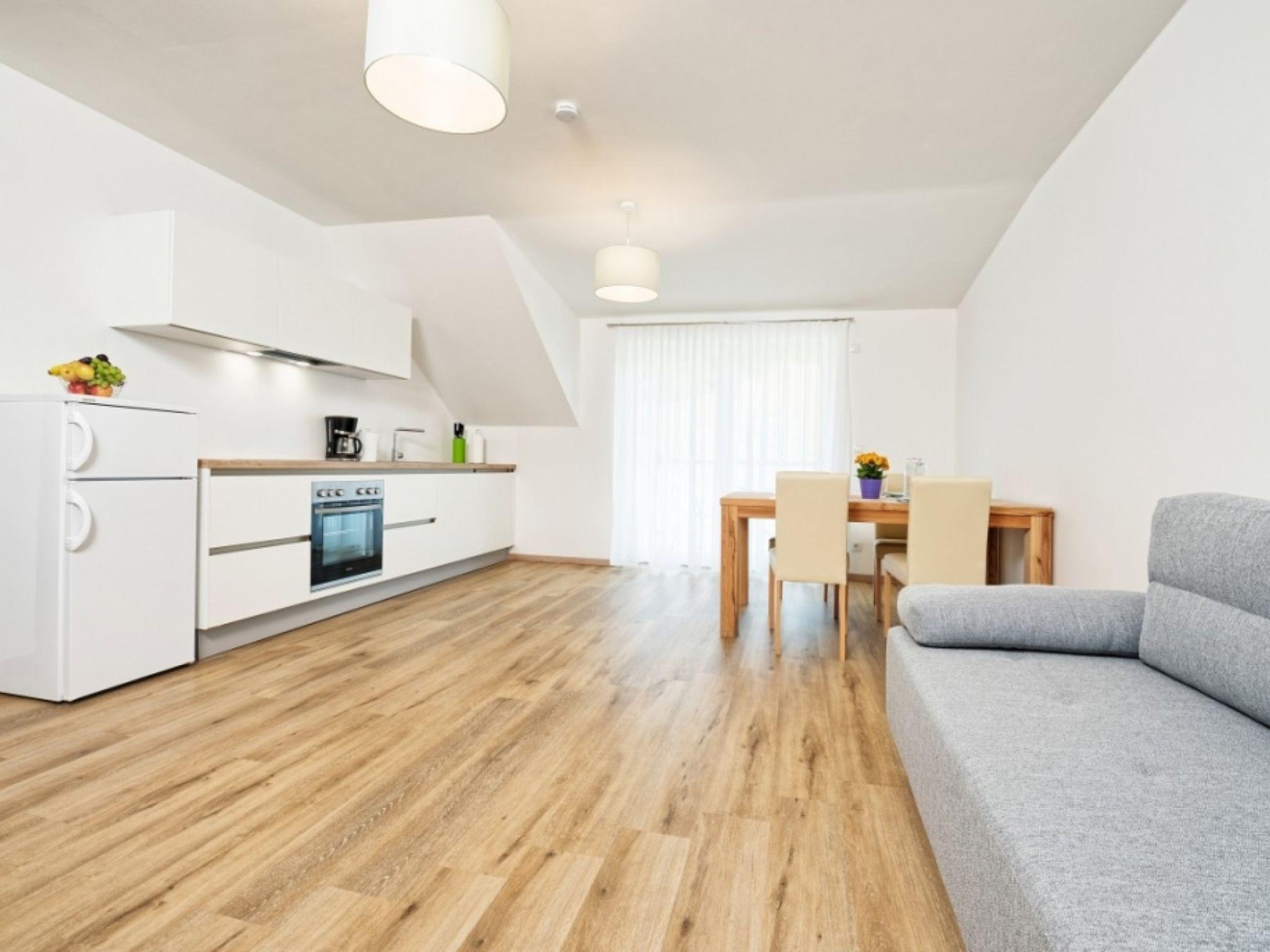 "Elisabeth", 2-room apartment 40 m2, on the top floor, south facing position. Object suitable for 2 adults + 2 children. With sloping ceilings, very comfortable and modern furnishings: living/sleeping room with 1 double sofabed (1 x 140 cm, length 200 cm), satellite TV (flat screen), air conditioning. Exit to the balcony, south facing position. 1 double bedroom with sloping ceilings. Open kitchen (oven, dishwasher, 4 ceramic glass hob hotplates, kettle, electric coffee machine). Shower/WC. Balcony, south facing position. Balcony furniture. Facilities: Internet (WiFi, free). Please note: non-smokers only.
