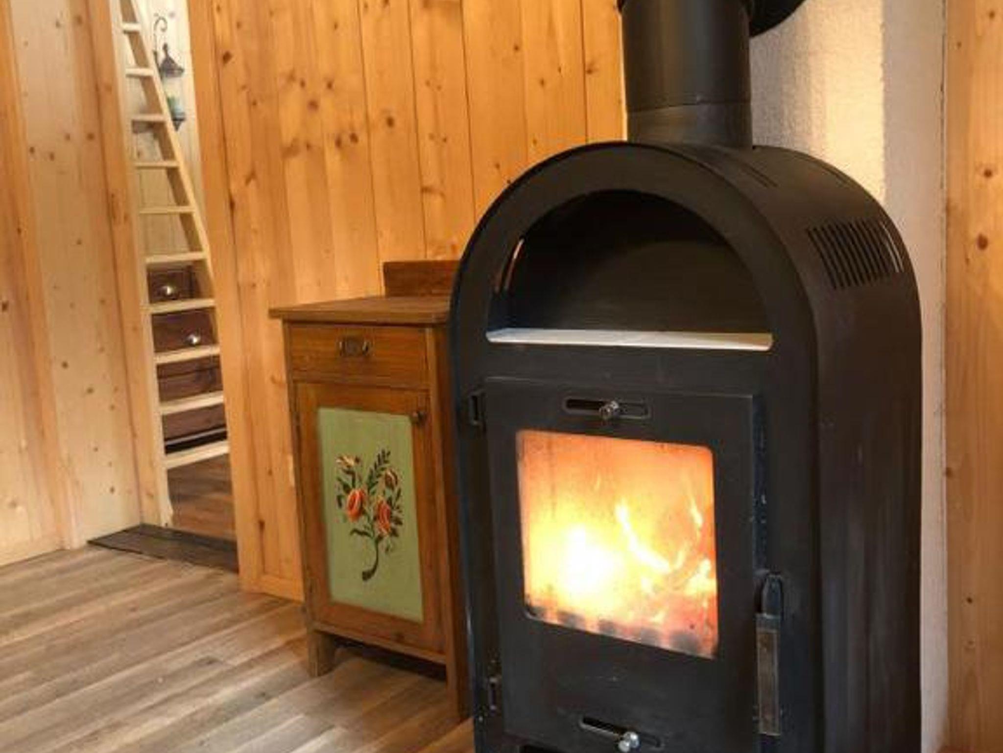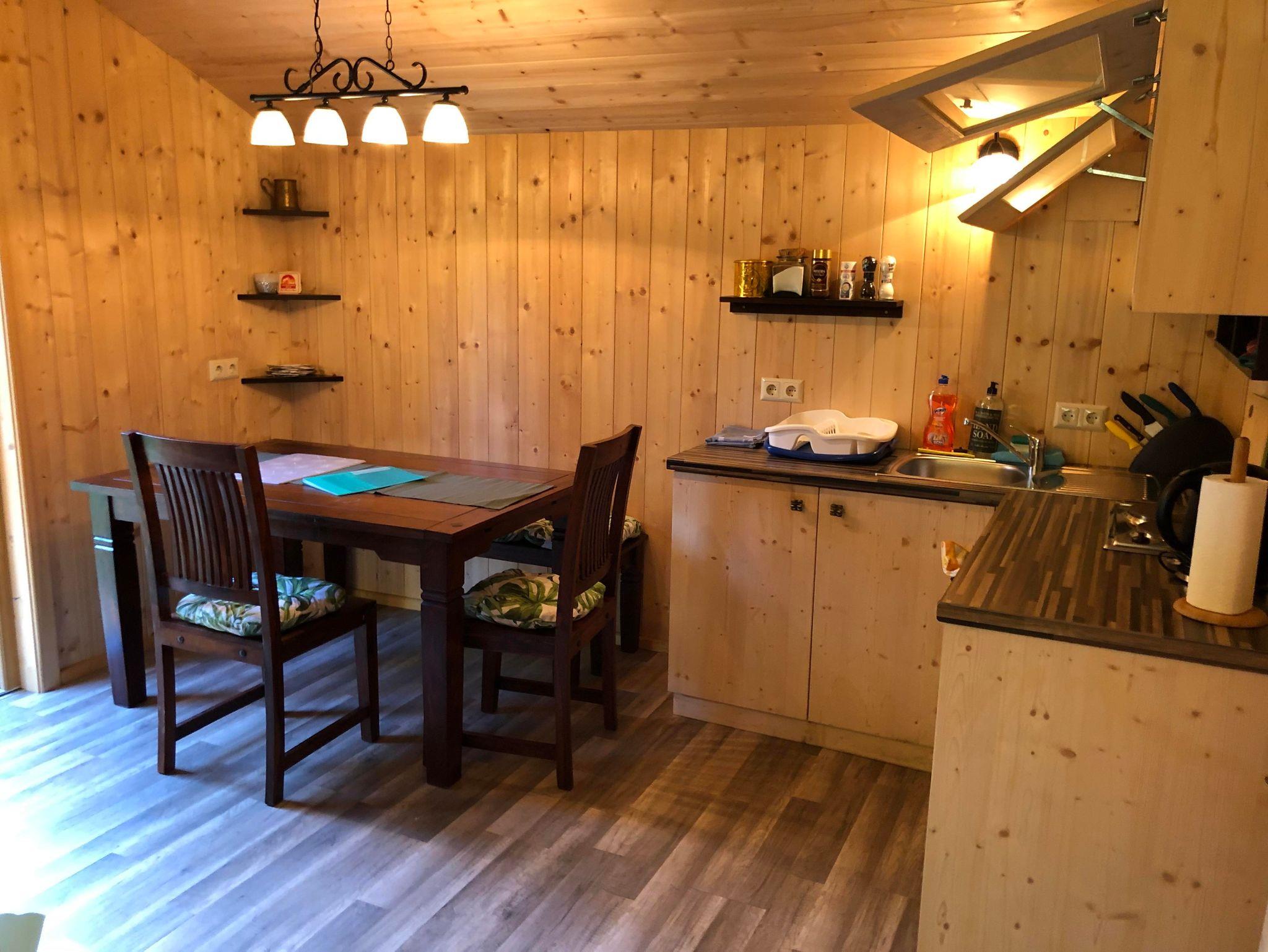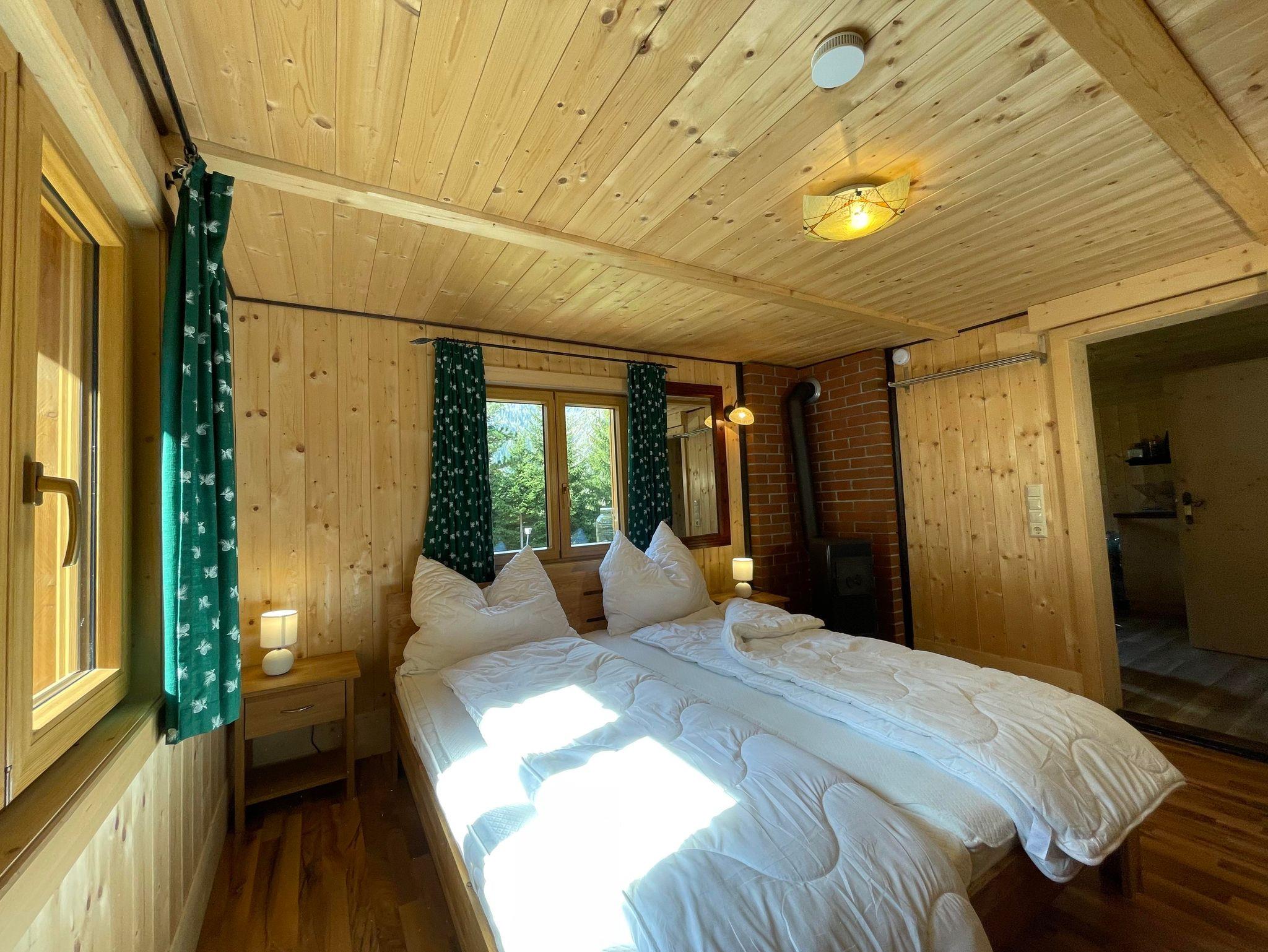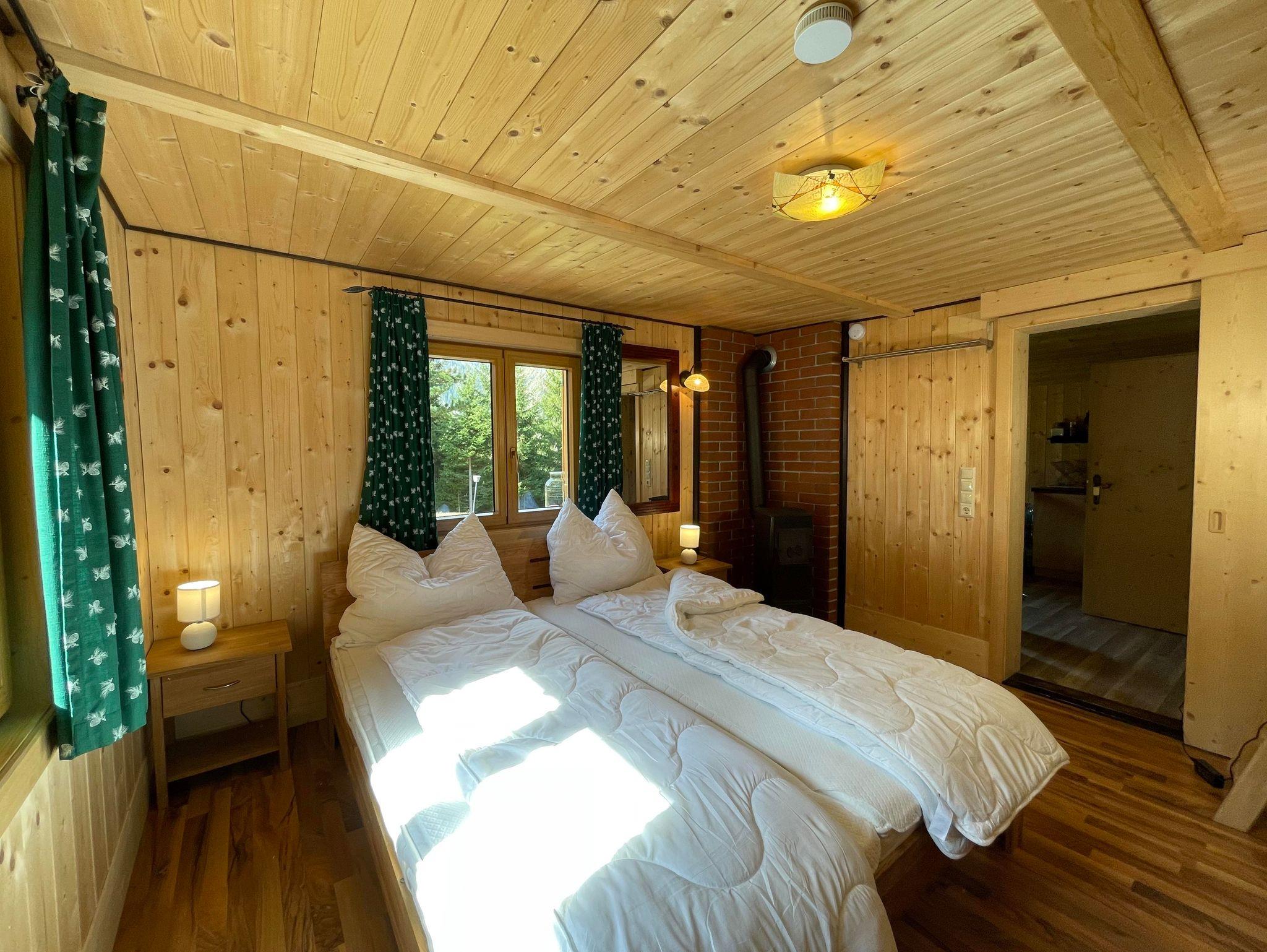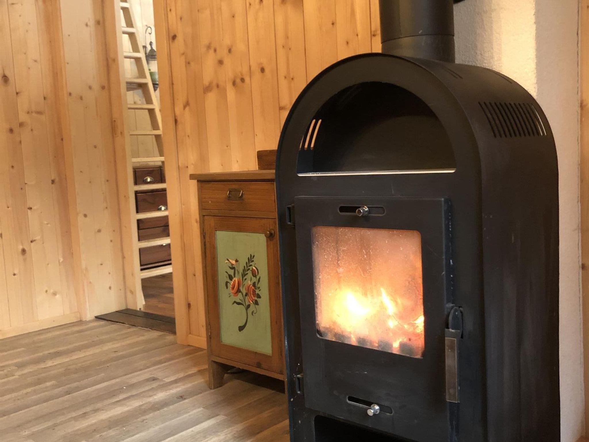 Unser Nocksternchen ist ganz aus Holz. Dusche, WC und Waschbecken, eine kleine Küche mit rustikalen Tisch und Kaminofen und ein lauschiges Doppelzimmer mit kleinen Holzofen sind im Erdgeschoß, auf etwa 45 Quadratmeter für die Gäste da.