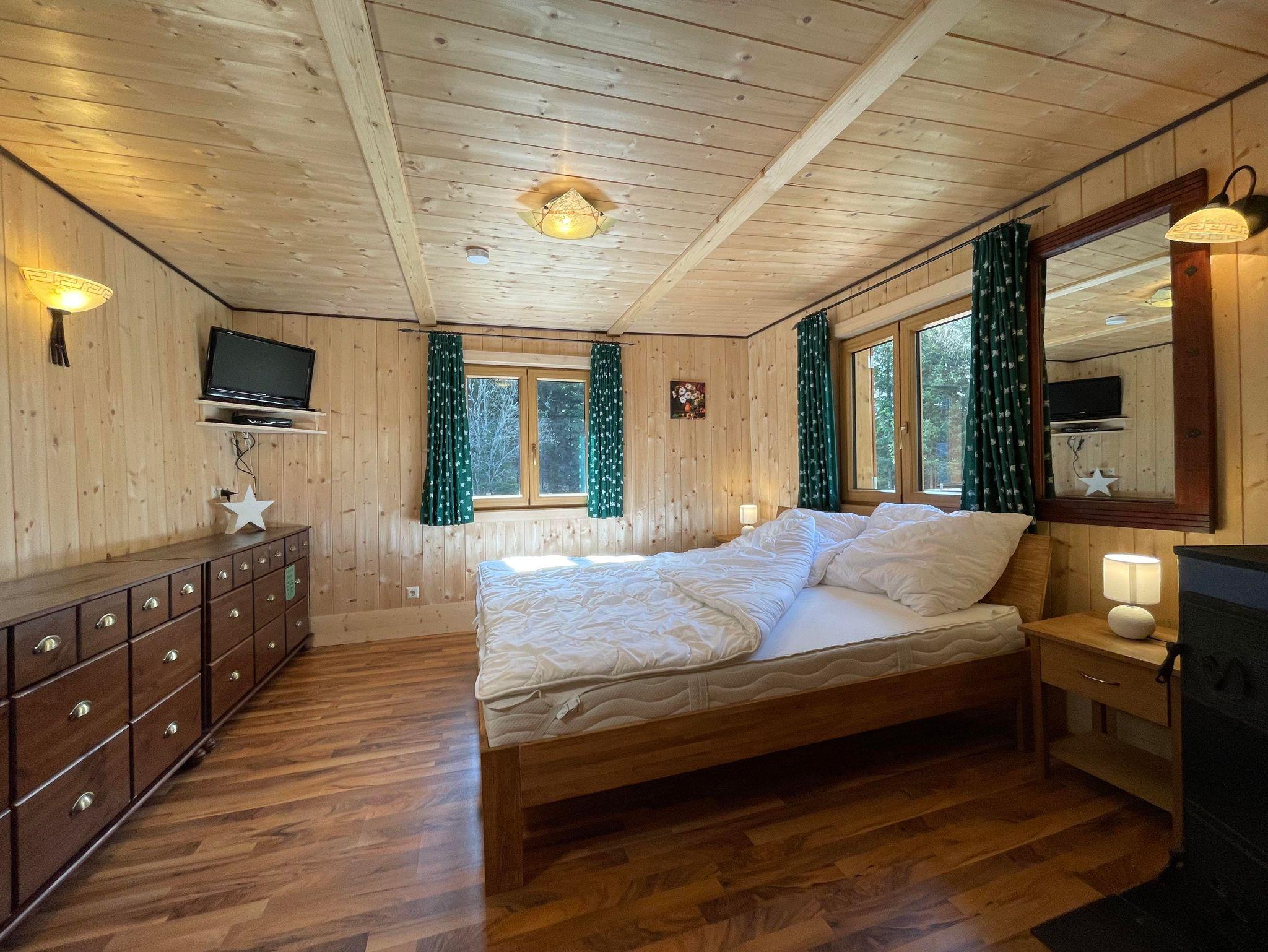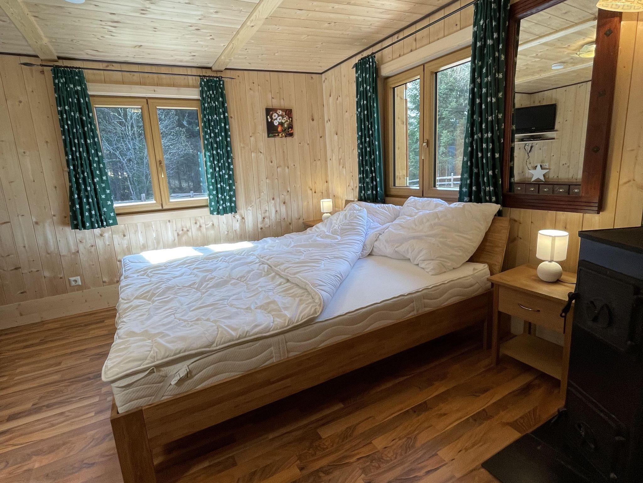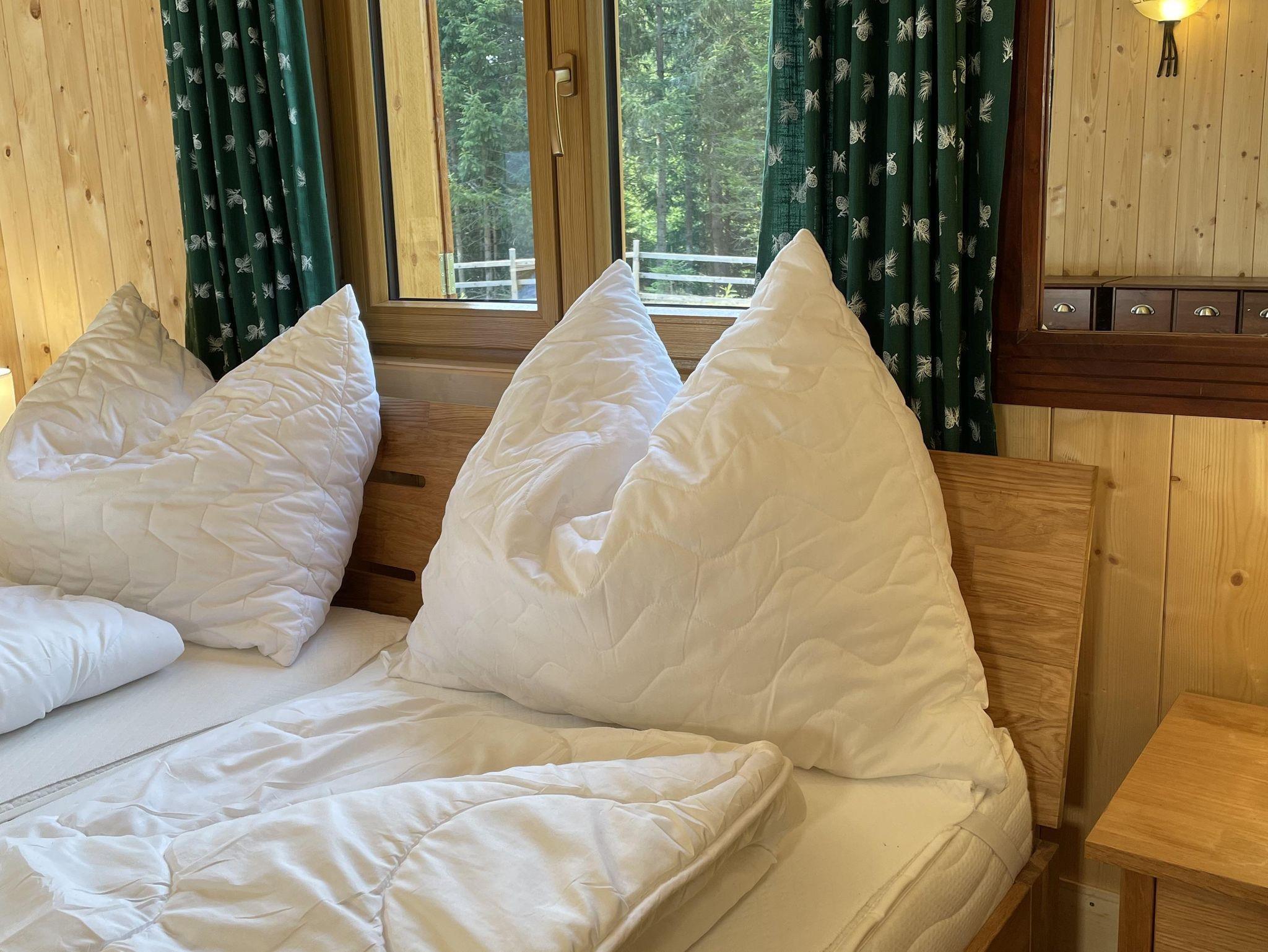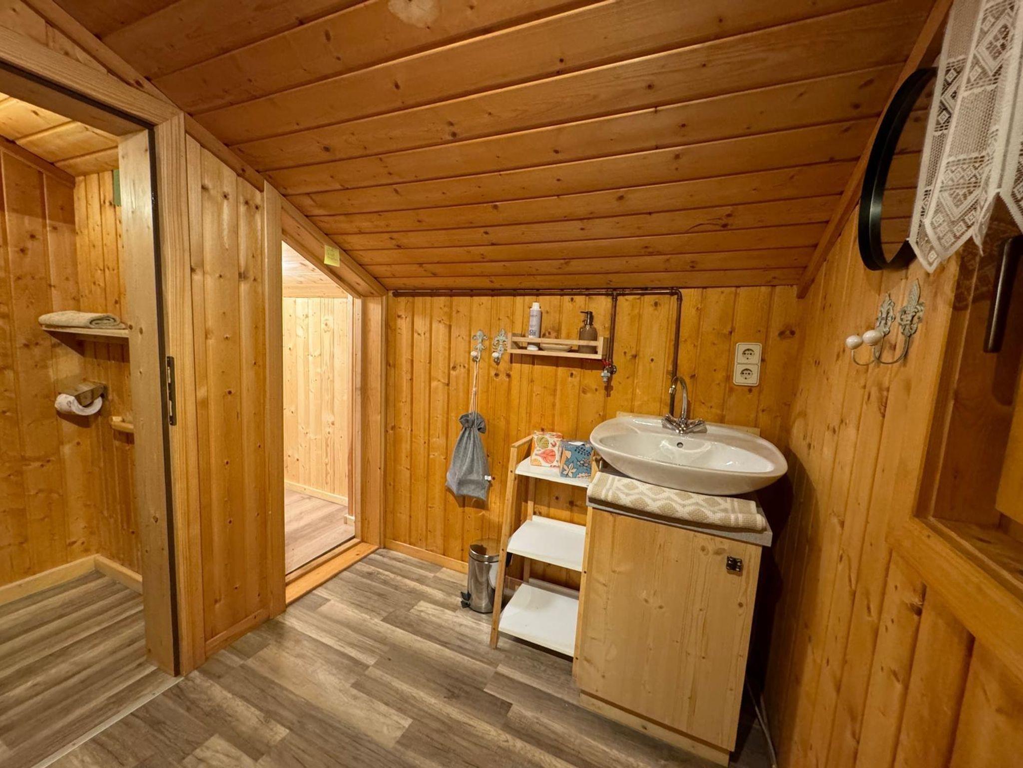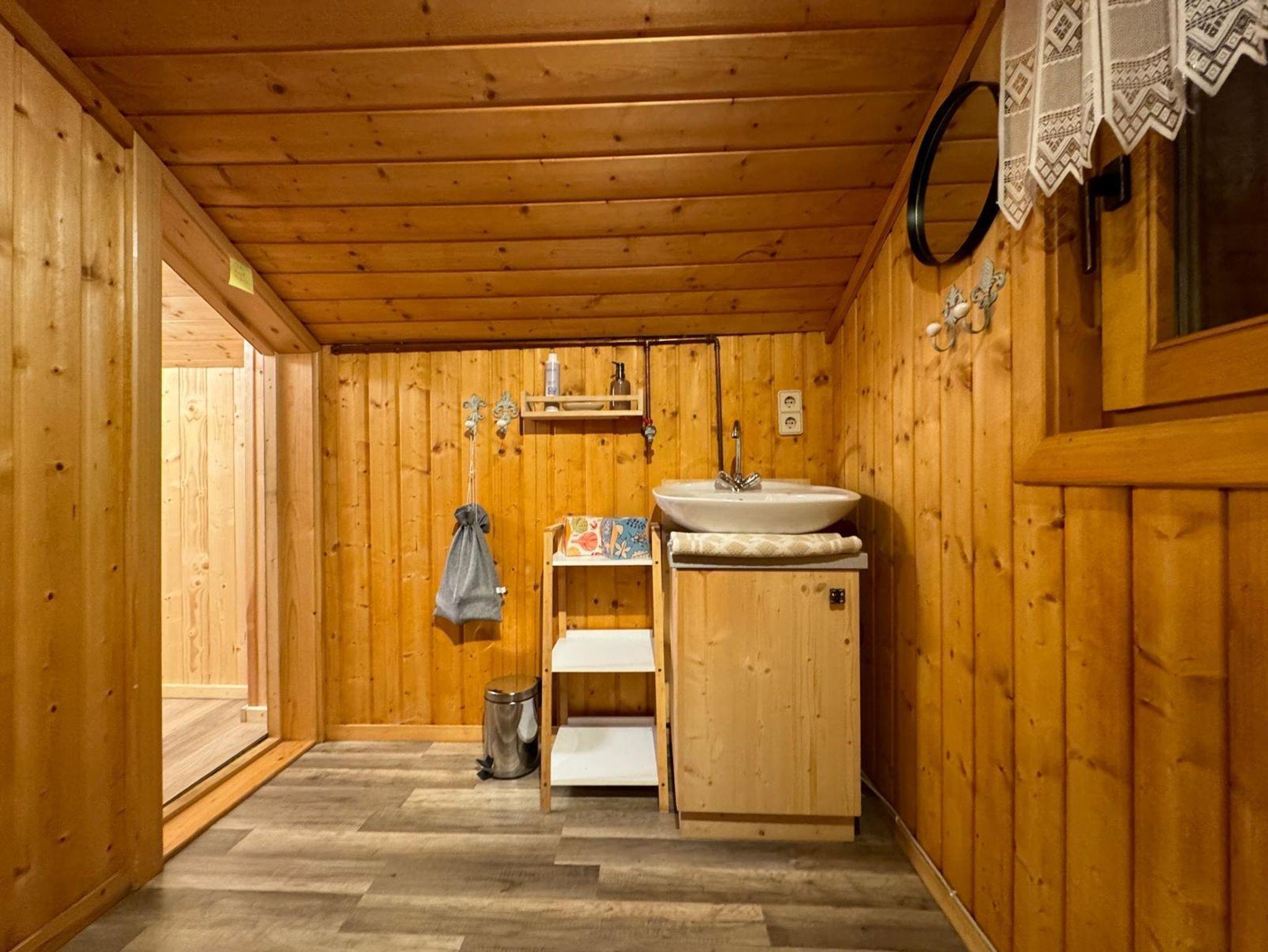 Unser Nocksternchen ist ganz aus Holz. Dusche, WC und Waschbecken, eine kleine Küche mit rustikalen Tisch und Kaminofen und ein lauschiges Doppelzimmer mit kleinen Holzofen sind im Erdgeschoß, auf etwa 45 Quadratmeter für die Gäste da.
