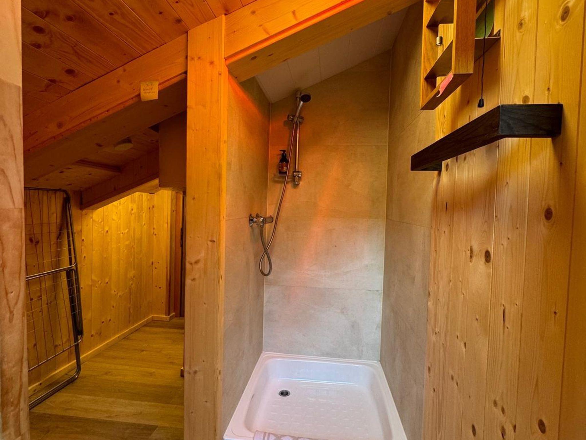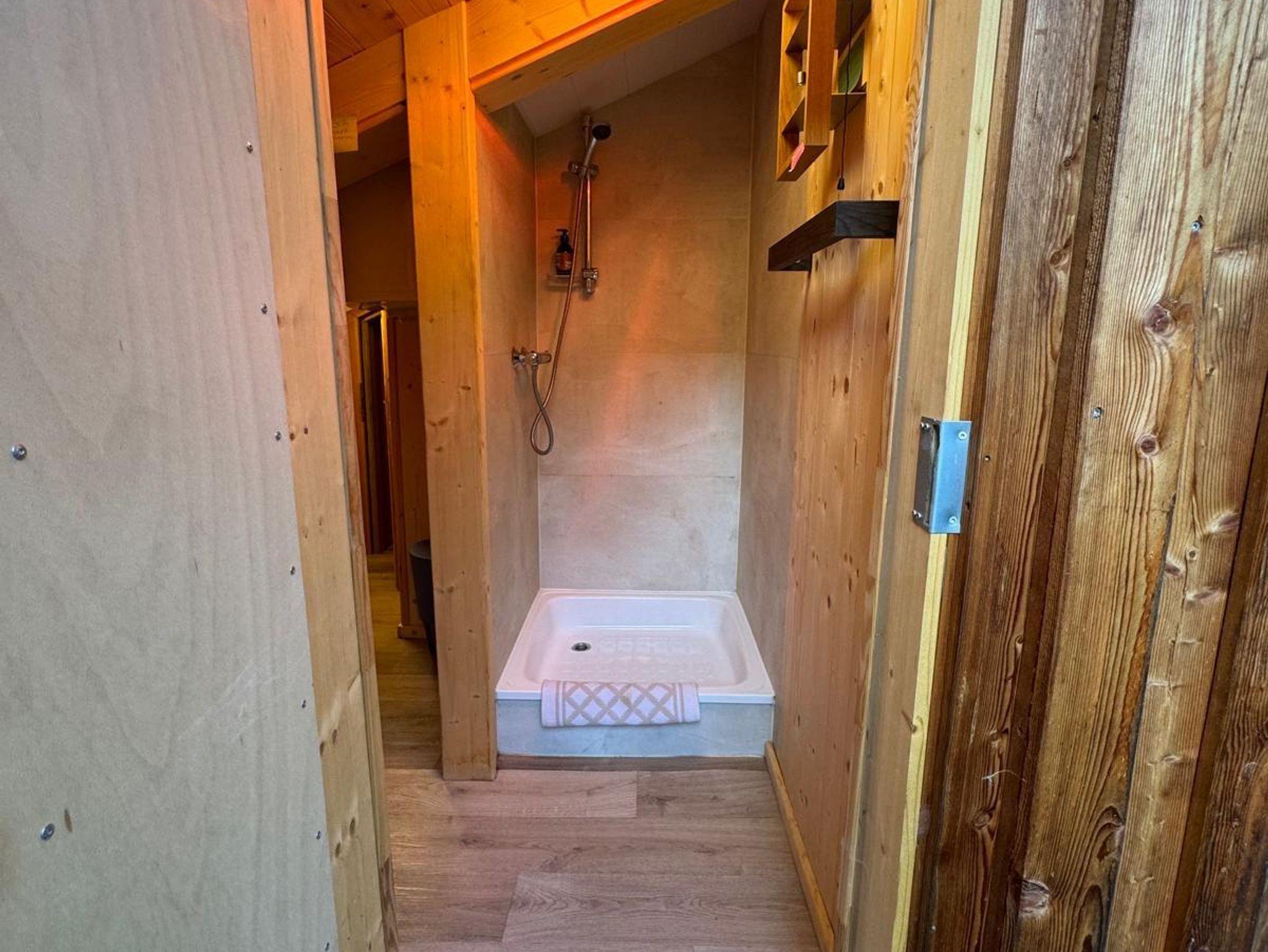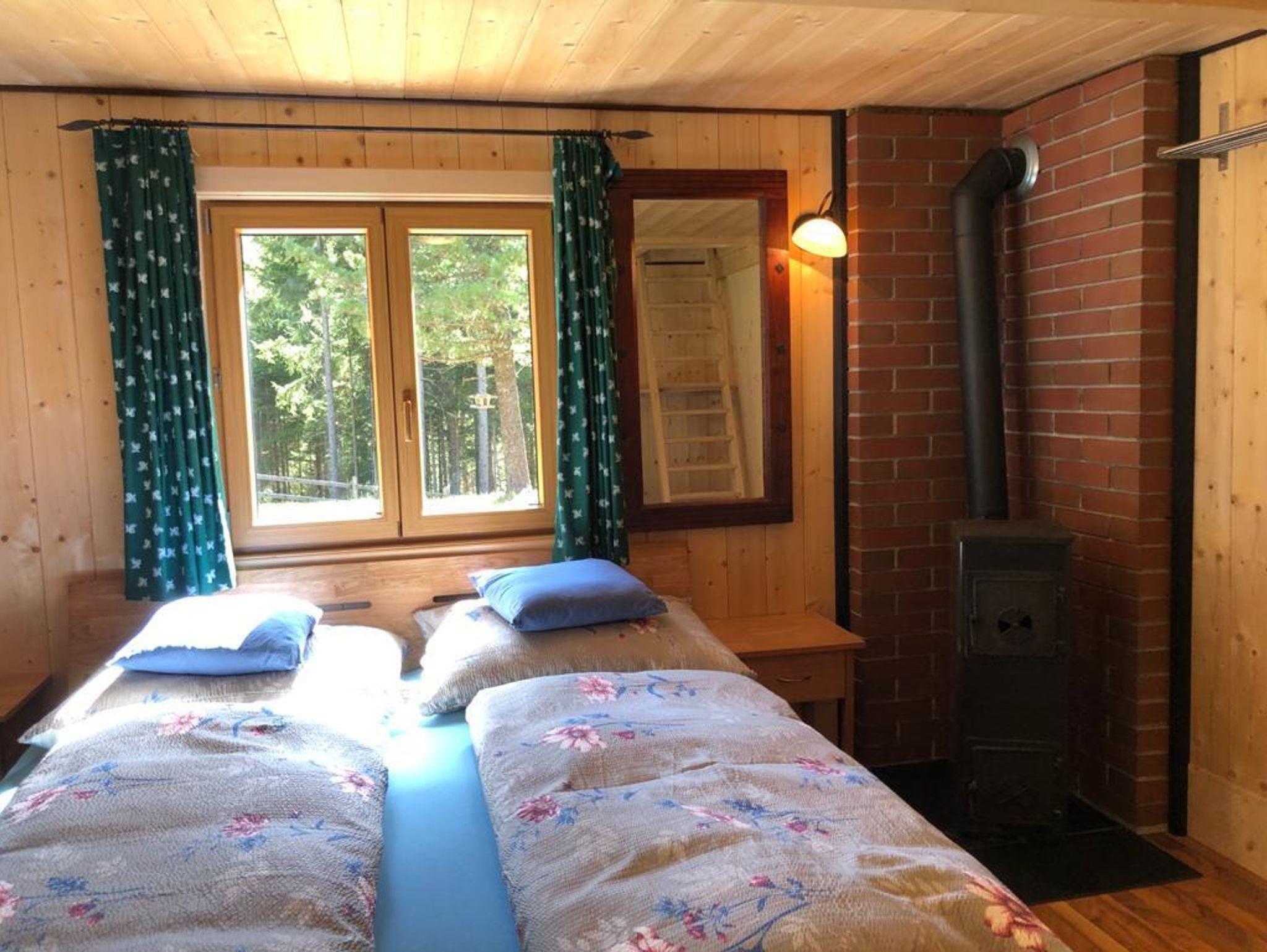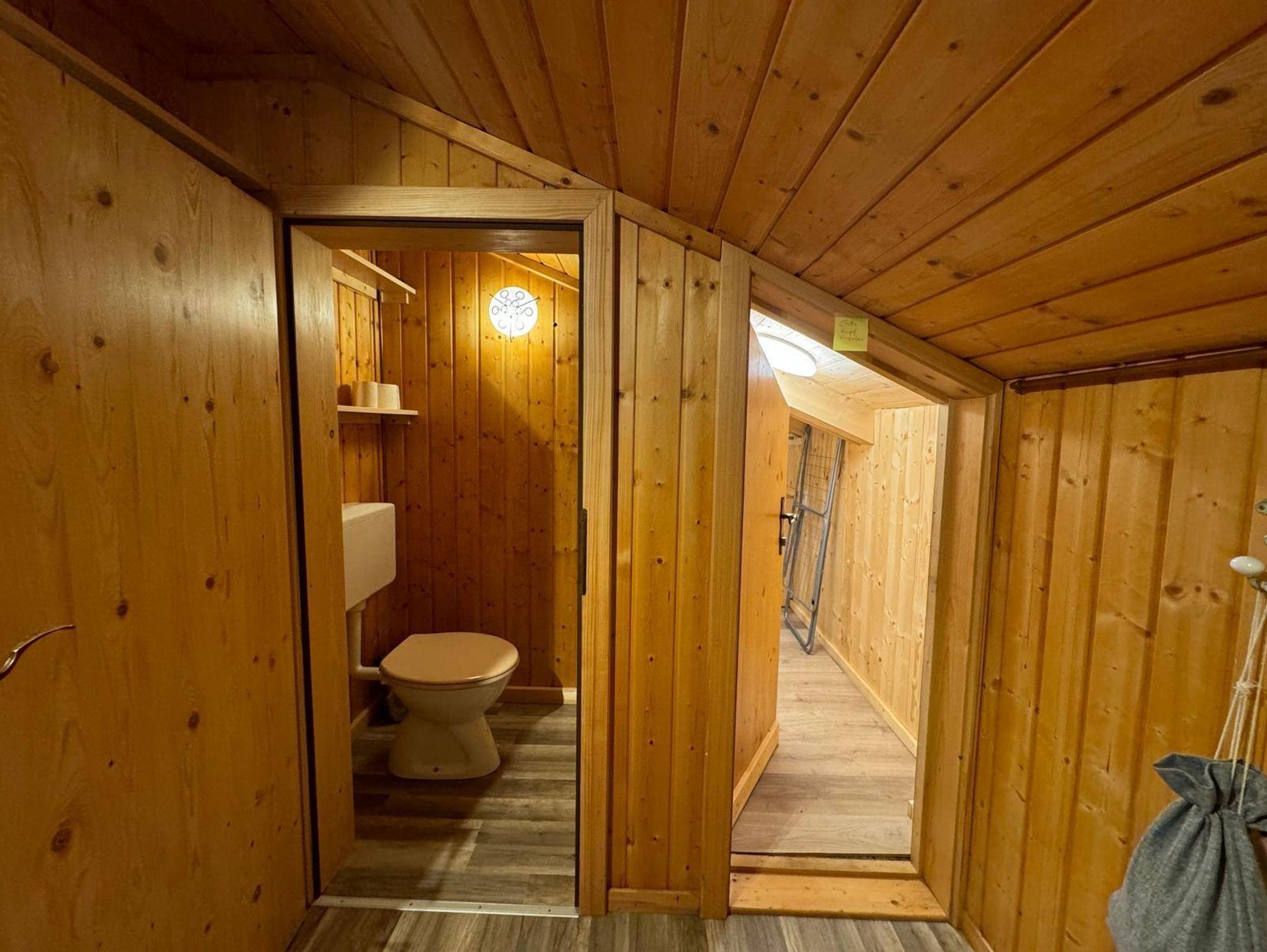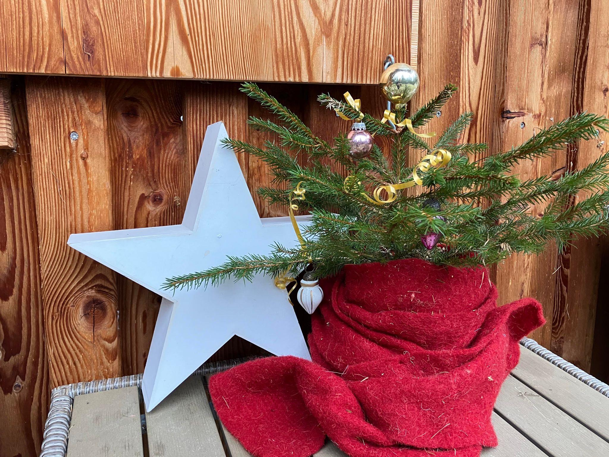 Unser Nocksternchen ist ganz aus Holz. Dusche, WC und Waschbecken, eine kleine Küche mit rustikalen Tisch und Kaminofen und ein lauschiges Doppelzimmer mit kleinen Holzofen sind im Erdgeschoß, auf etwa 45 Quadratmeter für die Gäste da.