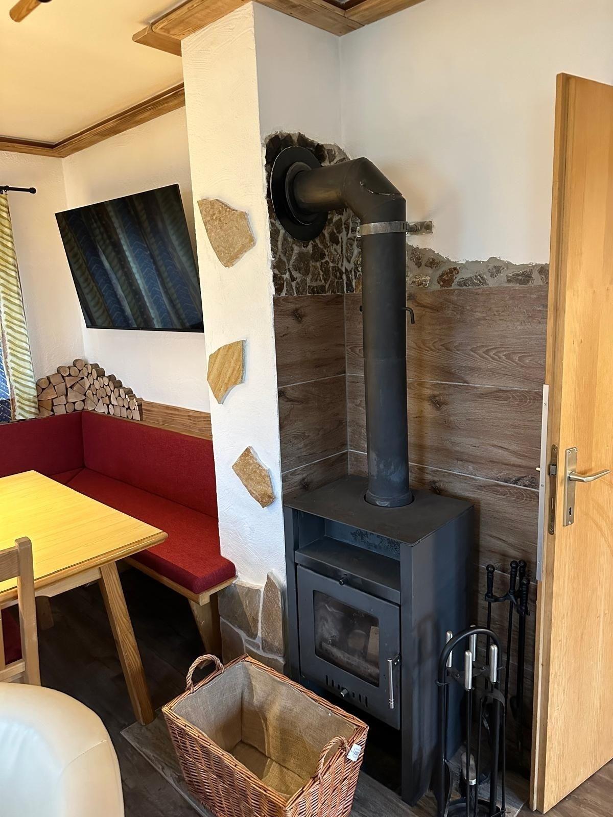 gemütlicher Essbereich mit gepolsteter Eckbank und Stühlen und Schwedenofen