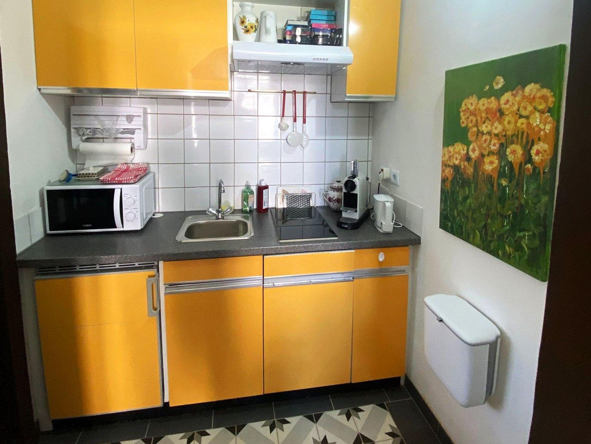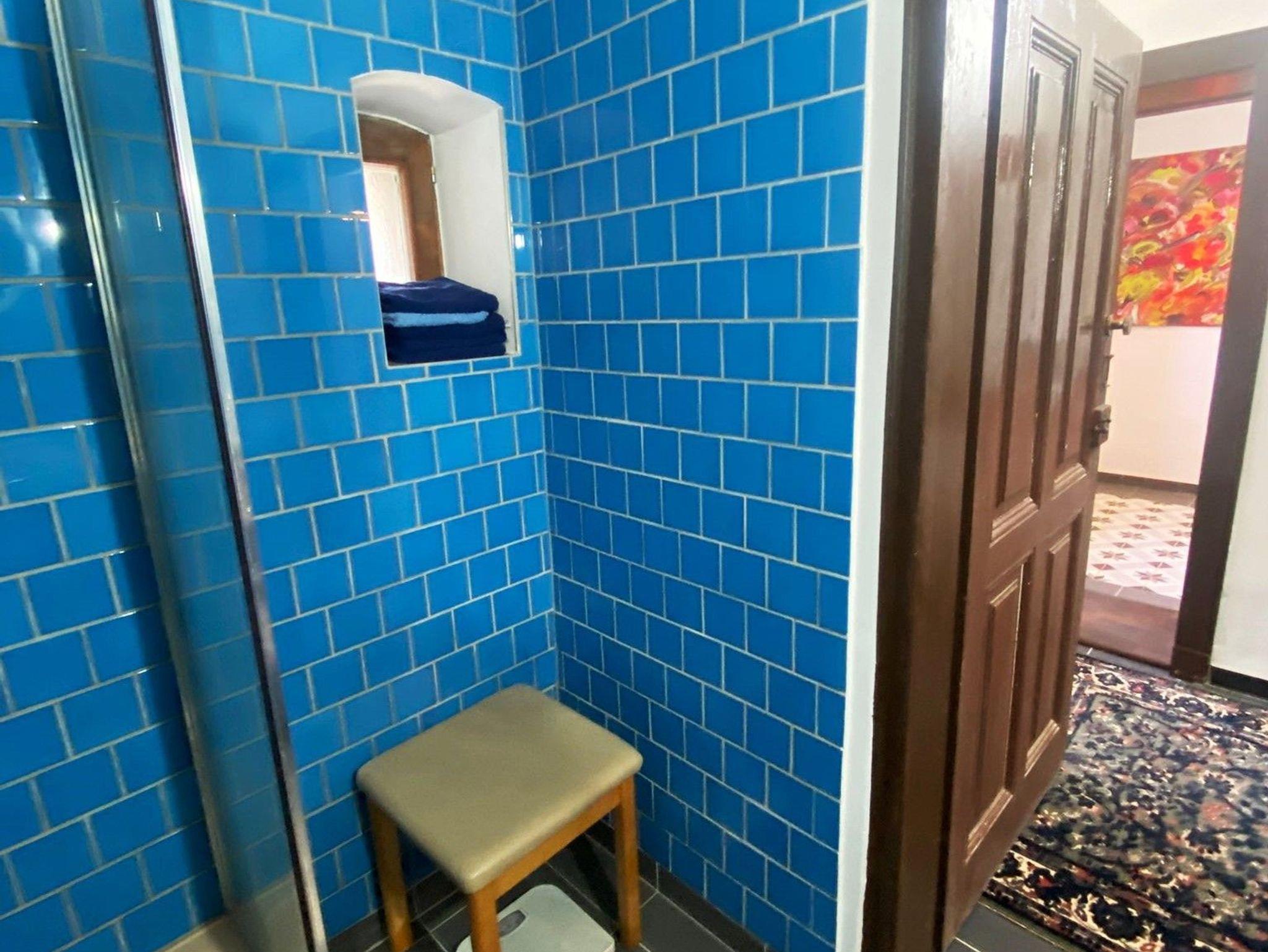 Bei der Restaurierung der Ferienwohnung in Gaas wurde großer Wert auf die Verwendung originalgetreuer Materialien gelegt. Der Unterboden wurde saniert und wir haben keine Feuchtigkeit. Wände und Decken wurden ausgebessert und mit frischem Kalkputz versehen. Kalkputz bindet auf natürliche Weise Dämpfe und Gerüche und sorgt so für ein angenehmes und gesundes Raumklima. Auch die originalen Fenster, Zwischentüren und Eingangstüren wurden sorgfältig restauriert: Sie wurden geradegerichtet, gehobelt, gespachtelt und anschließend mit reiner Leinölfarbe gestrichen in einem warmen Sepiabraun. Leinölfarbe ist ein reines Naturprodukt, das keine Lösungsmittel oder chemischen Zusätze enthält. Sie riechen den typischen frischen Kalk- und Leinölgeruch. Das Interieur und die Gebrauchsgegenstände der Ferienwohnung sind größtenteils über 30 Jahre alt, aber in hervorragendem Zustand sorgfältig gepflegt, repariert und gereinigt. So finden Sie beispielsweise einen Stabmixer aus den 1970er-Jahren, ein Besteck der Marke Berndorf, ein Kaffeeservice aus den 70ern mit fröhlichen orangen Blümchen, die Vorhänge stammen aus der Villa einer bekannten Kammersängerin. Die Sanitäranlagen sind modern, während Spiegel, Leuchten und die Badezimmermöbel authentische Stücke aus der Zeit vor über 50 Jahren sind. Insgesamt ist die Einrichtung der Ferienwohnung bunt und abwechslungsreich und schafft eine interessante, einladende und fröhliche Atmosphäre. Meine Gäste in der Ferienwohnung in Gaas werden nicht frieren. Unsichtbar aber angenehm spürbar sorgt eine moderne Fußbodenheizung für gesunde Wärme im Winter und Kühle im Sommer. Sämtliche Leitungen, Installationen und Elektrik entsprechen dem modernsten Standard. Zusätzlich finden Sie ein Infrarotpanel im Essbereich und im Schlafzimmer einen Deckenventilator.