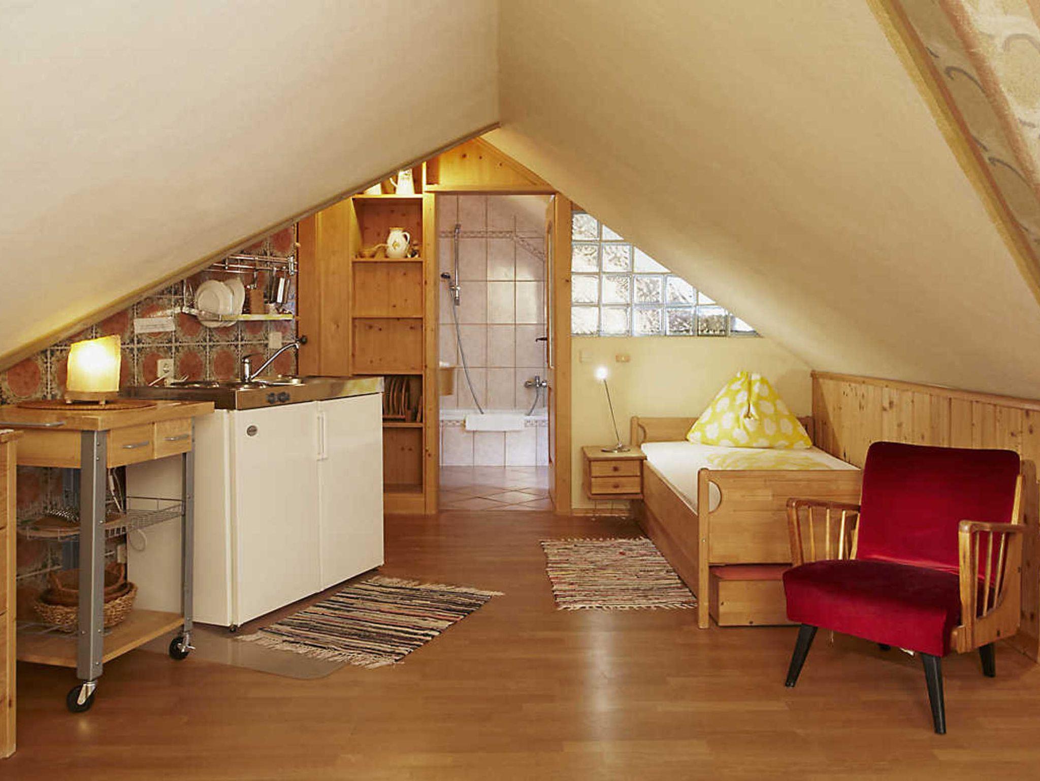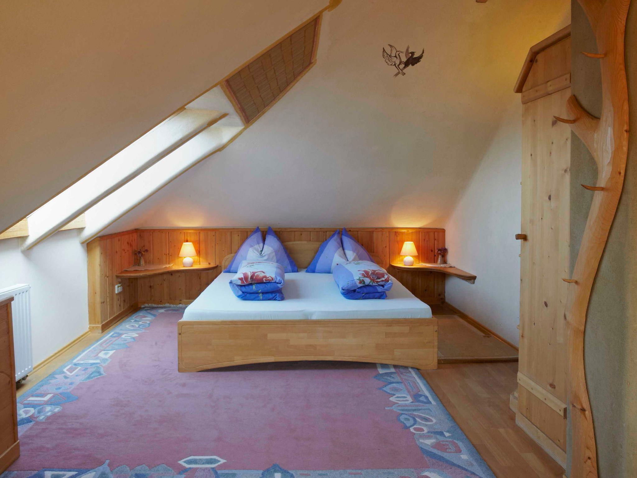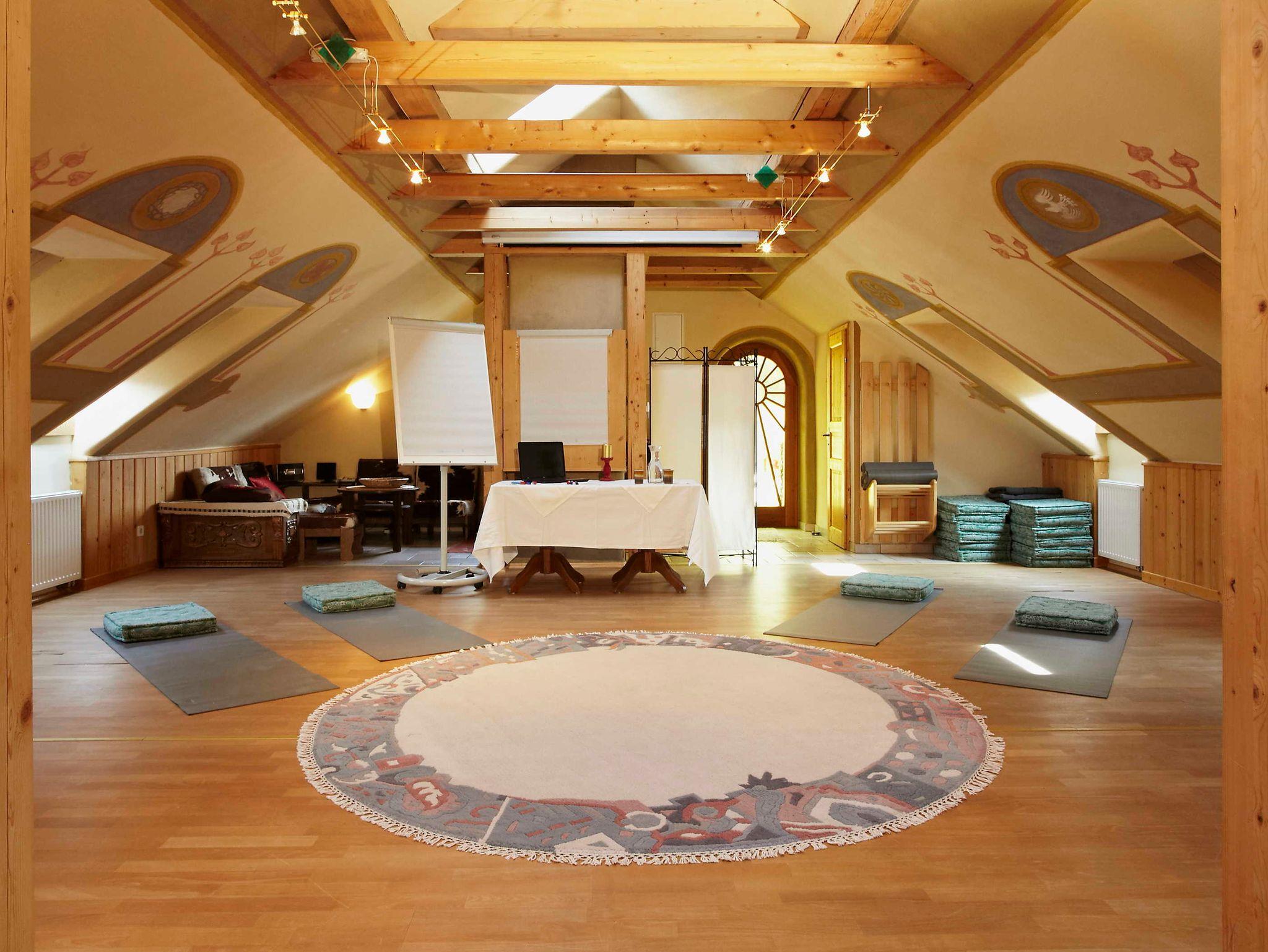 Sonnenquelle-Dachappartement, 40 gm, für 2 bis 4 Personen, teilweise mit Seminarraum 120 qm insgesamt alleine nutzbar, Miniküche, Lehmputz, Vollholzbad