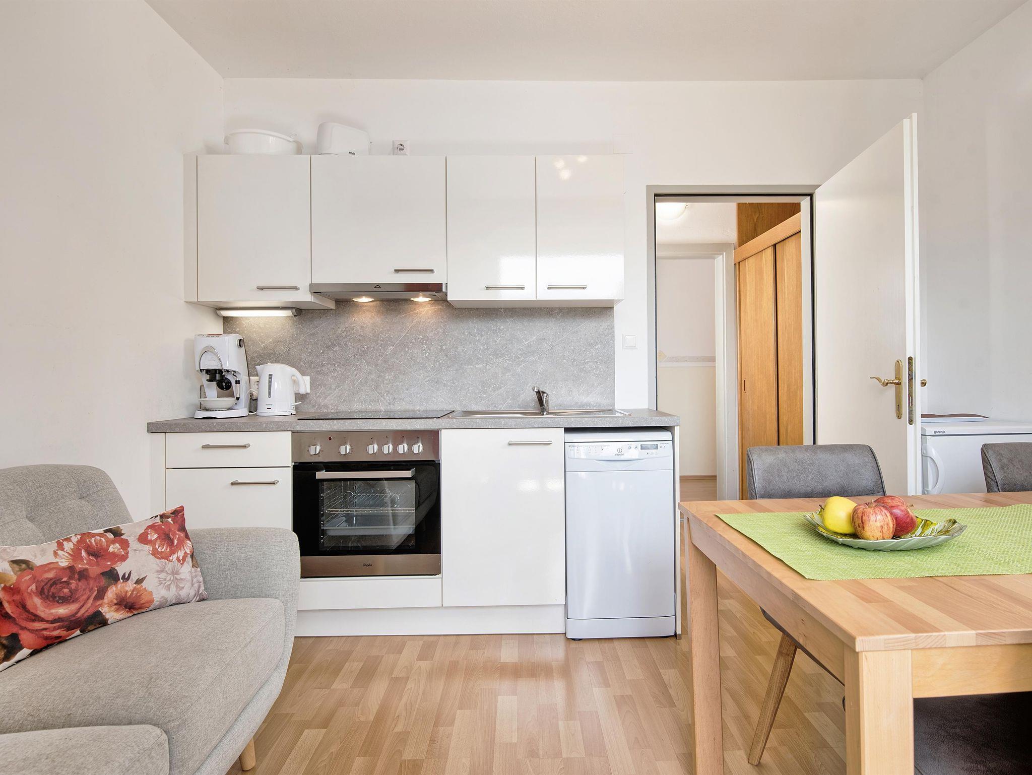 • 1 Küche mit gemütlichem Essplatz, Herd inkl. Backrohr, Kaffeemaschine (Espressomaschine), Wasserkocher sowie Geschirrspüler