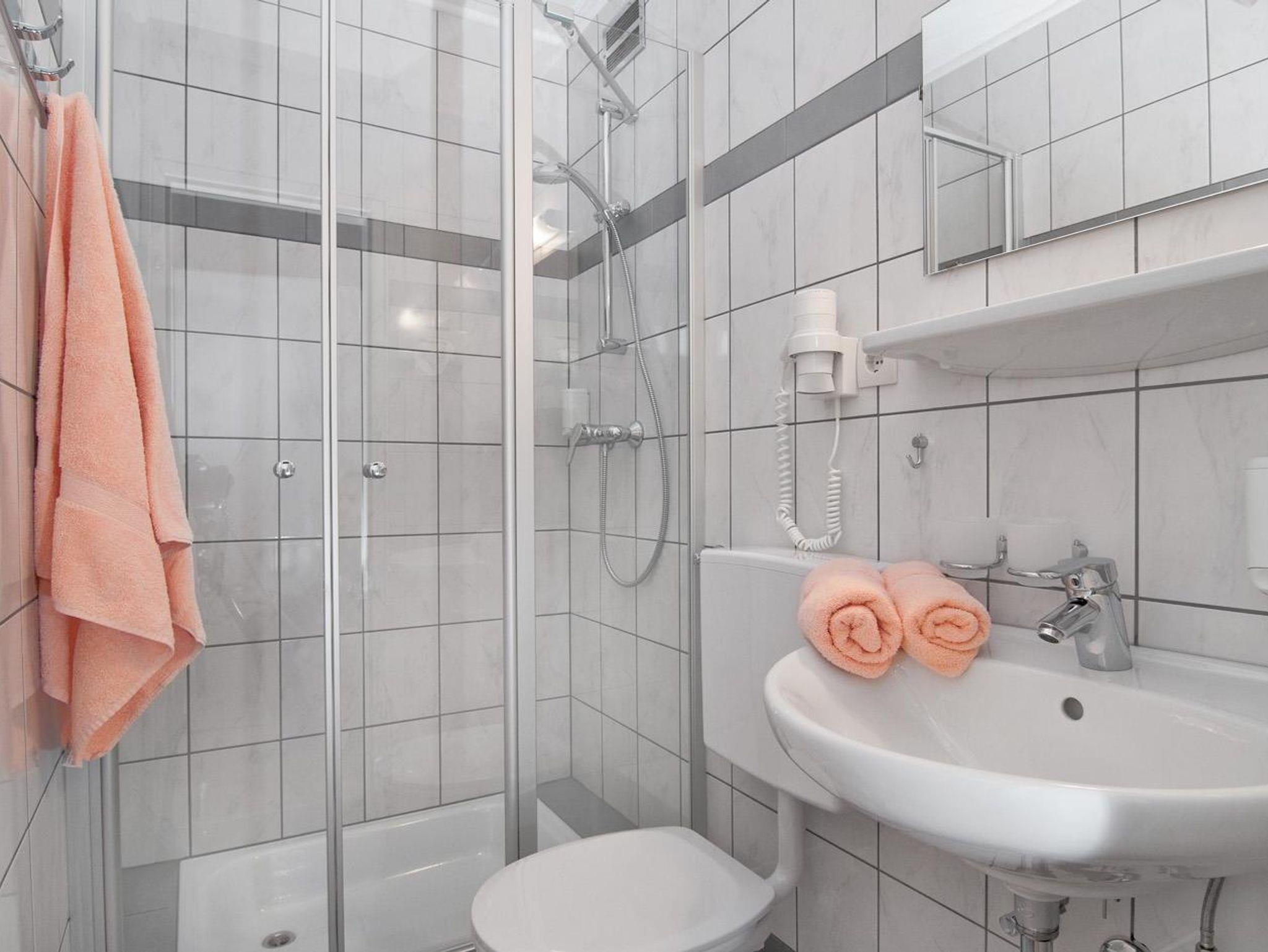 • 1 Badezimmer mit Dusche und WC, Fön, Kosmetik- und Handtücher und Duschgel