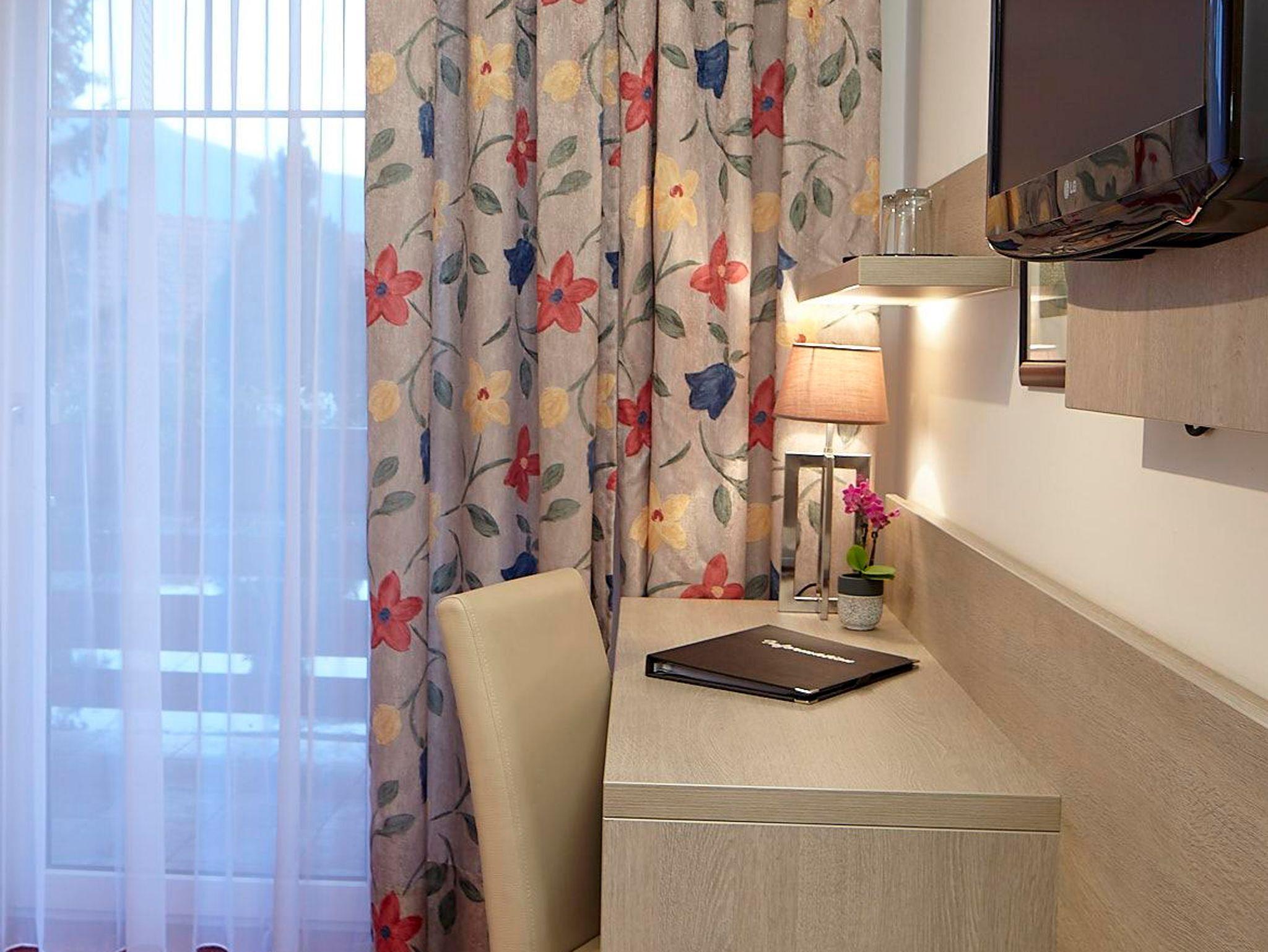 Alle Zimmer verfügen über ein eigenes Badezimmer mit Pflegeartikeln, Föhn und Safe sowie einen Schreibtisch bzw. Tisch mit zwei Stühlen.