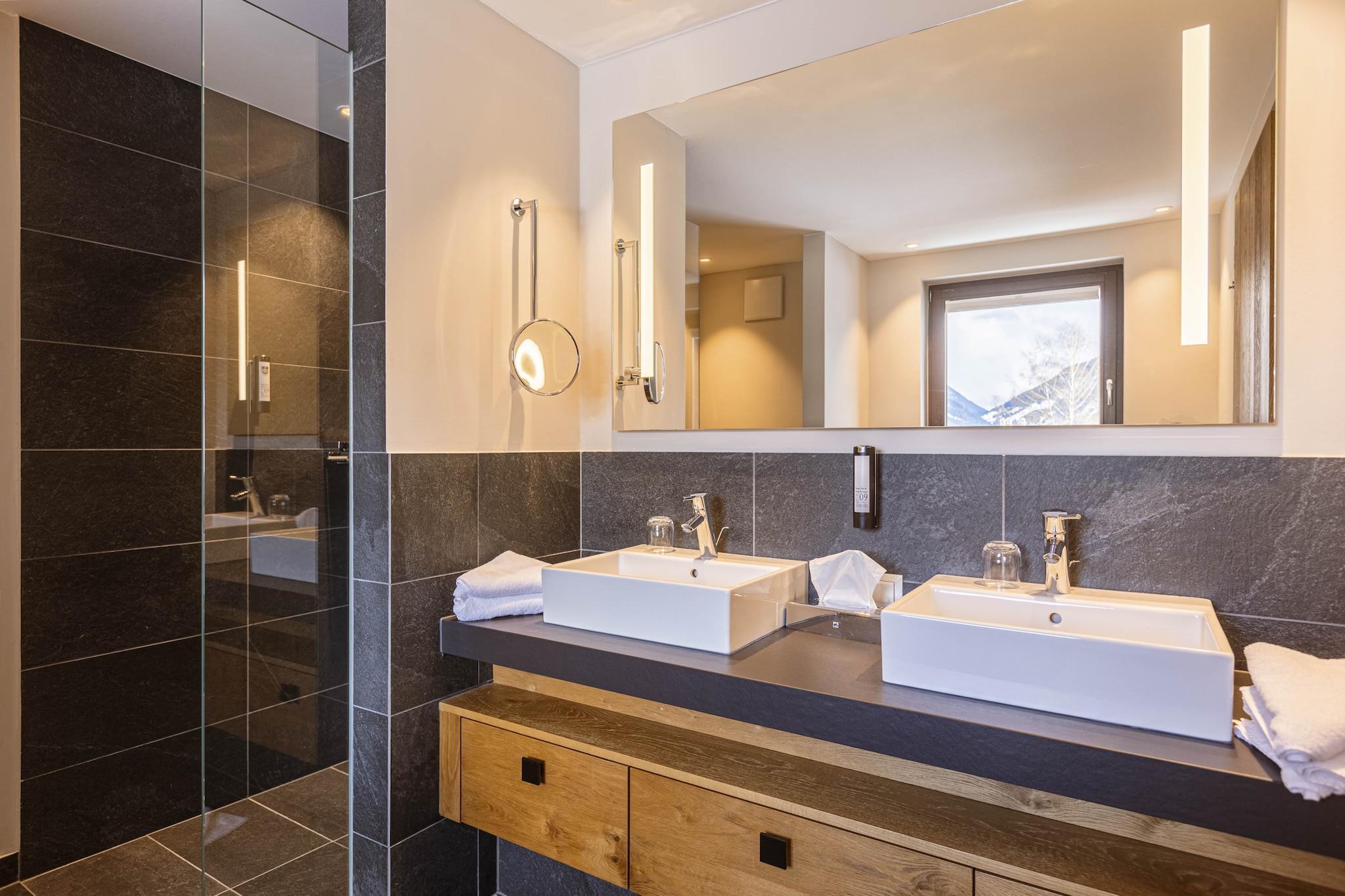 Bergresort Zugspitze Ehrwald tilbyder det perfekte ferieophold med morgenmad inkluderet for en afslappet start på din dag. Denne rummelige hytte på 136 m² kan rumme op til 8 gæster komfortabelt. Det har 4 soveværelser, herunder 3 dobbeltsenge og 1 fransk dobbeltseng, samt 3 badeværelser med bruser og toilet samt et ekstra badeværelse med bruser, alle udstyret med hårtørrer. Et soveværelse og et badeværelse er placeret i stueetagen, hvilket gør det ideelt for gæster med begrænset mobilitet. Hytten har også et fuldt udstyret køkken og en generøs 80 m² privat have. Køkkenet i opholds- og spiseområdet i åbent plan omfatter bestik, køkkengrej, en keramisk kogeplade, mikroovn, køleskab med fryser, opvaskemaskine, elkedel og en Nespresso-kaffemaskine. Et lille startsæt med tabletter til opvaskemaskine, opvaskemiddel (20 ml), svampe, affaldsposer, rengøringsklude og håndklæder leveres ved ankomst. Højdepunktet i denne premium chalet er uden tvivl den private have, der tilbyder en fantastisk udsigt syd for Zugspitze-bjerget - det perfekte sted at planlægge dit næste eventyr. Der er gratis trådløs internetadgang overalt på ejendommen. Gæsterne kan også nyde resortets wellness-område, komplet med en opvarmet udendørs pool, saunaer (biosauna, finsk sauna, infrarød sauna), et dampbad og et fitnessrum. Restauranten serverer lækre måltider, og morgenmad er inkluderet Zugspitz Arena Bayern-Tirol-kortet er til rådighed for ekstra fordele, og gratis underjordisk parkering er tilgængelig. Hver hytte er unikt indrettet, og alle billeder er til illustrative formål.