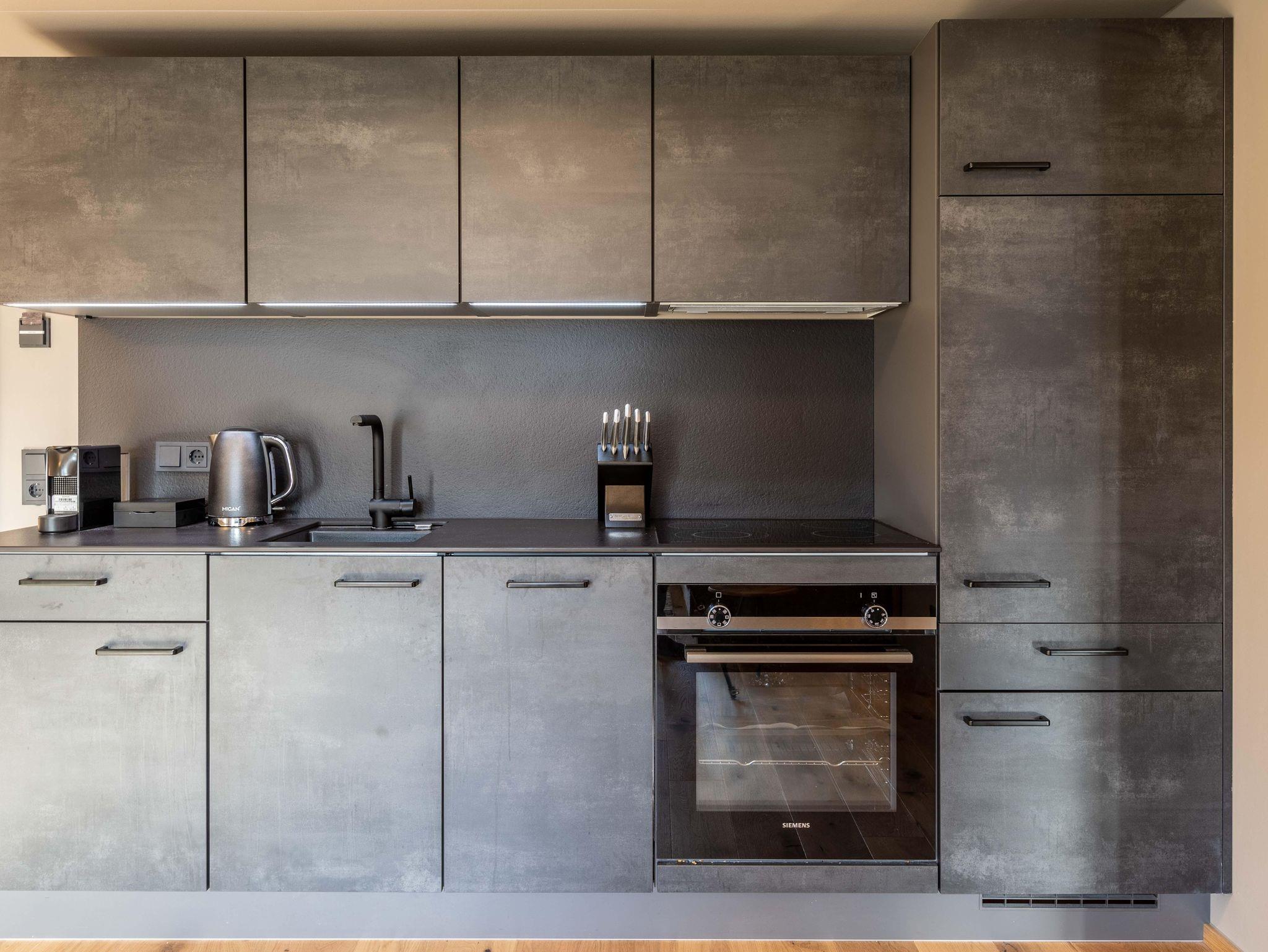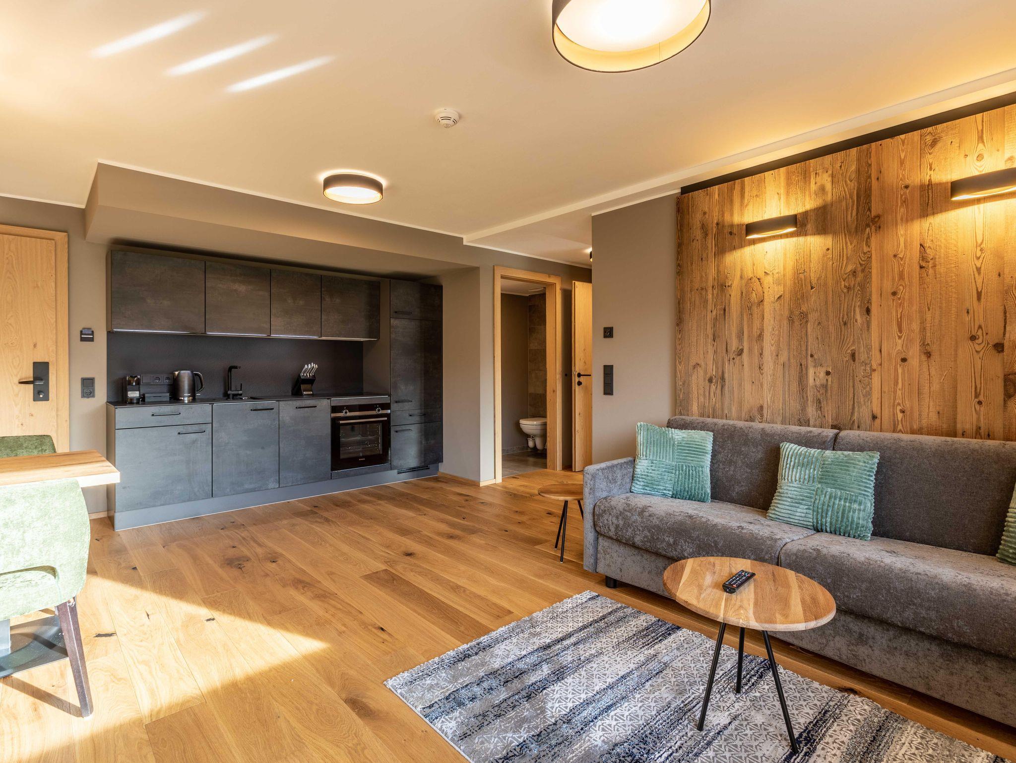 Das Apartment hat Platz für 4 Personen und bietet Wohnküche, Schlafzimmer (Boxspringbett und Balkonzugang), Bad und separates WC. Der Eingangsbereich, mit Garderobe, führt direkt in die Wohnküche mit Essbereich (Balkongzugang), welcher mit Esstisch, TV, Kleiderschrank und einem Ausziehsofa aufwartet. Die angrenzende Küche ist mit Küchengeräten, Kühl-Gefrierkombi sowie Nespresso Kaffeemaschine ausgestattet und verfügt außerdem über Küchengeschirr inklusive Töpfe und Pfannen.
