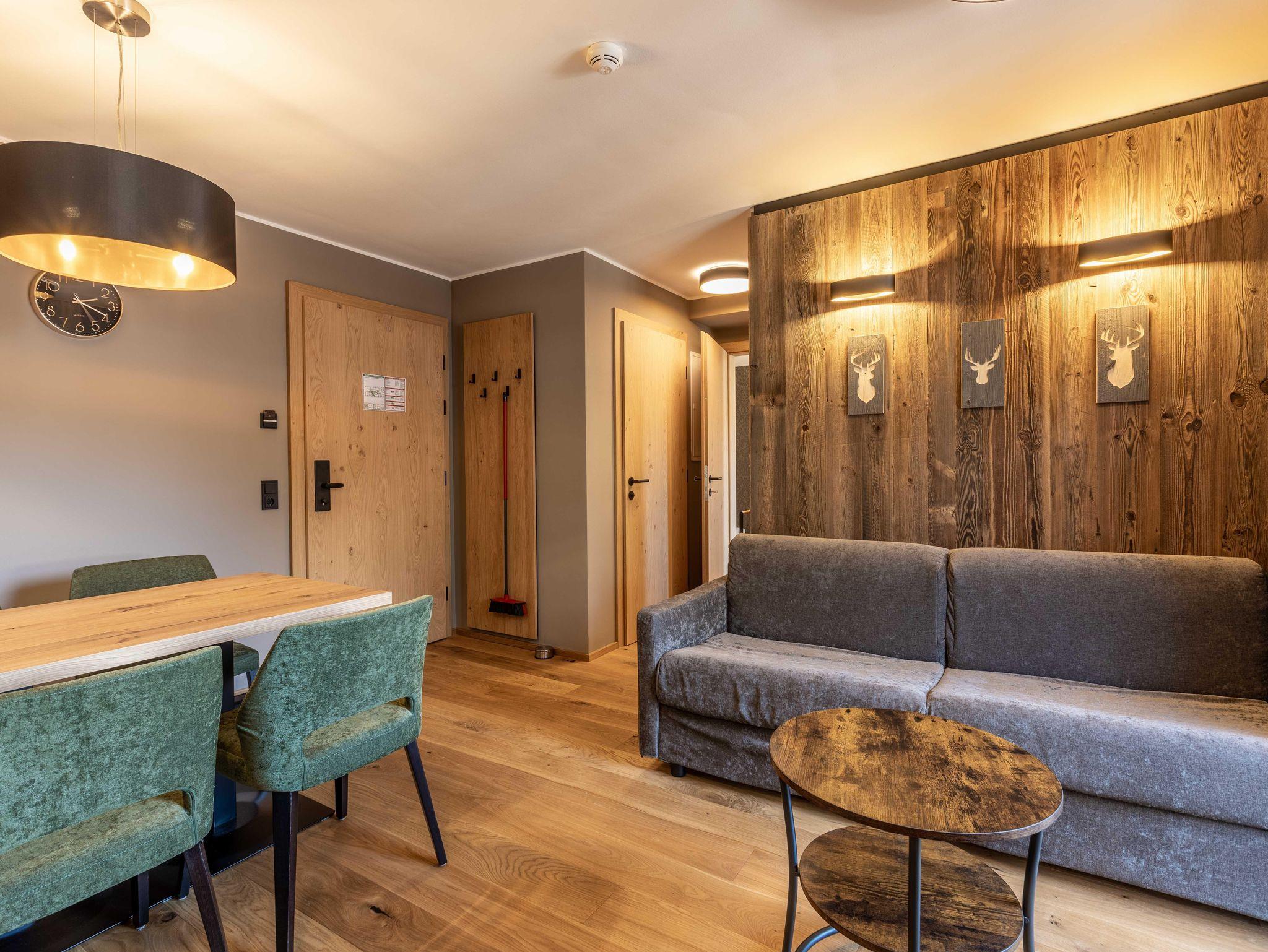 Das Apartment für 4 Personen bietet Wohnküche, Schlafzimmer (Boxspringbett Balkonzugang), Badezimmer und ein separates WC. Der Eingangsbereich, mit Garderobe, führt direkt in den Wohn und Essbereich (Balkonzugang), welcher mit Esstisch, TV, Kleiderschrank und einem Ausziehsofa aufwartet. Die angrenzende Küche ist mit Küchengeräten, Kühl-Gefrierkombi sowie Nespresso Kaffeemaschine ausgestattet und verfügt außerdem über Küchengeschirr inklusive Töpfe und Pfannen.