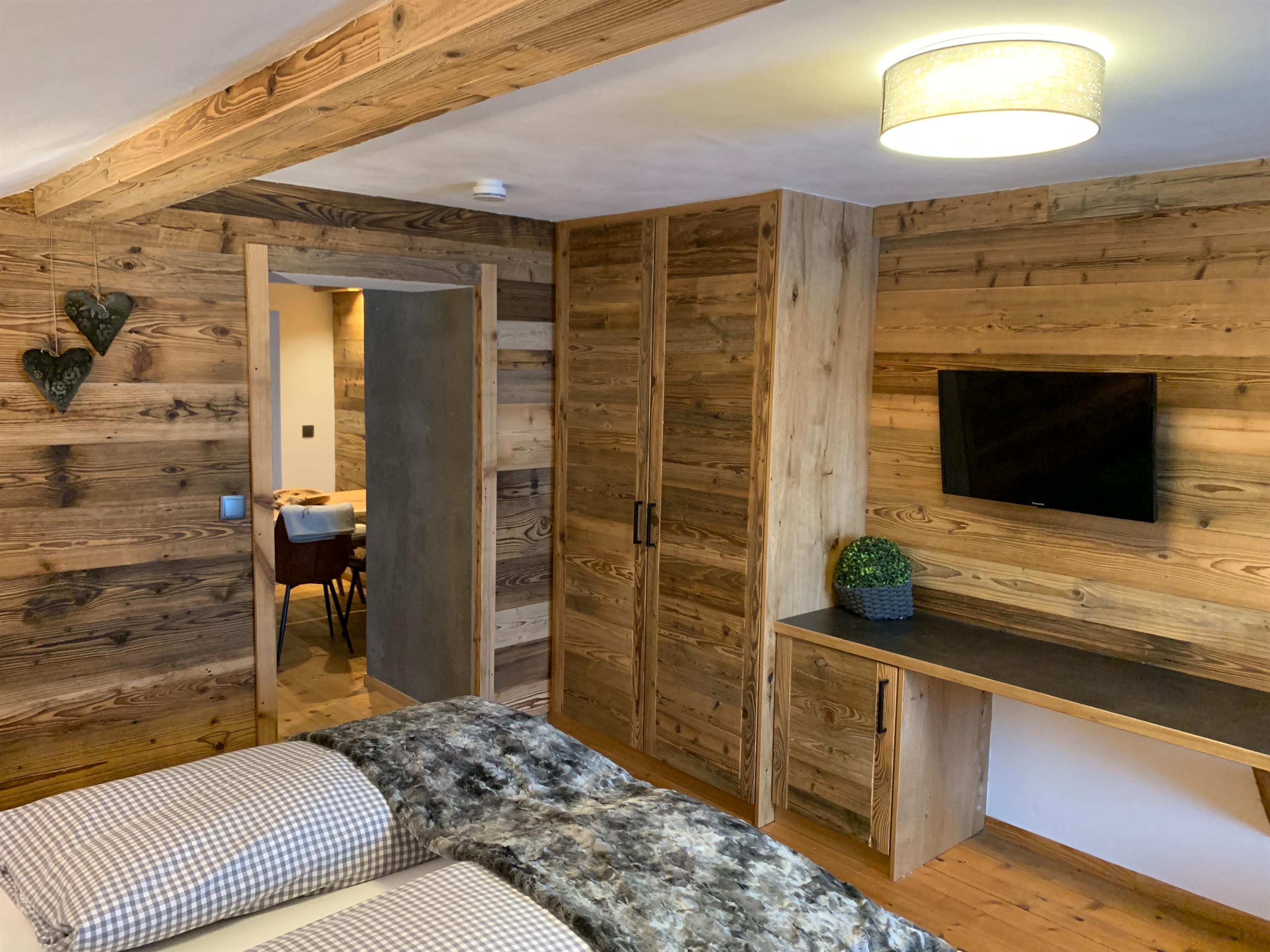 Separates Schlafzimmer mit Doppelbett (natürlich Überzogen), Infrarotkabine, Kleiderschrank, Flat-TV und Safe.