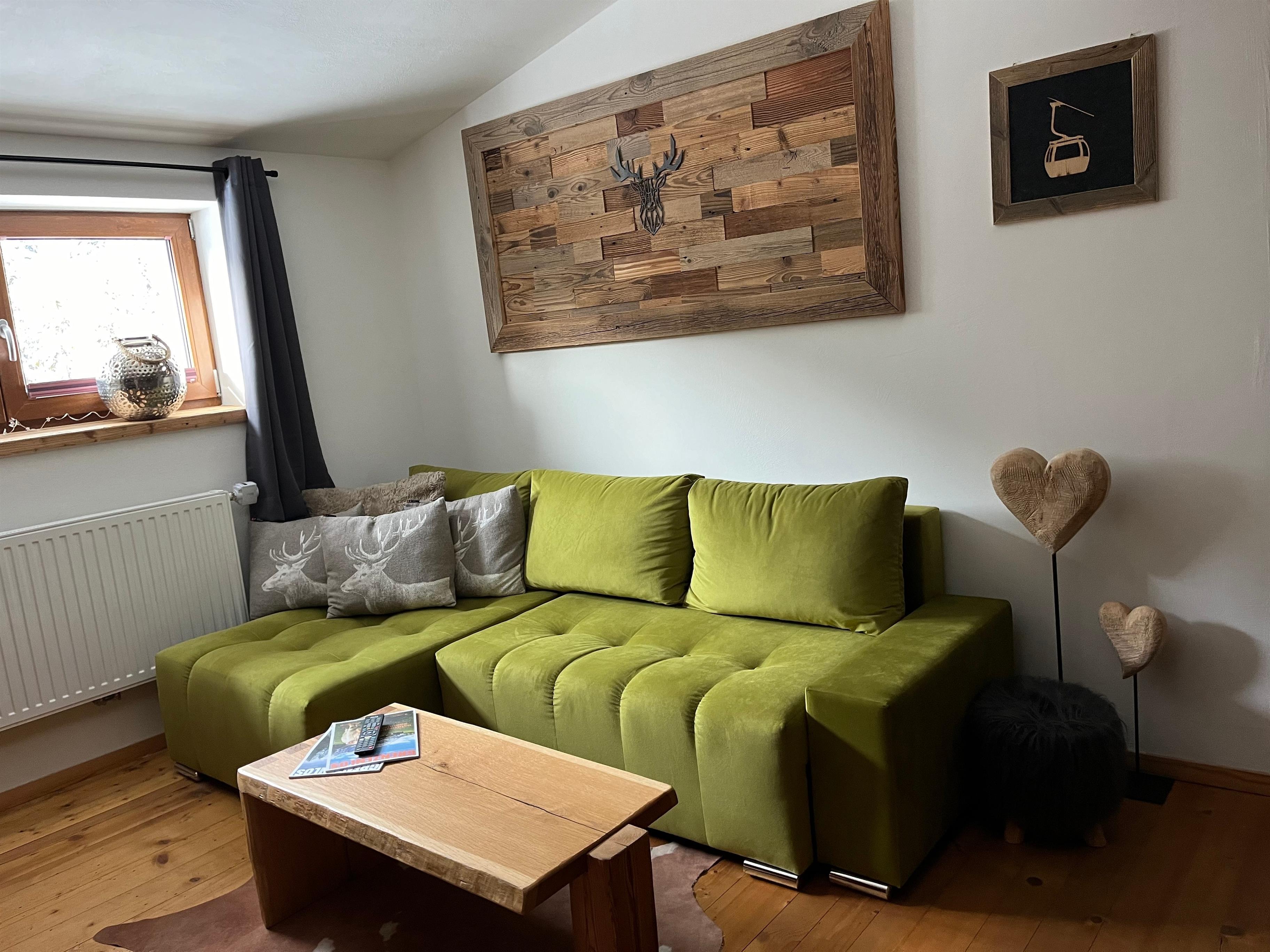 Im Wohnbereich befindet sich eine Garderobe mit großem Spiegel, ein gemütliches Schlaf Sofa ausziehbar, ein großer Esstisch und ein Flat-TV.
