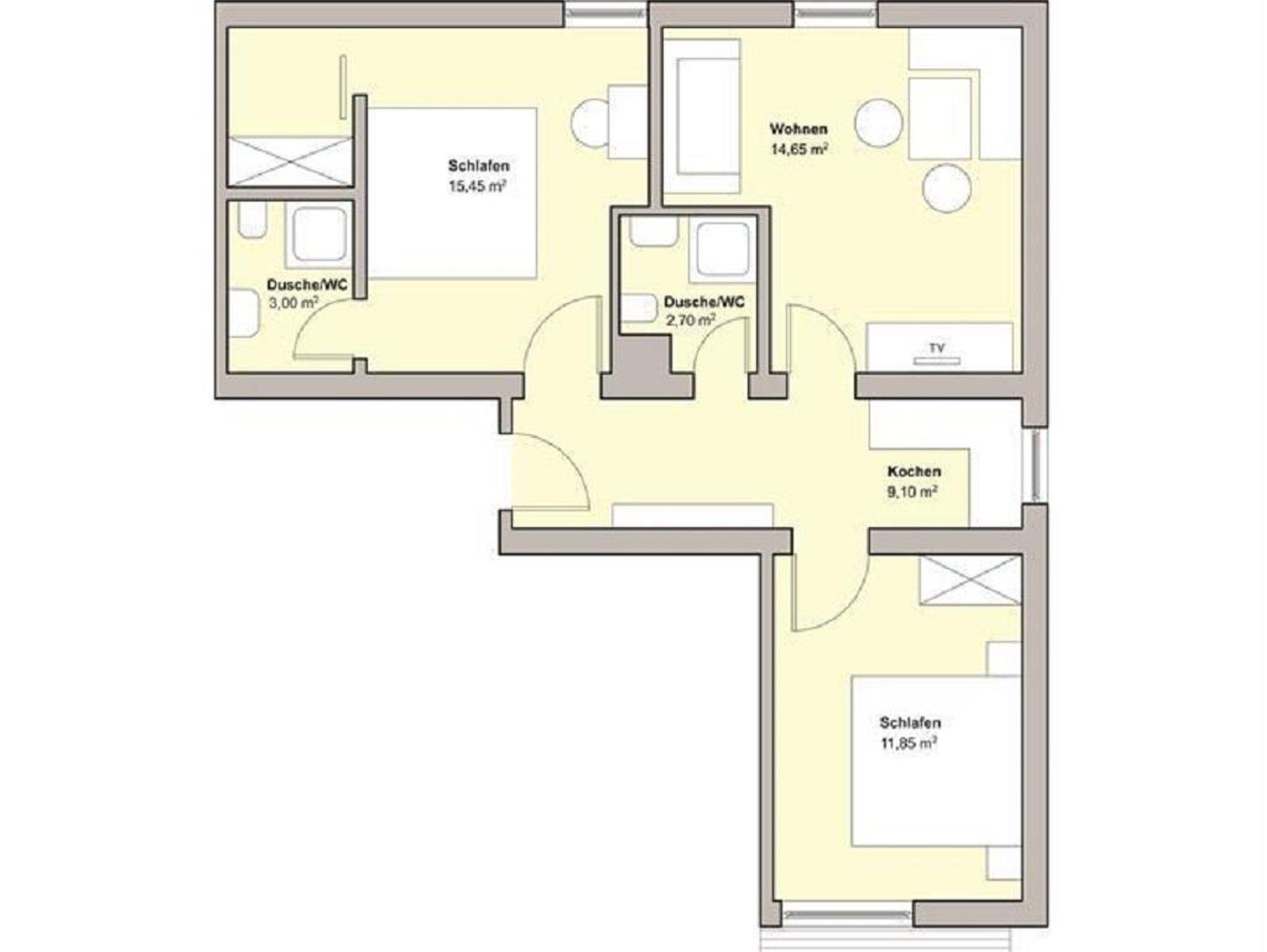 Appartement mit zwei Schlafräumen mit Doppelbett, 2x Dusche/WC, vollständige Küche und separater Wohnraum mit Schlafcouch für 1-2 Personen. Balkon mit Blick zum Wilden Kaiser und zum Hartkaiser.