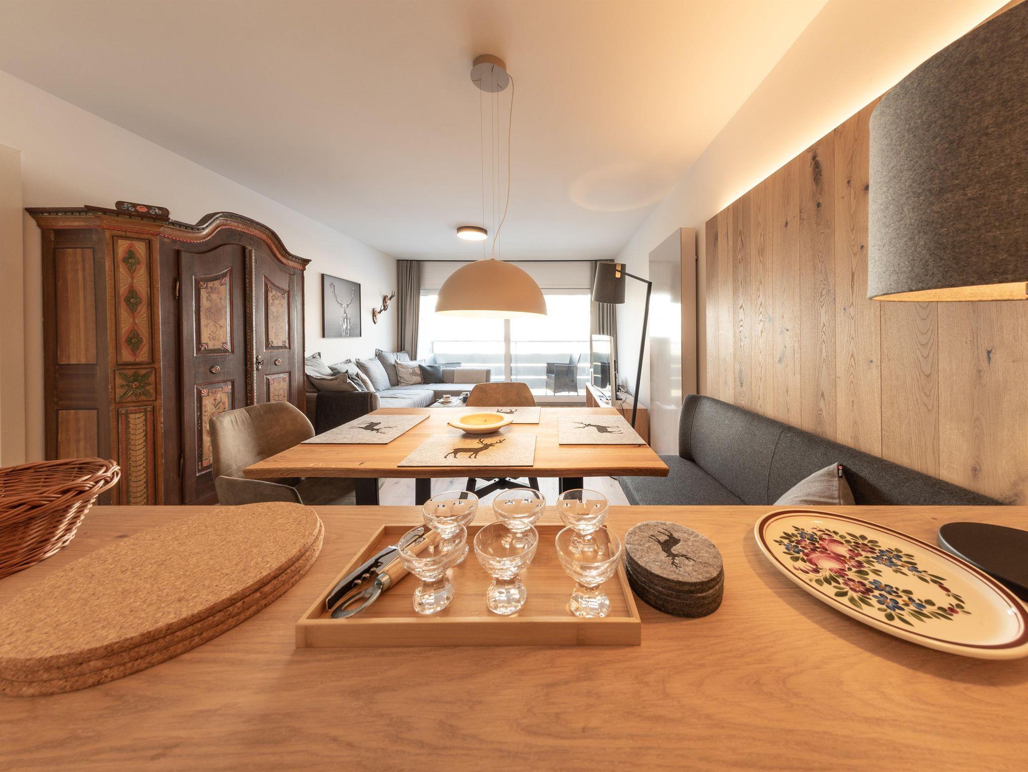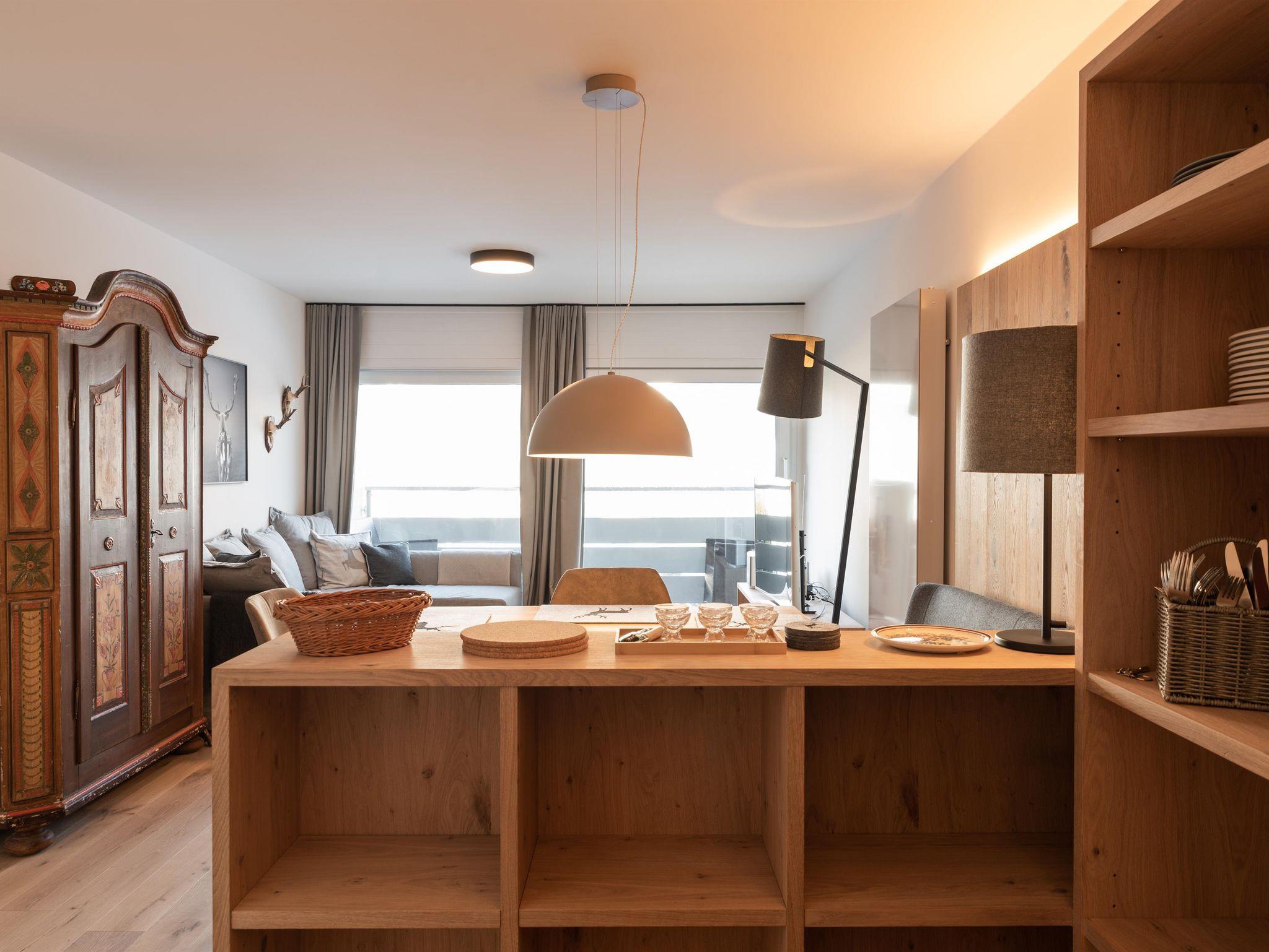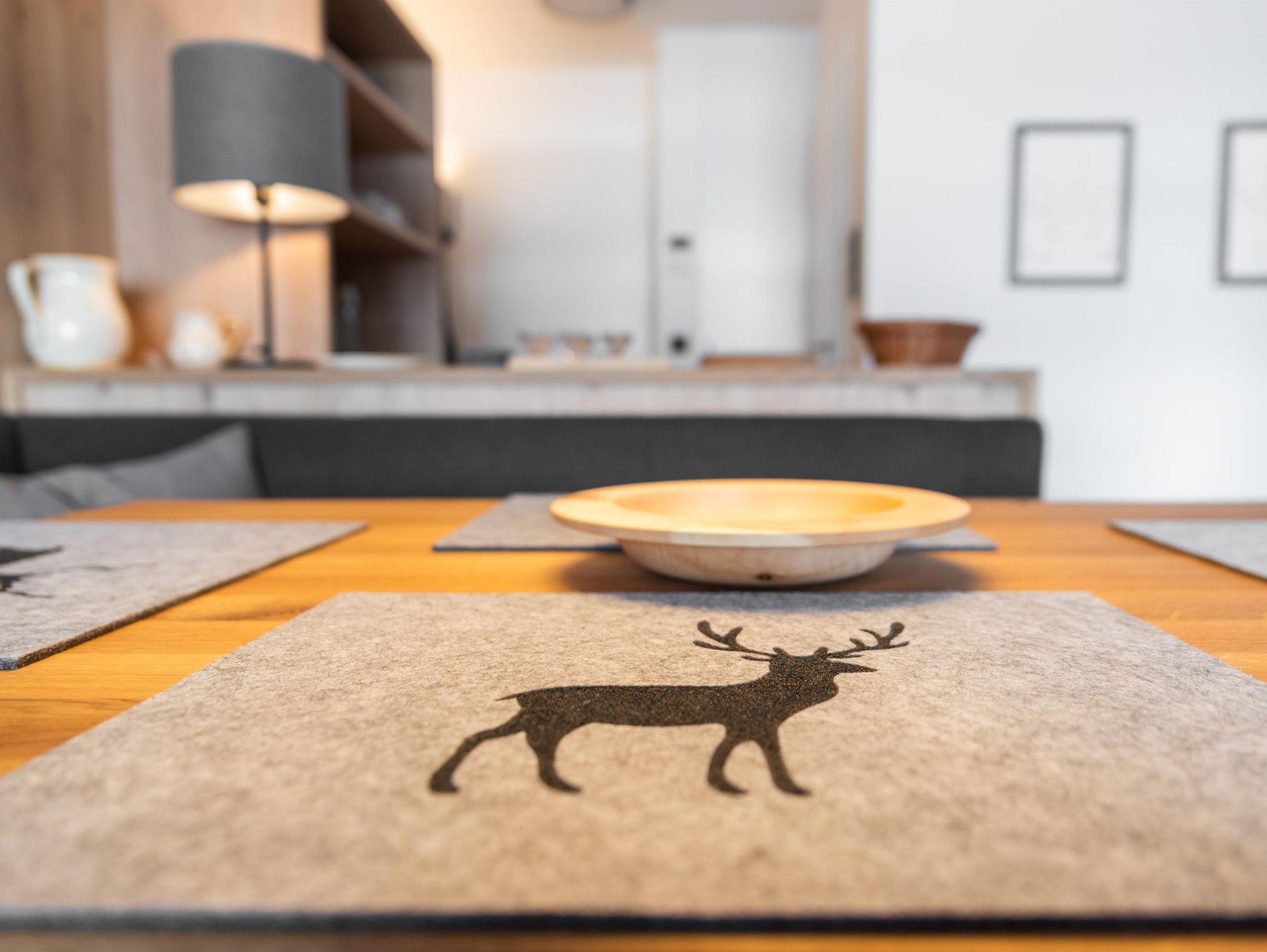 Bis Ende November 22 wurde die Wohnung komplett renoviert, mit Ausnahme vom Bad. Holzdielen wurden überall verlegt. Im Schlafzimmer gibt es jetzt einen Arbeitsplatz, der mit einem Rechner und Tastatur ausgestattet ist fürs Homeoffice; schon beim Aufwachen kann man den super Blick auf den Wilden Kaiser genießen. Im Wohnzimmer steht jetzt eine gemütliche Eckbank. Alle Möbel sind maßgefertigt von einer einheimischen Tischlerei.