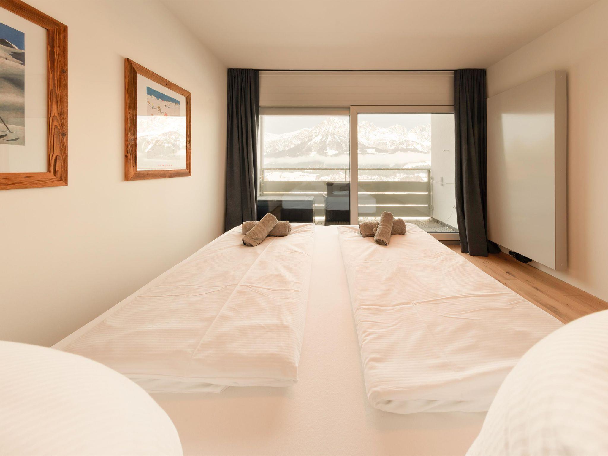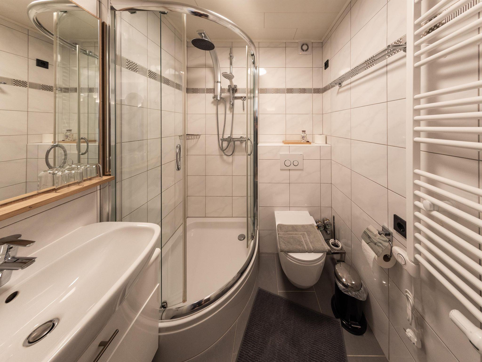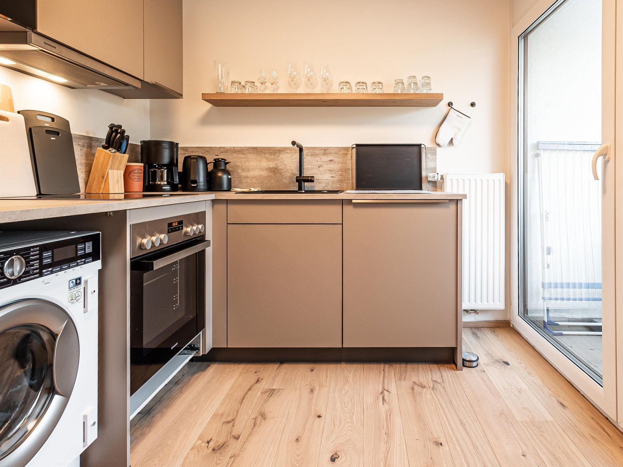 Das Apartment Alpenblick besteht aus einem Schlafzimmer, einem Wohnzimmer mit einer Schlafcouch (Liegefläche 1,40m x 2,04 m), einer Küche und einem Badezimmer mit Dusche auf insgesamt 70 qm2. Das Apartment liegt im dritten Stock des Berghofes und hat zwei Balkone mit einem phantastischen Blick auf den Wilden Kaiser und das Ellmauer Tor. Zusätzlich verfügt das Apartment über einen kleinen Westbalkon, welcher sich vor der Küche befindet und zum Sonnen ab mittags einlädt. Die Küche ist ausgestattet mit einem Backofen, einer Mikrowelle, einer Cremesso Kapselmaschine, einer Waschmaschine und ab Ende September noch zusätzlich mit einer Spülmaschine. Eine gemütliche Couch sowie der von ihr aus zu sehende, große Fernseher lädt im Wohnzimmer auf gemütliche Stunden ein. Doch eines sei im Apartment Alpenblick gesagt: das mit dem Fernsehen ist bei dem herrlichen Ausblick, welchen man auf den Wilden Kaiser hat, gar nicht so einfach - hier ist es eine wirkliche Herausforderung, dass die Augen am Bildschirm bleiben. Aus eigener Erfahrung kann gesagt werden, dass die Augen immer wieder in die malerisch-imposante Tiroler Berglandschaft abschweifen - und das, obwohl man im Apartment Alpenblick sogar Zugriff auf Unterhaltungskünstler wie Netflix und Amazon Prime hat.