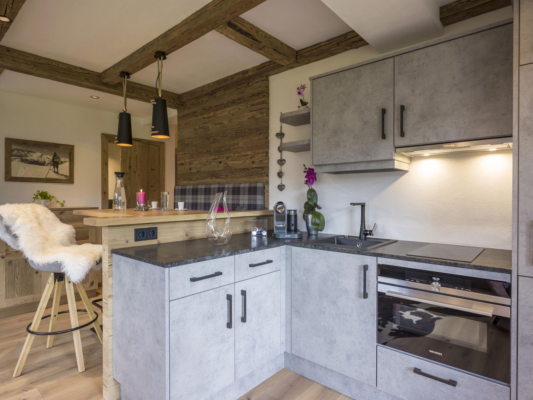 Ihr Luxus-Appartement am Wilden Kaiser. Stilvoll, elegant und charmant präsentiert sich „die Auszeit“ als ihr Urlaubsparadies in Ellmau. Mit viel Altholz und warmen Farbtönen gestaltete Stilelemente beeindrucken Sie im Appartement täglich neu. Das Boxspringbett sorgt für eine wohltuende Nacht, das großzügige Wohnzimmer für den Genuss am Tag. Die Küche ist mit Premium-Markengeräten ausgestattet, zudem sind Geschirrspüler, Mikrowelle, Backofen und ein Kühlschrank mit Gefrierfach bei uns Standard. Eine Nespresso-Maschine steht Ihnen gerne zur Verfügung. Ab einer Woche Aufenthalt bekommen Sie 10 Kapseln zum Genießen und Wohlfühlen dazu. Im neuen Bad mit Fußbodenheizung, sämtlichem Komfort und warmem Altholz wurde eine barrierefreie Dusche installiert. Die Terrasse lädt zu komfortablen Stunden in der Sonne ein - die Liegestühle und Sitzmöglichkeiten sind selbstverständlich für Sie da.