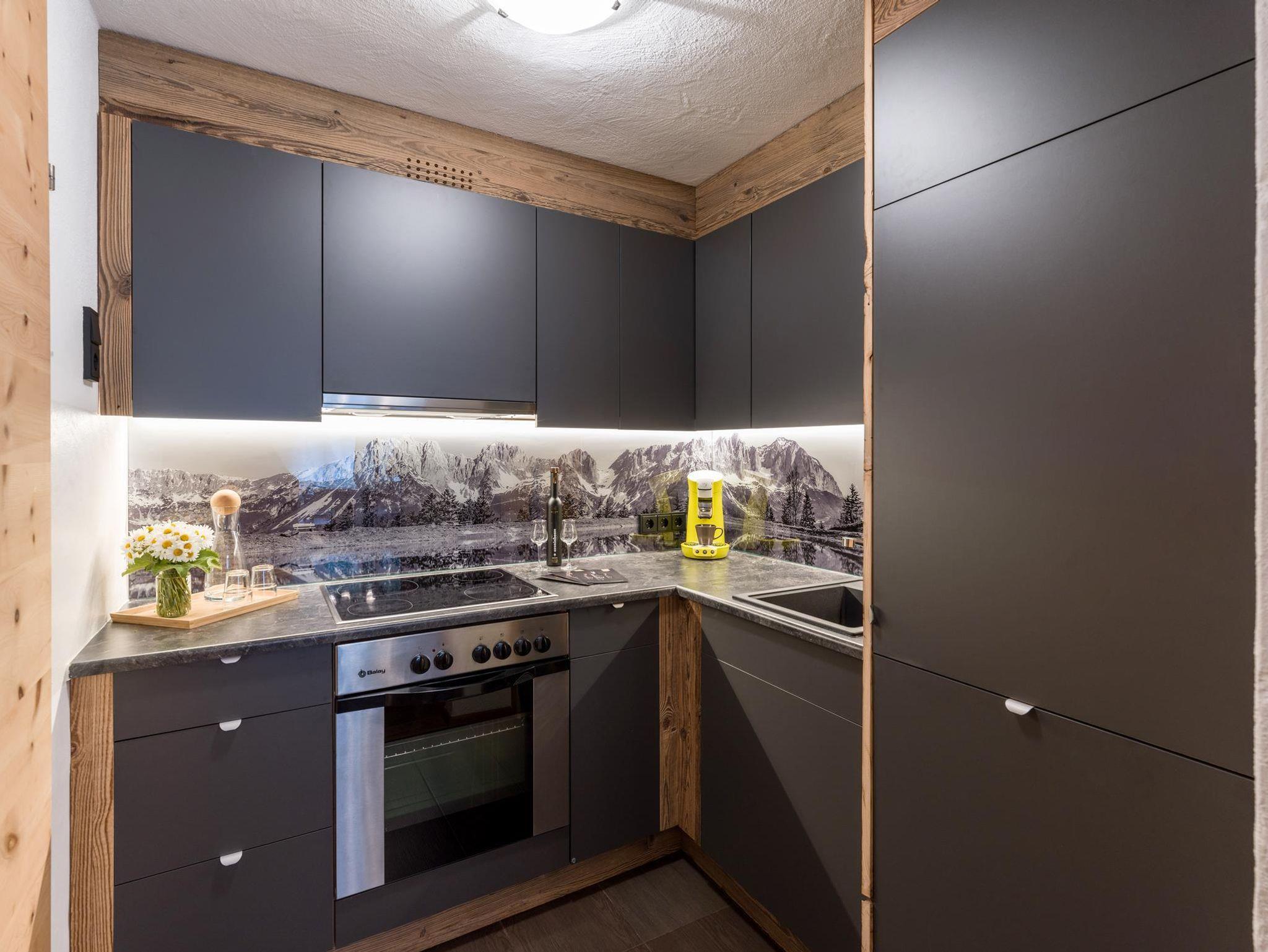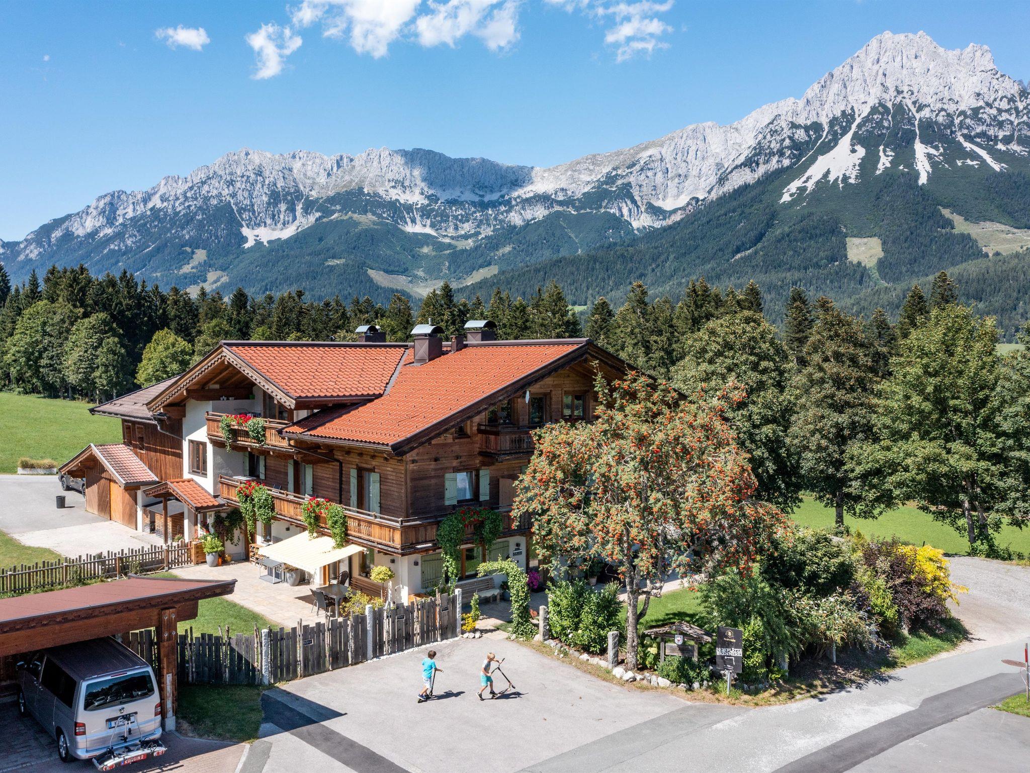 Wir bieten Ihnen ein modernes Appartement für 2-5 Personen mit eigenem Eingang; direkten Blick zum Hartkaiser; 2 getrennte Schlafräume, sämtliche Türen, Betten und Schränke wurden aus „Zirbenholz“ Hand gefertigt! Das Appartement verfügt über einen durchgehenden Balkon, komplett eingerichtete Küche, Geschirrspüler, gemütlicher Wohnraum mit einem Relaxsessel zum entspannen, Sat-TV, W-Lan, Dusche mit separatem WC. Brötchenservice im Haus.