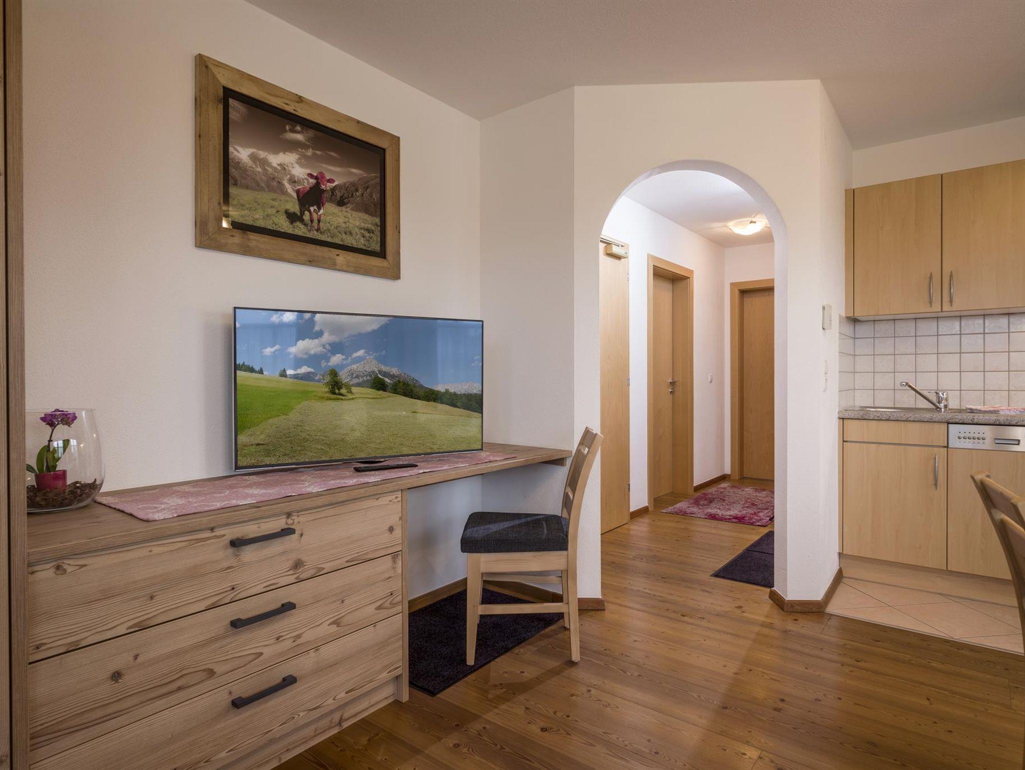 Wohnküche mit Essecke, Mikrowelle, E-Herd, Backofen, Spülmaschine, Kabel-Flat-TV, Radio, CD-Player, Telefon, W-Lan-Internet, Safe, Doppelbettcouch. Ein Schlafzimmer mit Dusche/WC, zweites Schlafzimmer mit Schreibtisch. Bad/WC: Das Appartement verfügt über ein zweites Bad und ein separates WC Ein Balkon auf der Nordseite mit herrlichem Blick zum Wilden Kaiser und auf den Golfplatz, ein Balkon auf der Südseite Für jedes Appartement steht ein Garagenplatz zur Verfügung Skikeller mit Schuhheizung