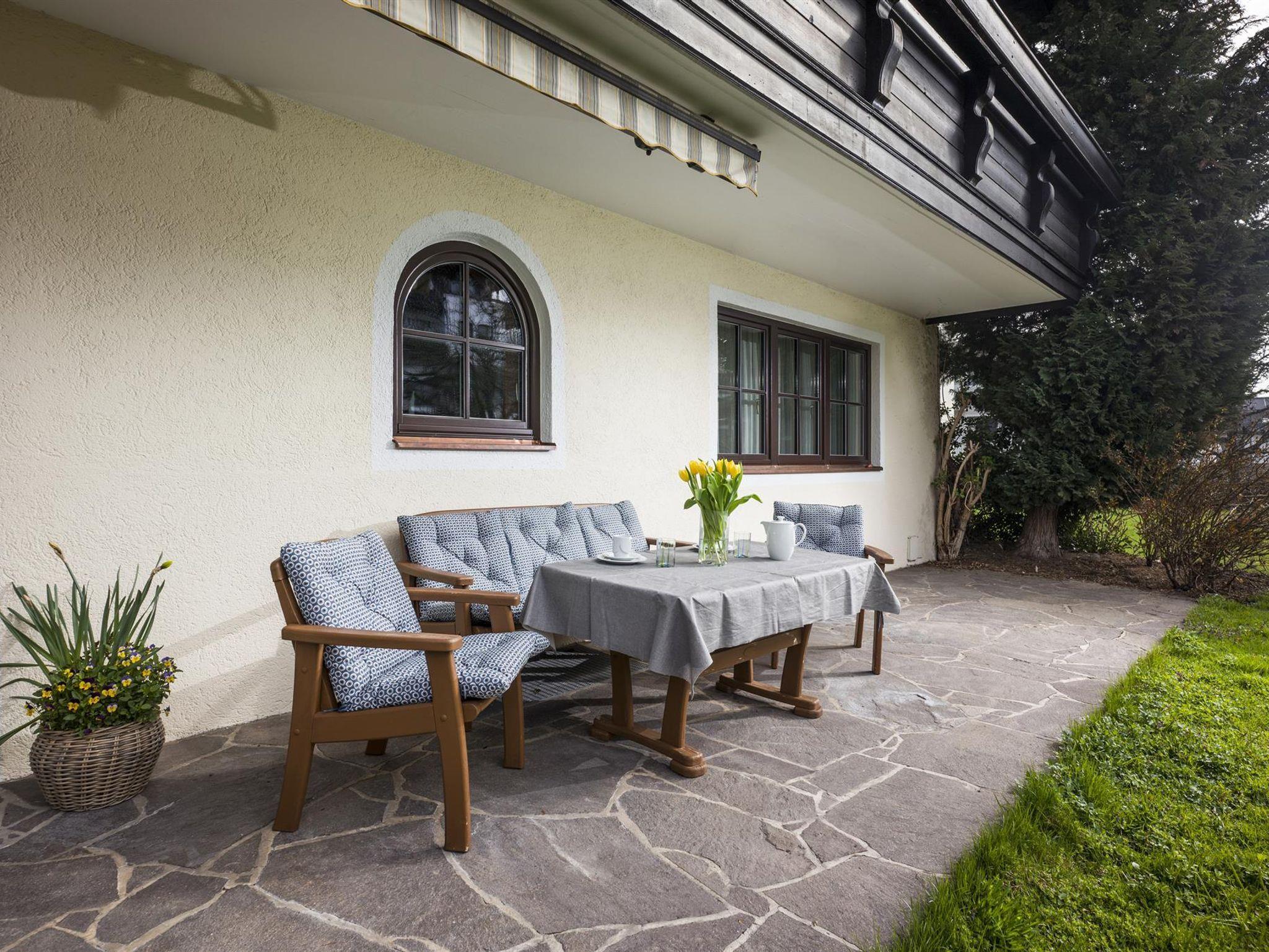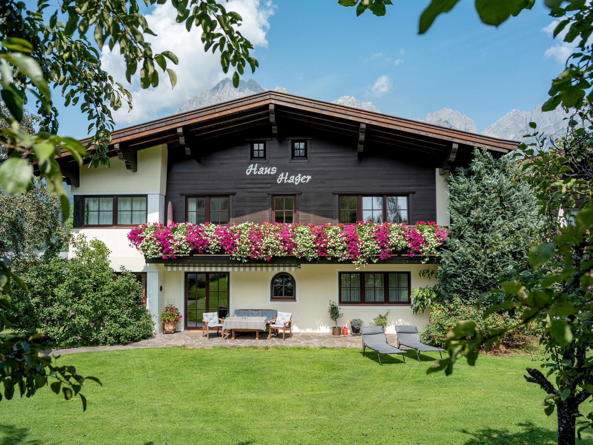 Genießen Sie den schönen Ausblick auf den Wilden Kaiser und den großen Garten, der allen Gästen des Hauses zur Verfügung steht.