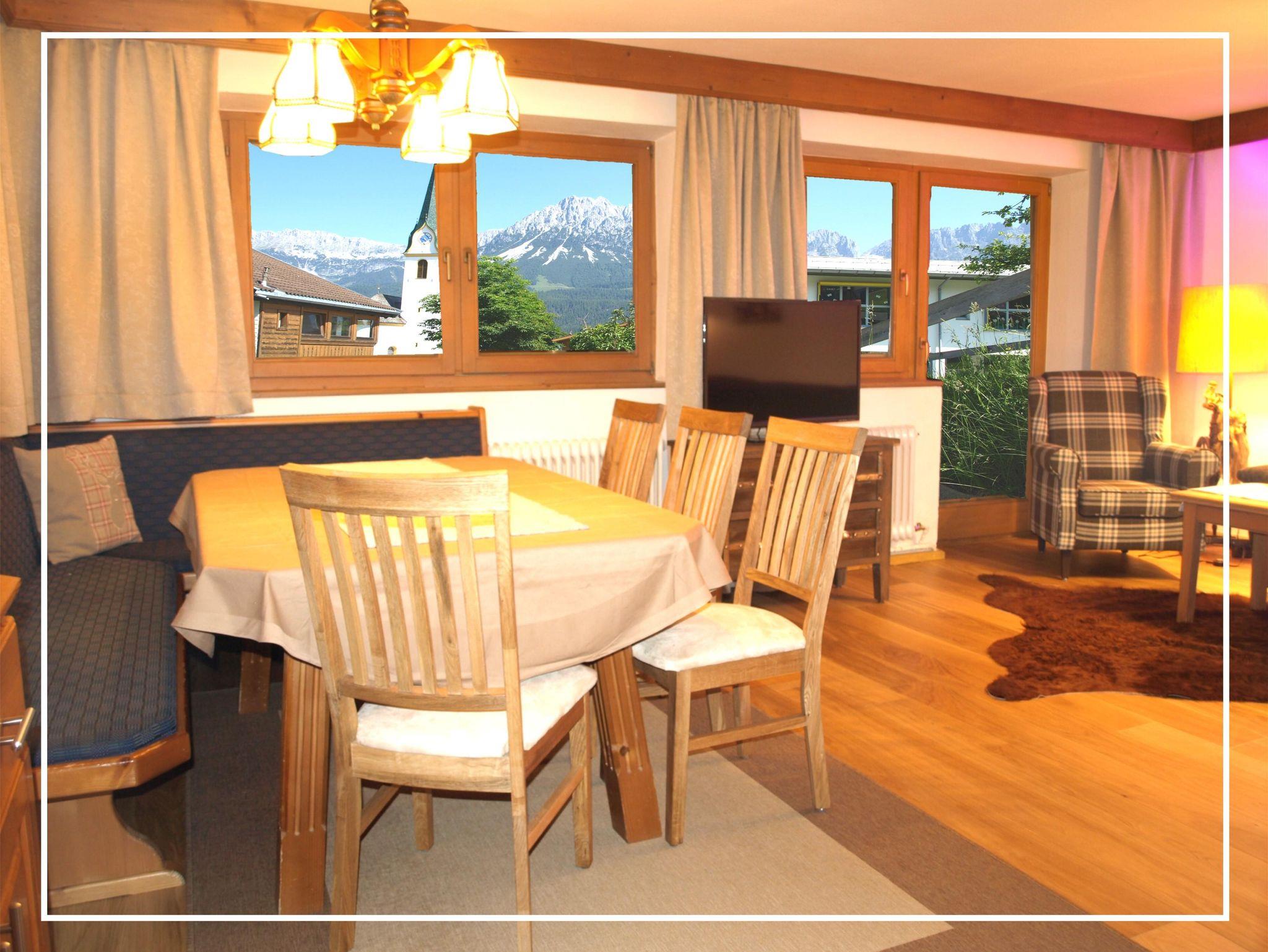mit drei separaten Schlafzimmern, mit zwei Bäder mit Dusche/WC/ein WC separat, großer Wohn- und Essraum mit Eckbank, Sofalandschaft, großer Fernseher, kostenloses W-Lan und Terrasse mit Blick zum Wilden Kaiser,