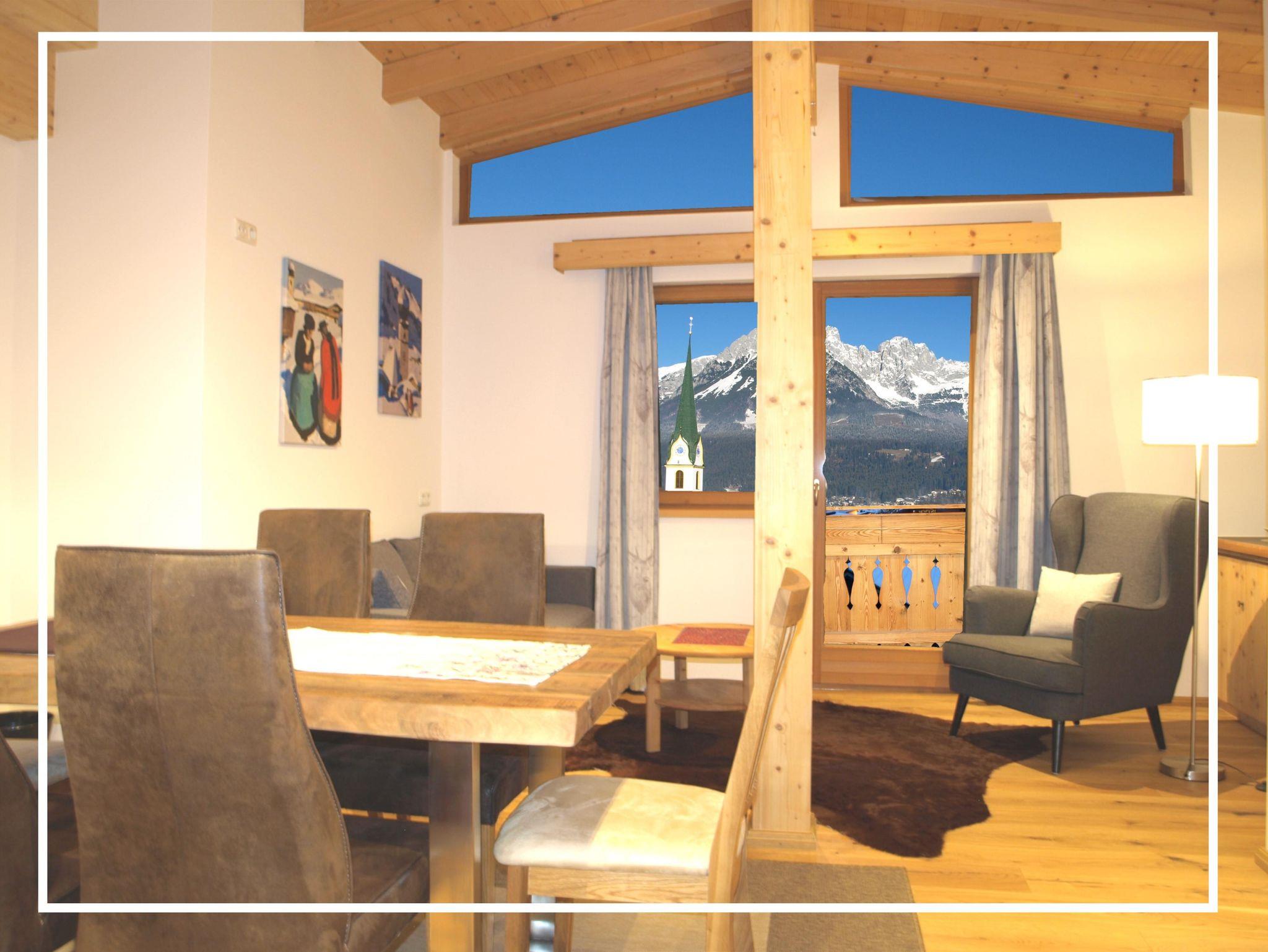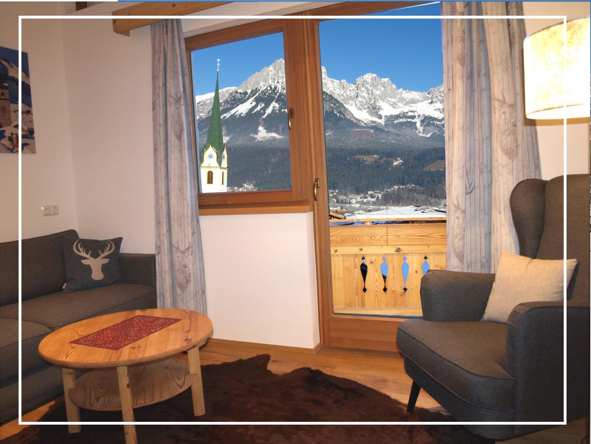 Vom Appartement aus hat man eine tolle Aussicht auf den Wilden Kaiser. Man ist schnell in der Ortsmitte, wo es alles mögliche gibt.
