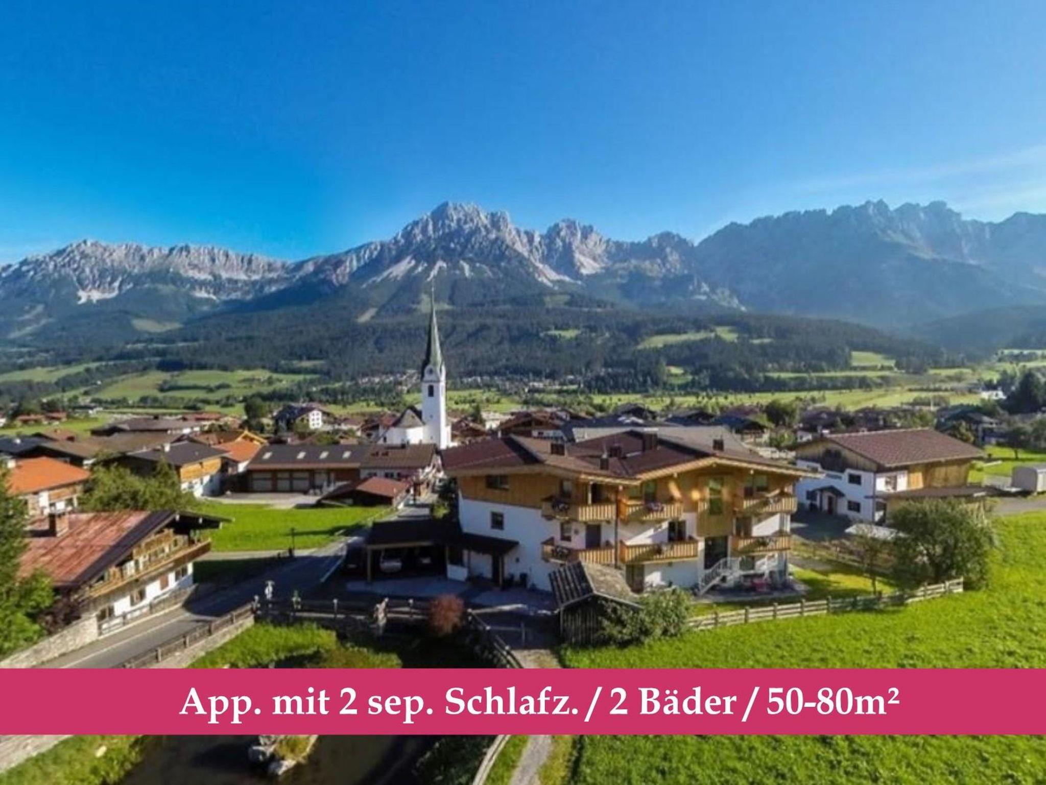 *Ihr Urlaubs-Zuhause daheim am Wilden Kaiser..... mit: neuwertigen Landhauswohnungen je 50 - 80m², mit jeweils zwei sep. Schlafzimmer, zwei Bäder und Balkon