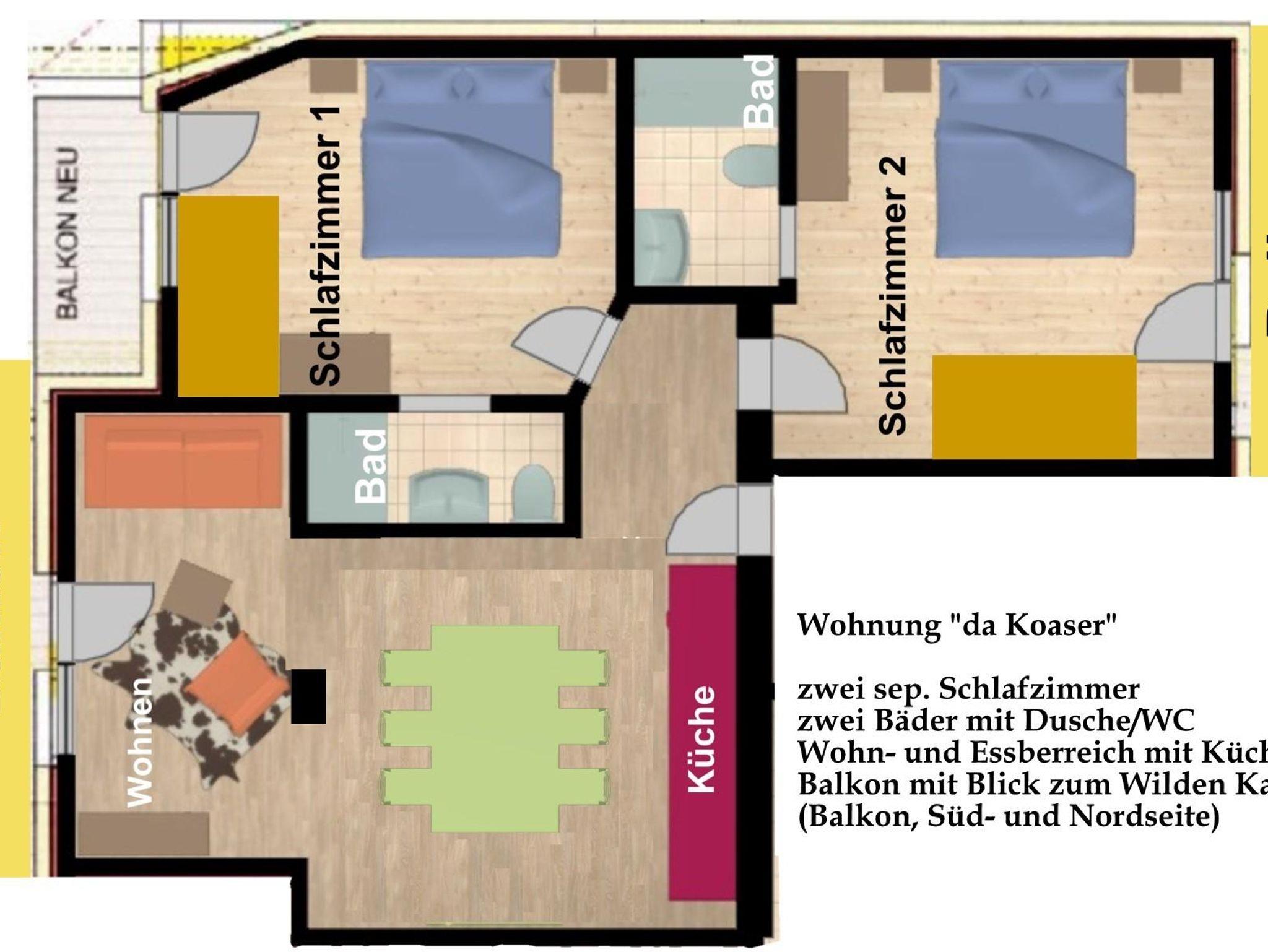 "Apartment "da Koaser" 75m² " , wij hebben genoten in dit appartement, allemaal ruim en prima ( keuken, eettafel, zithoek, balkons, slaapkamers, douche/toilet) , goed geregeld met sleutelkluis, mooie uitzichten. Geen lift aanwezig maar dat was voor ons geen probleem. Lekker dichtbij het centrum. En voldoende parkeerplekken.