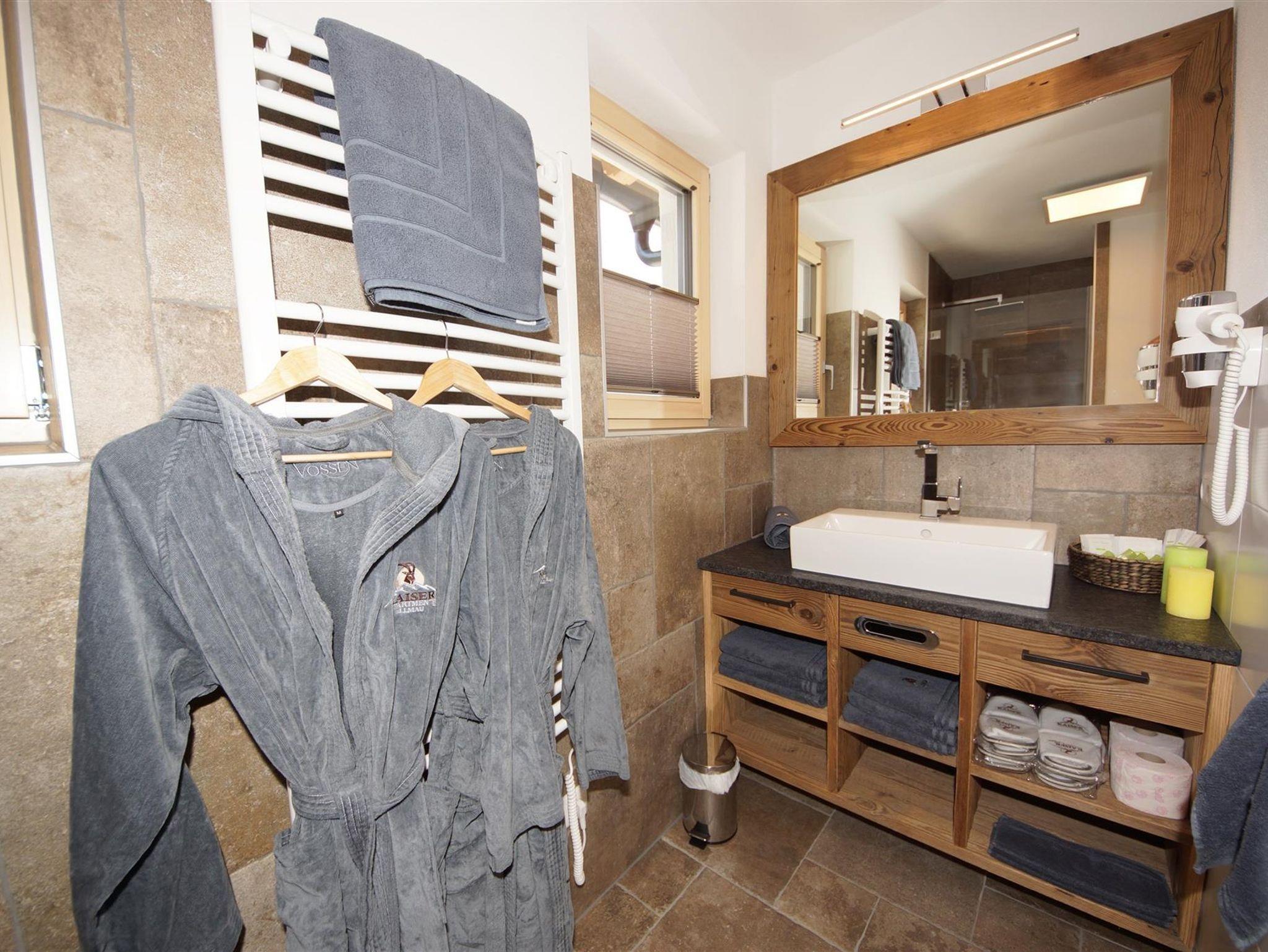 Ein Schlafzimmer mit Blick auf den Wilden Kaiser. Das andere Schlafzimmer hat ein Stockbett, ideal für Kinder. Ein Bad mit Dusche/WC.