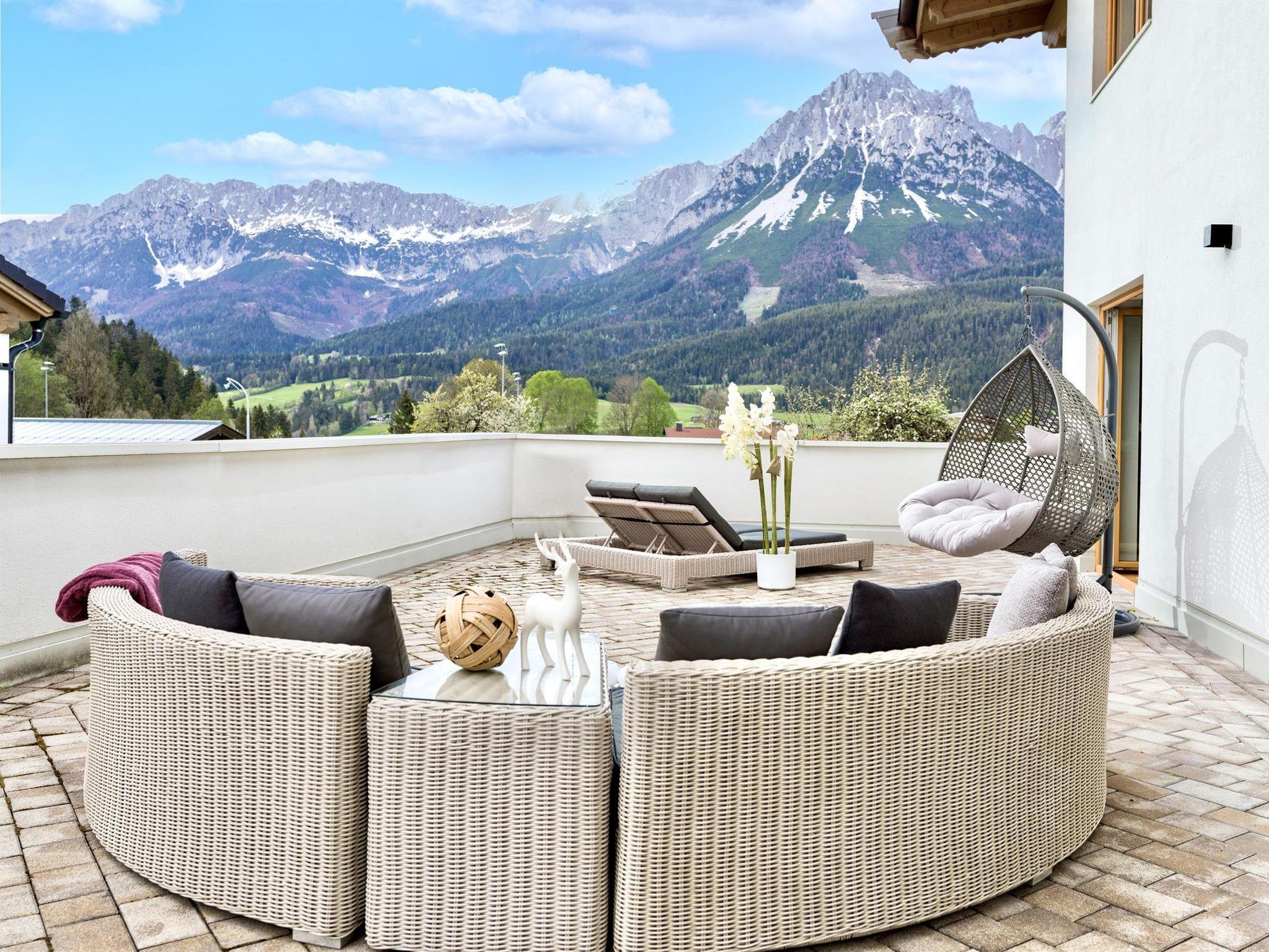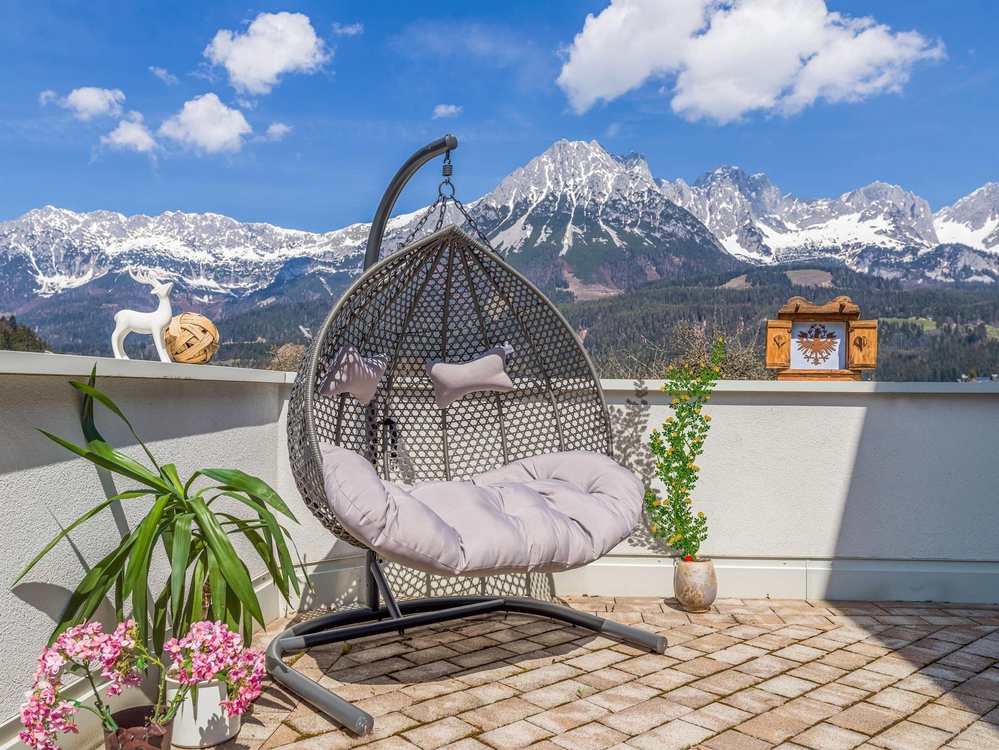 Vor dem Appartementhaus entfaltet sich ein Ausblick, der seinesgleichen sucht: Weite Wiesen dehnen sich vor Ihnen aus, und der Wilde Kaiser erhebt sich majestätisch wie ein lebendiges Panorama in den Himmel. In erster Reihe zur Natur spüren Sie die kraftvolle Präsenz der Berge und genießen einen Anblick, der jeden Moment besonders macht. Hier beginnt die Schönheit der Alpen direkt vor Ihrer Tür.