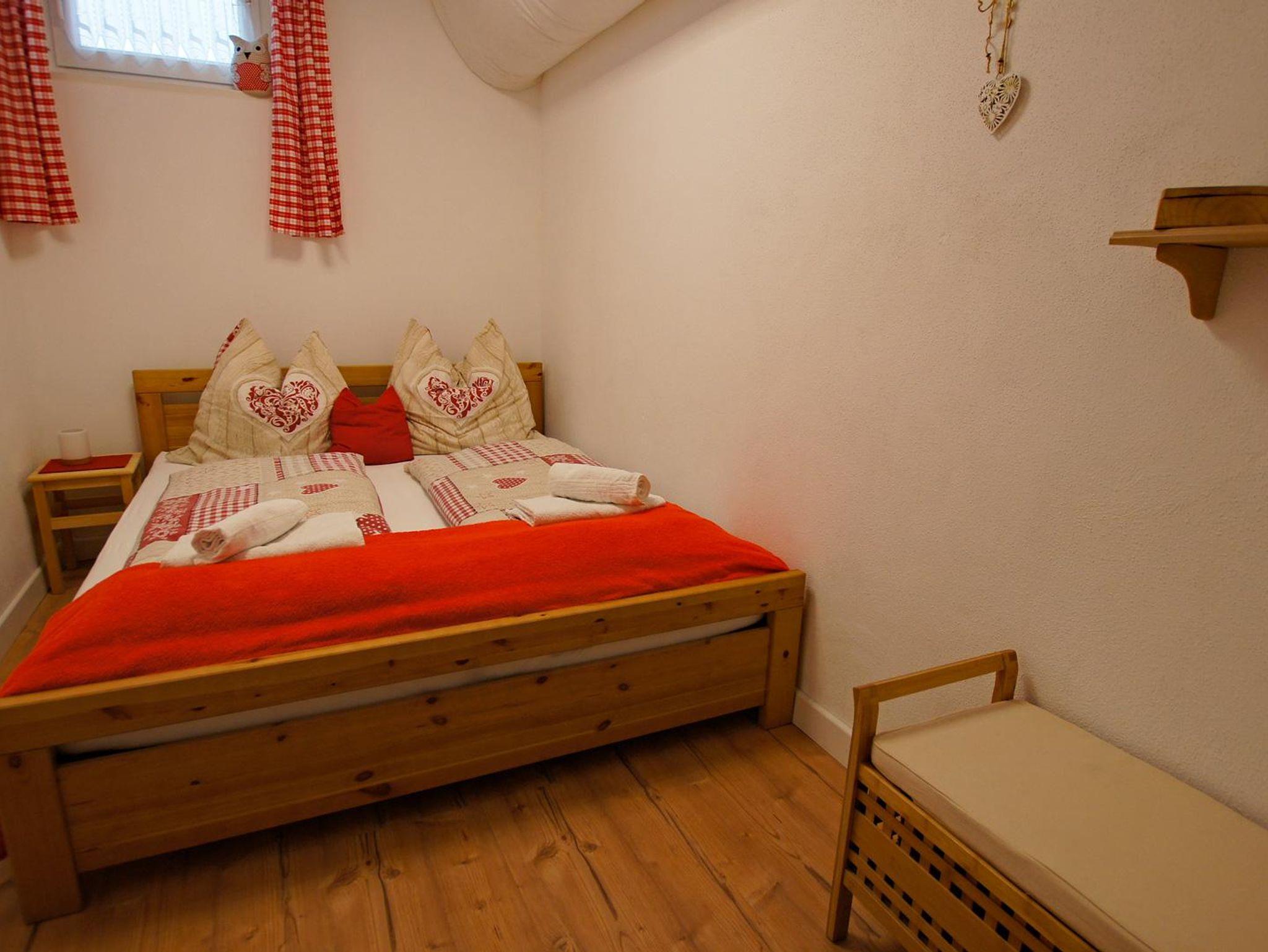 Gemütlich im Landhausstil eingerichtetes Appartement mit privater Terrasse - ideal für 3 Personen. Wohnraum mit Esstisch, Sofa mit Flat-TV, kleine Kochnische mit Kaffeemaschine, Kühl-/Gefrierschrank, Kochfeld und Minibackofen. Bad mit Dusche, WC und Fön sowie zwei kleine Schlafzimmer, eines mit Doppelbett und eines mit Einzelbett. Aufgrund der Hanglage liegen die Schlafzimmer im Souterrain.