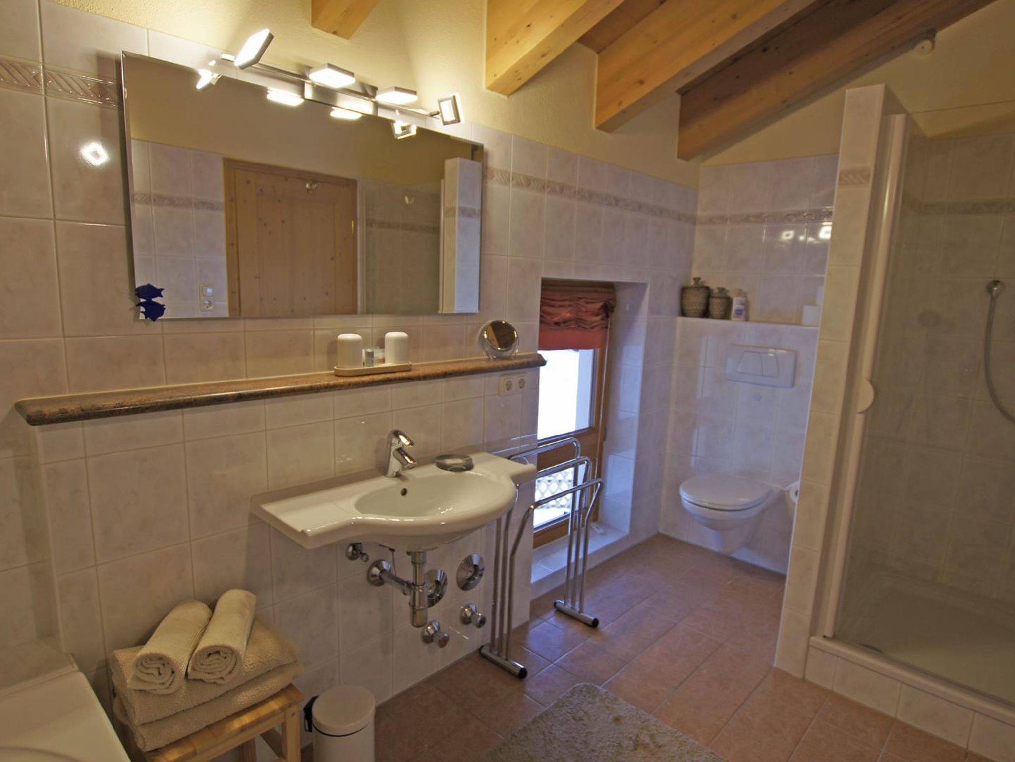 Komfortables Bad mit Badewanne, Dusche und WC, separates Gäste-WC.