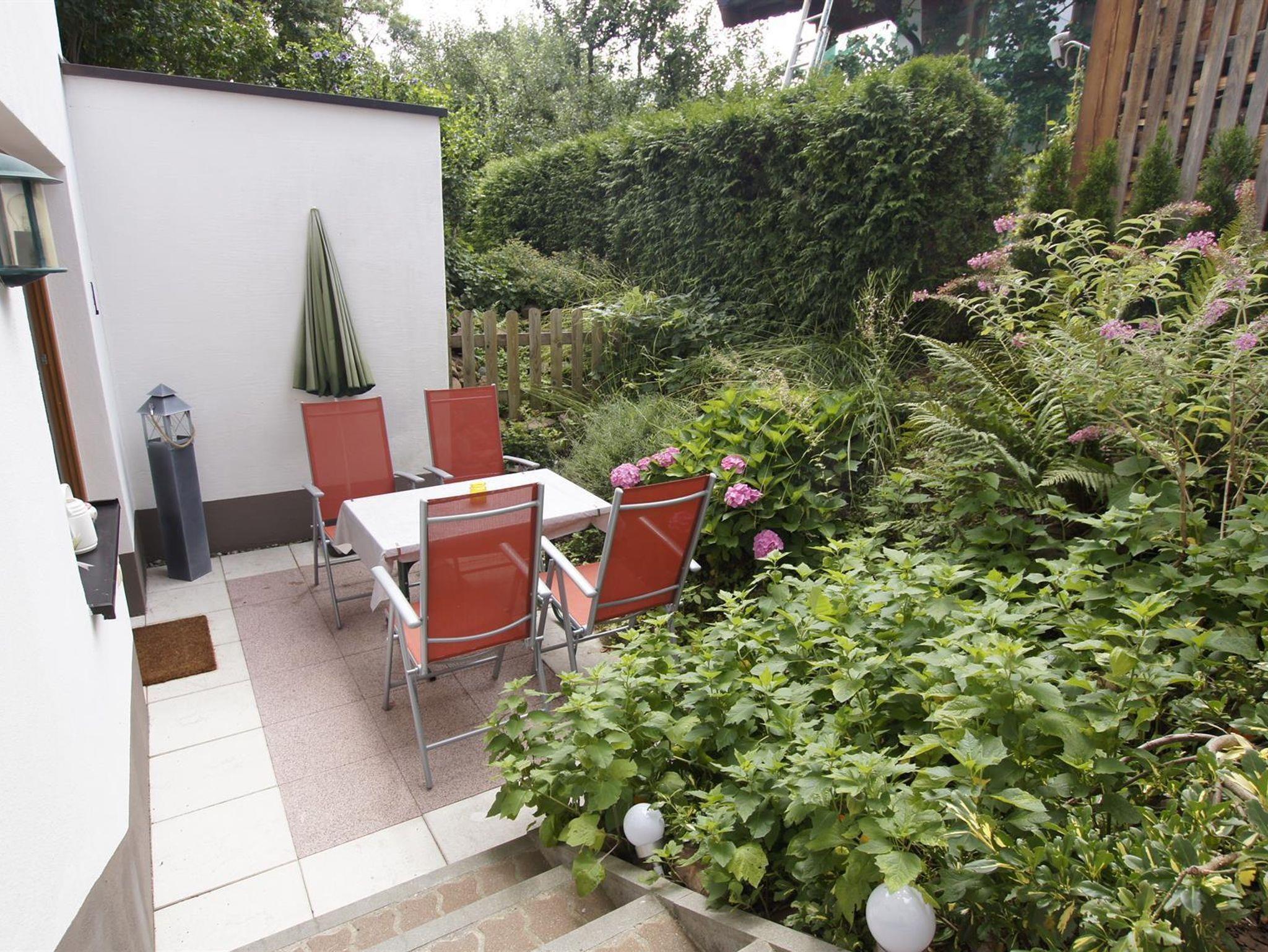 Eigener (kontaktloser) Eingang und private Süd-Loggia mit Gartenmöbeln.
