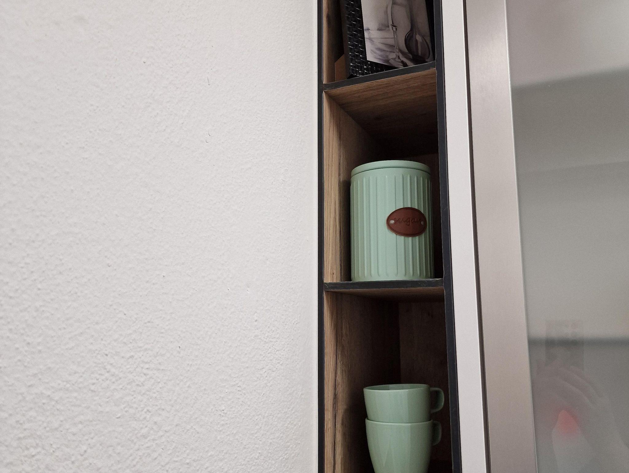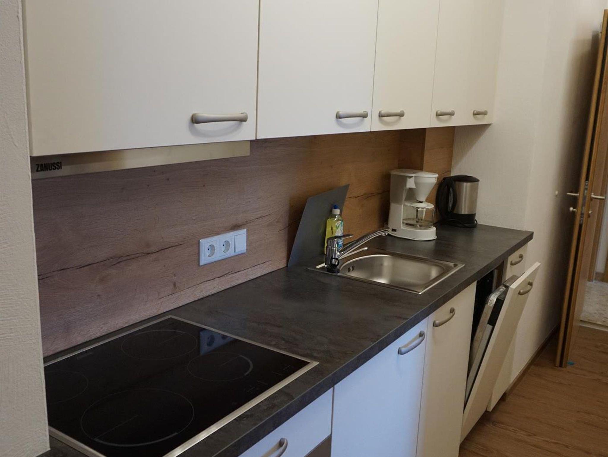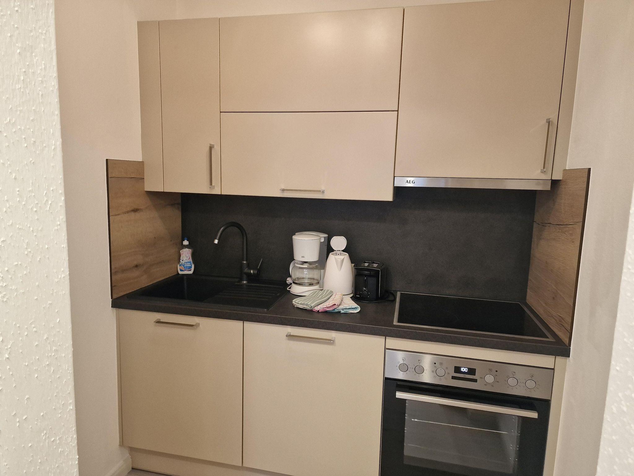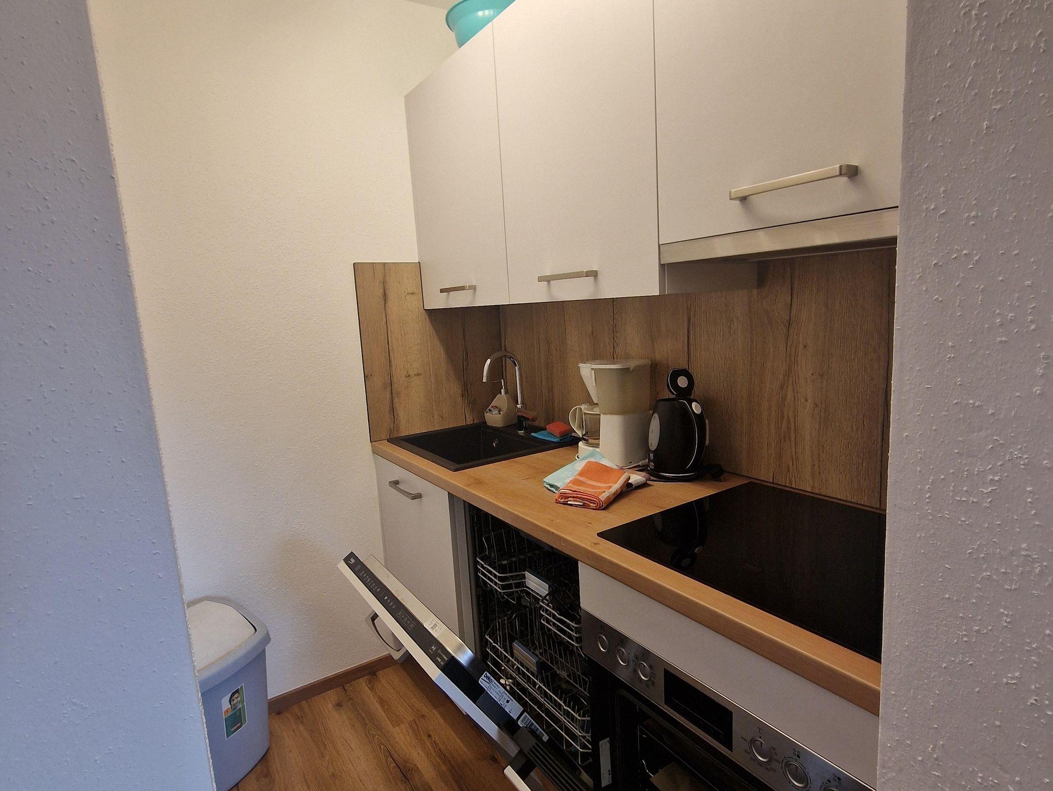 Die Küche ist mit Herd, Ceranfeld, Geschirrspüler, Kühlschrank mit Gefrierfach, Kaffeemaschine, Wasserkocher, Toaster und Geschirr ausgestattet.